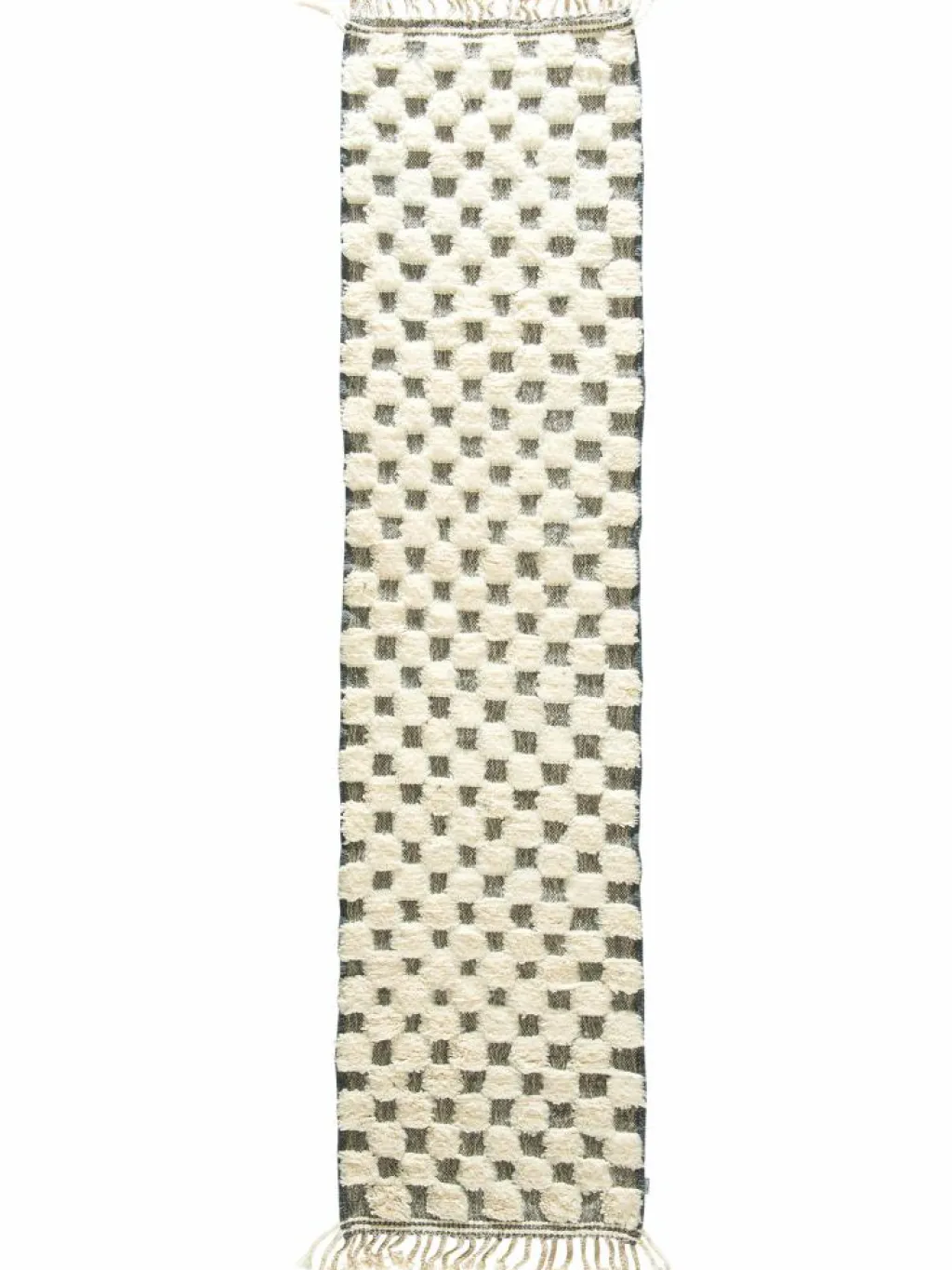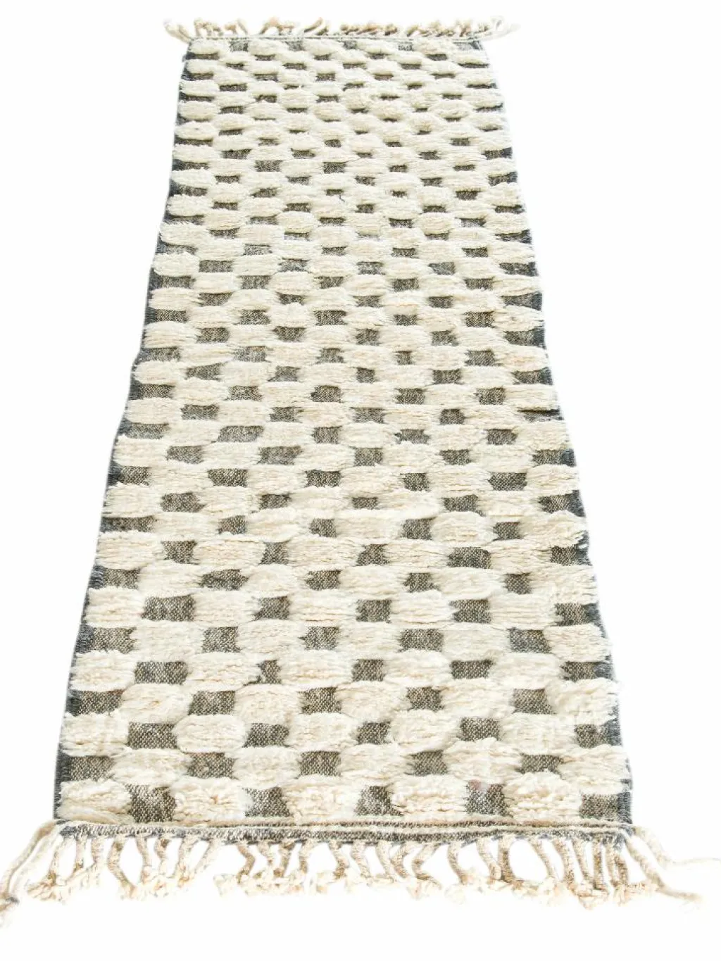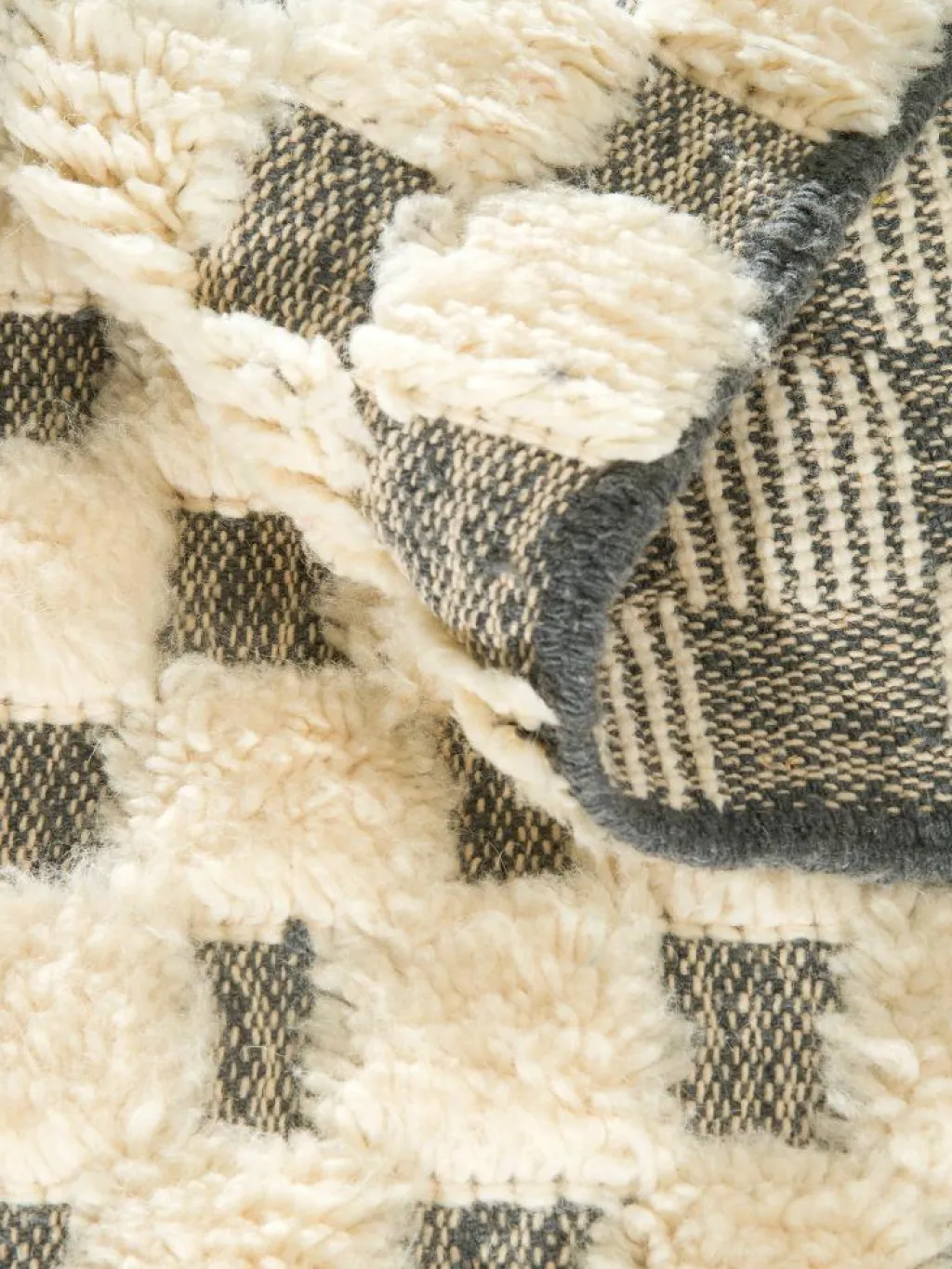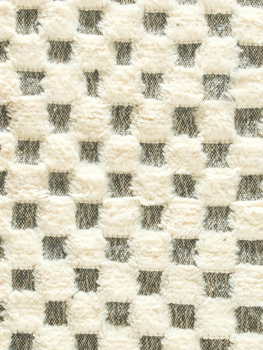 . Die Teppiche sind fast immer weißgrundig und zeichnen sich durch schwarze Zickzack-, Gitter- oder Rauten-Muster sowie einem wohnlich-zotteligen Flor aus. Kaum eine andere Teppichprovenienz passt mit ihren ursprünglichen nomadischen Designs besser in einen minimalistischen Wohnstil. Wie viele andere Nomadenteppiche auch, wurden dieBeni Ourain