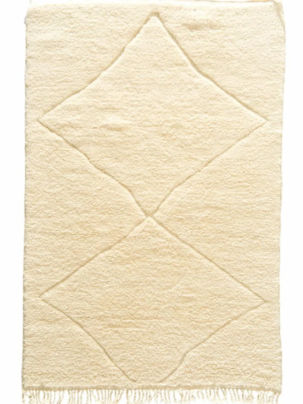 . Die Teppiche sind fast immer weißgrundig und zeichnen sich durch schwarze Zickzack-, Gitter- oder Rauten-Muster sowie einem wohnlich-zotteligen Flor aus. Kaum eine andere Teppichprovenienz passt mit ihren ursprünglichen nomadischen Designs besser in einen minimalistischen Wohnstil. Wie viele andere Nomadenteppiche auch, wurden dieBeni Ourain