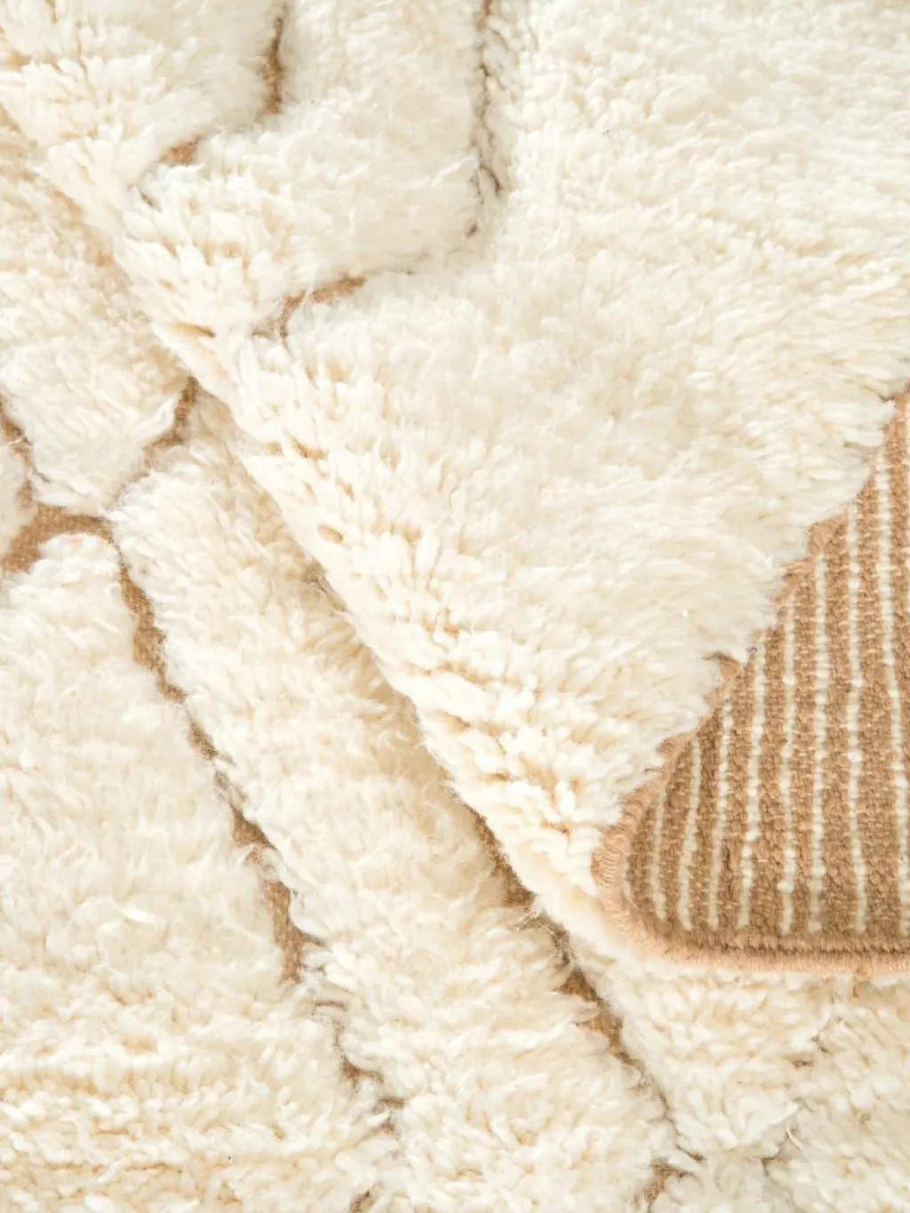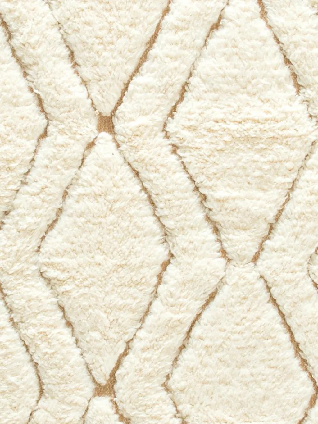 . Die Teppiche sind fast immer weißgrundig und zeichnen sich durch schwarze Zickzack-, Gitter- oder Rauten-Muster sowie einem wohnlich-zotteligen Flor aus. Kaum eine andere Teppichprovenienz passt mit ihren ursprünglichen nomadischen Designs besser in einen minimalistischen Wohnstil. Wie viele andere Nomadenteppiche auch, wurden dieBeni Ourain