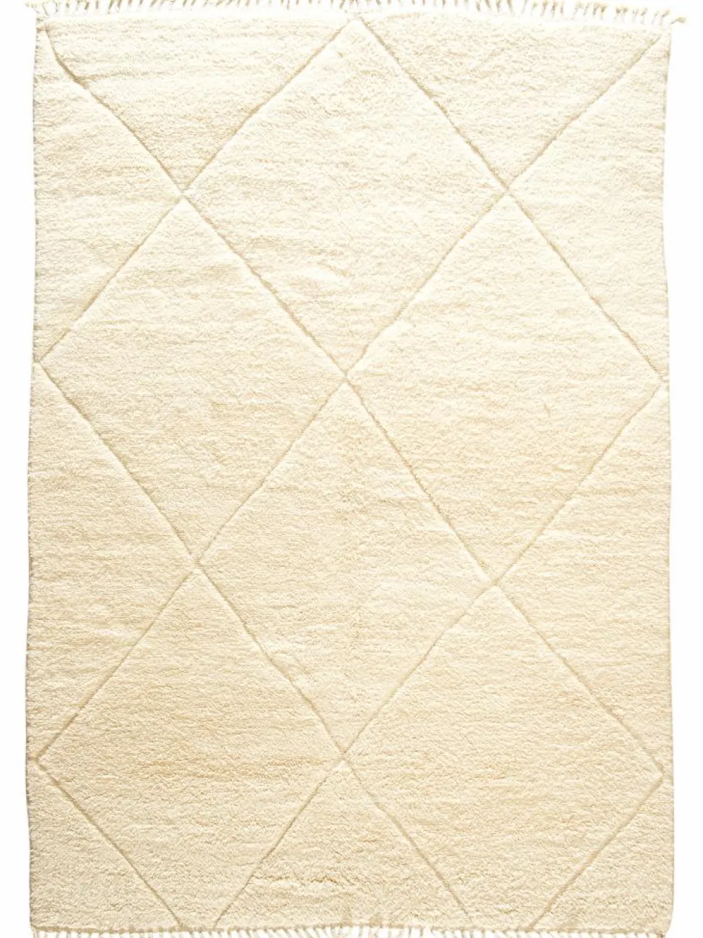 . Die Teppiche sind fast immer weißgrundig und zeichnen sich durch schwarze Zickzack-, Gitter- oder Rauten-Muster sowie einem wohnlich-zotteligen Flor aus. Kaum eine andere Teppichprovenienz passt mit ihren ursprünglichen nomadischen Designs besser in einen minimalistischen Wohnstil. Wie viele andere Nomadenteppiche auch, wurden dieBeni Ourain
