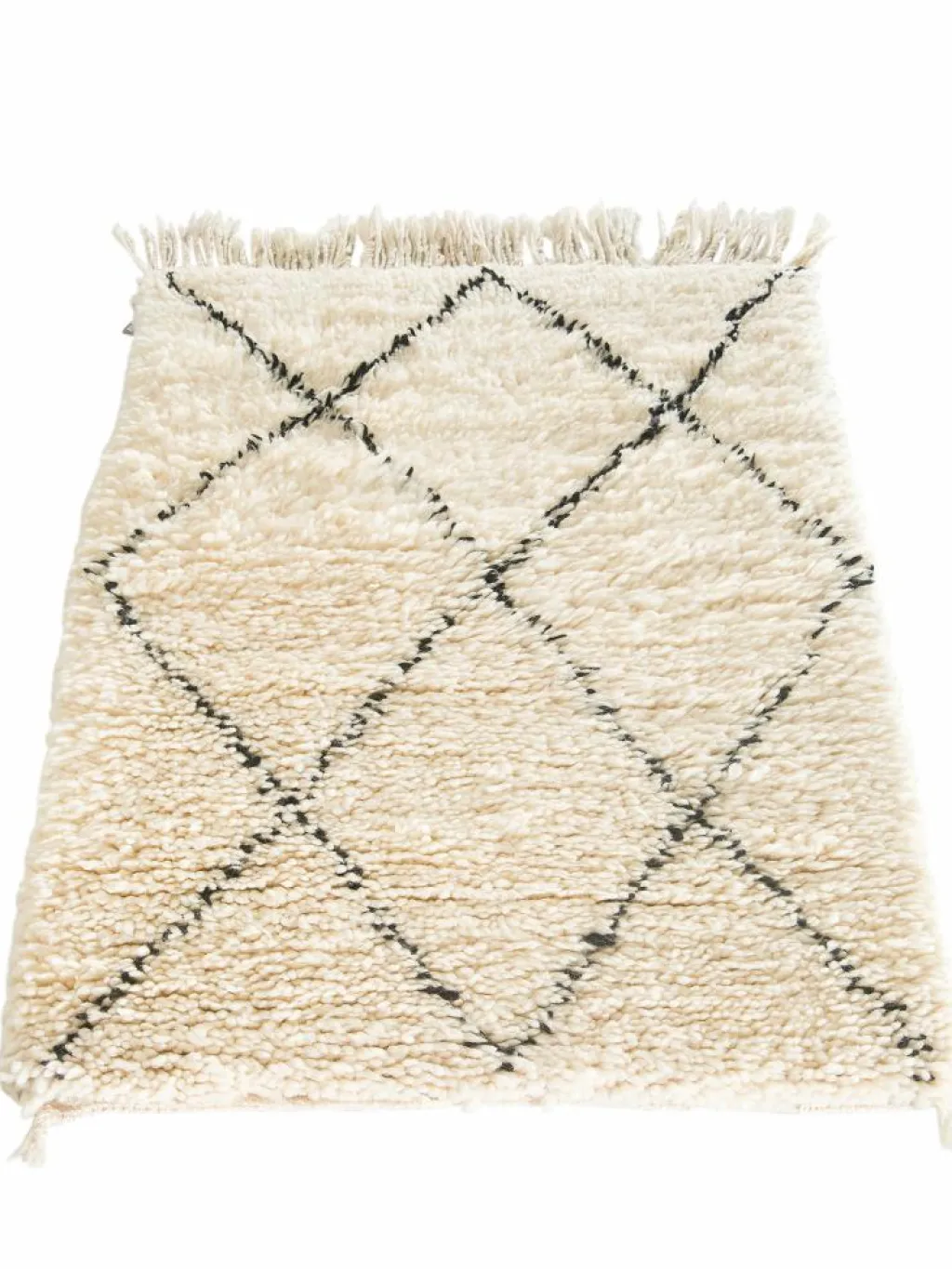. Die Teppiche sind fast immer weißgrundig und zeichnen sich durch schwarze Zickzack-, Gitter- oder Rauten-Muster sowie einem wohnlich-zotteligen Flor aus. Kaum eine andere Teppichprovenienz passt mit ihren ursprünglichen nomadischen Designs besser in einen minimalistischen Wohnstil. Wie viele andere Nomadenteppiche auch, wurden dieBeni Ourain