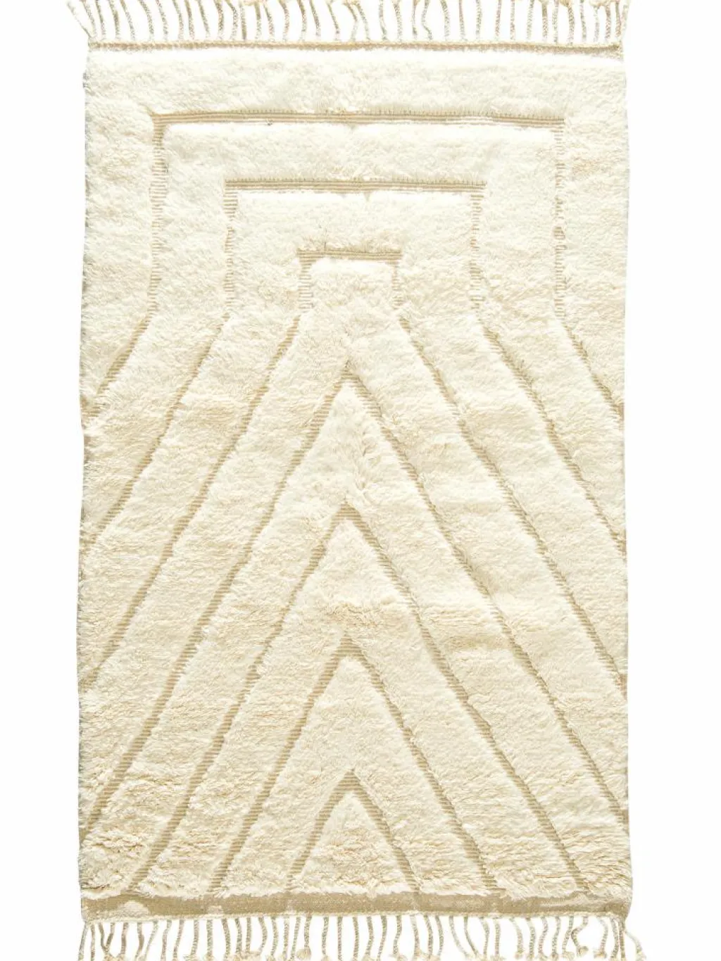 . Die Teppiche sind fast immer weißgrundig und zeichnen sich durch schwarze Zickzack-, Gitter- oder Rauten-Muster sowie einem wohnlich-zotteligen Flor aus. Kaum eine andere Teppichprovenienz passt mit ihren ursprünglichen nomadischen Designs besser in einen minimalistischen Wohnstil. Wie viele andere Nomadenteppiche auch, wurden dieBeni Ourain