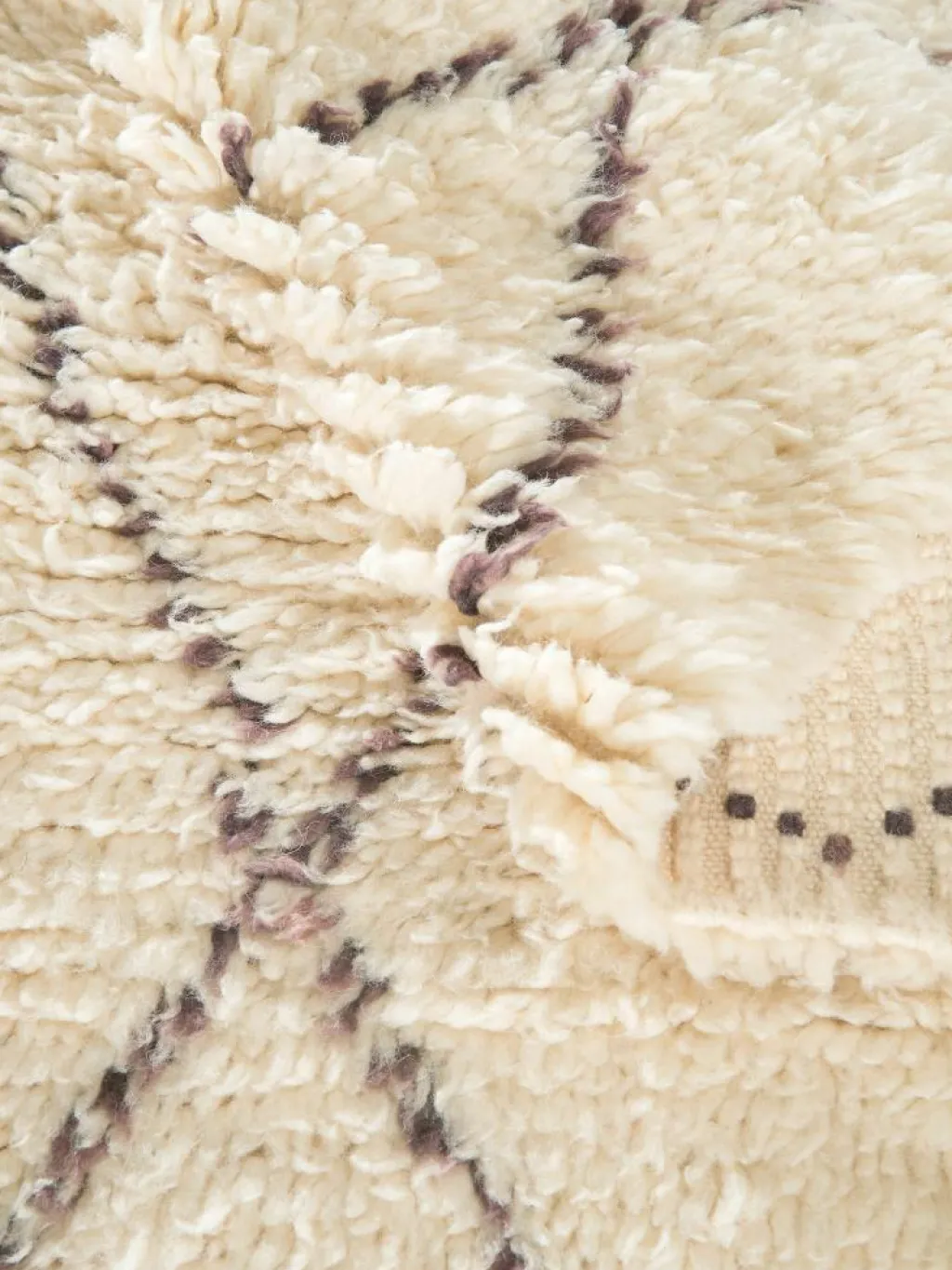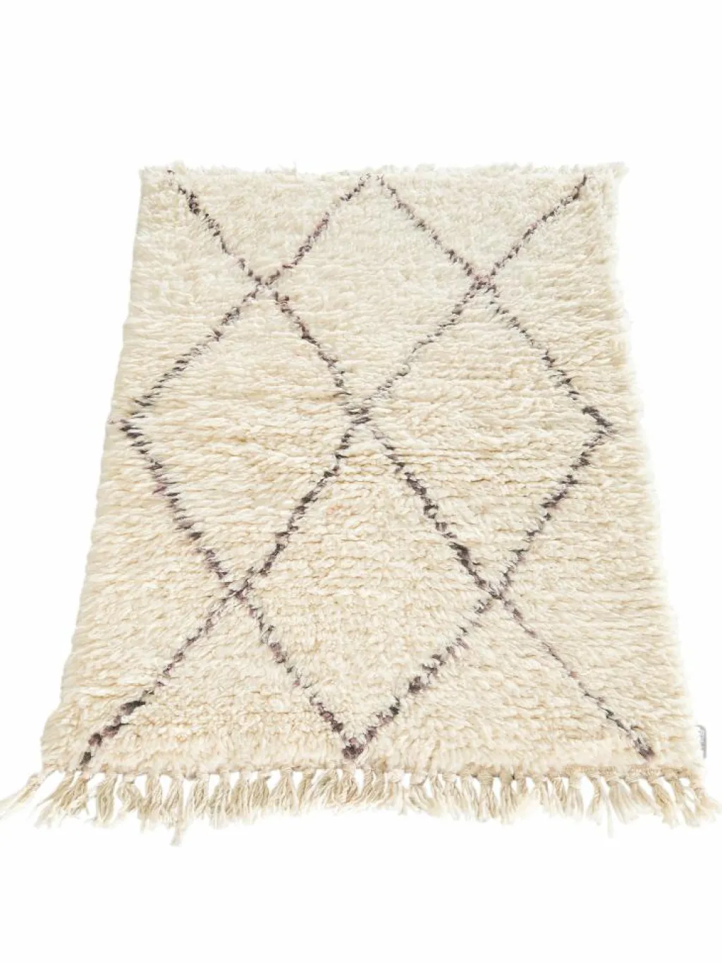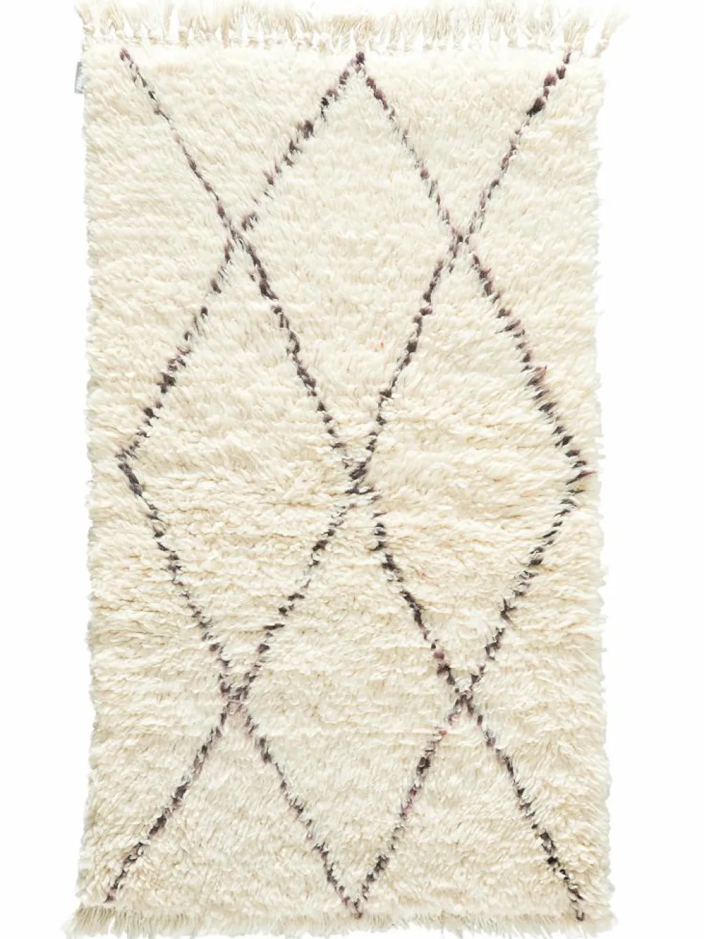 . Die Teppiche sind fast immer weißgrundig und zeichnen sich durch schwarze Zickzack-, Gitter- oder Rauten-Muster sowie einem wohnlich-zotteligen Flor aus. Kaum eine andere Teppichprovenienz passt mit ihren ursprünglichen nomadischen Designs besser in einen minimalistischen Wohnstil. Wie viele andere Nomadenteppiche auch, wurden dieBeni Ourain