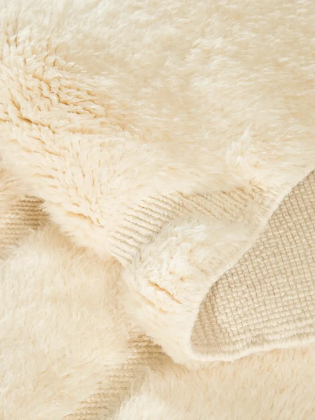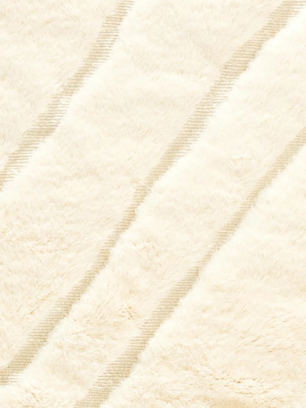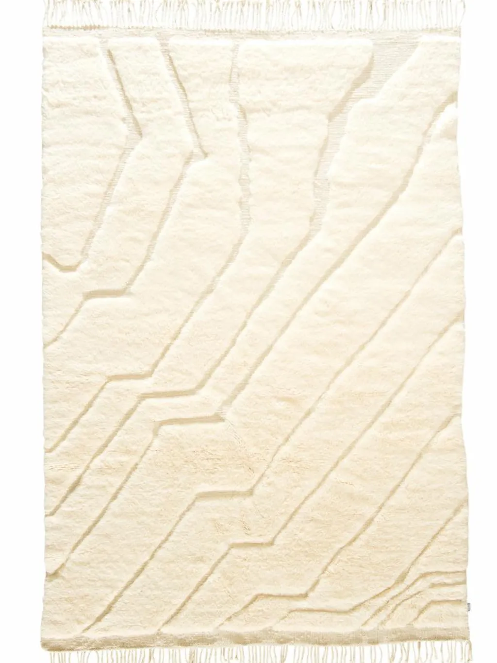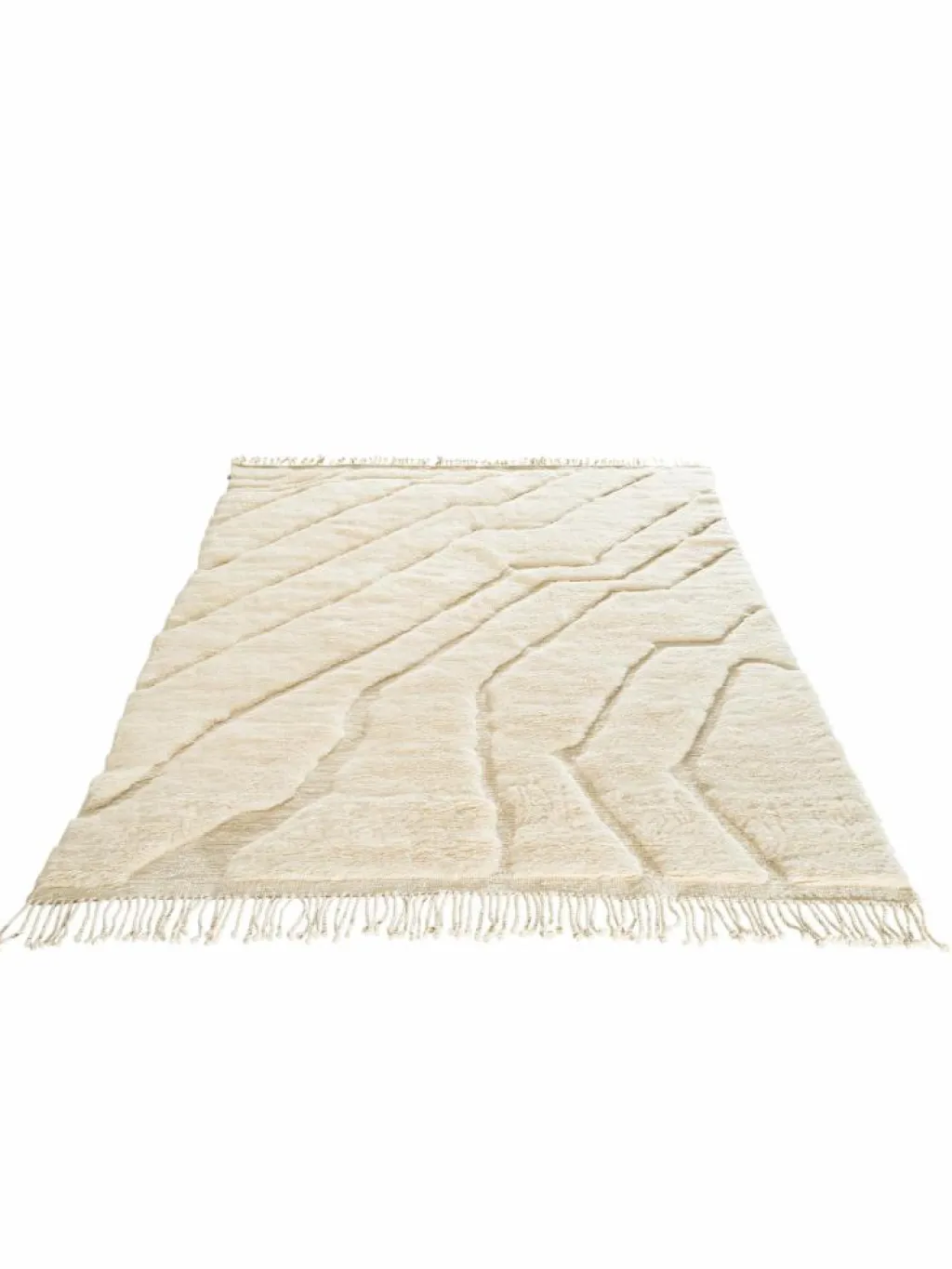 . Die Teppiche sind fast immer weißgrundig und zeichnen sich durch schwarze Zickzack-, Gitter- oder Rauten-Muster sowie einem wohnlich-zotteligen Flor aus. Kaum eine andere Teppichprovenienz passt mit ihren ursprünglichen nomadischen Designs besser in einen minimalistischen Wohnstil. Wie viele andere Nomadenteppiche auch, wurden dieBeni Ourain