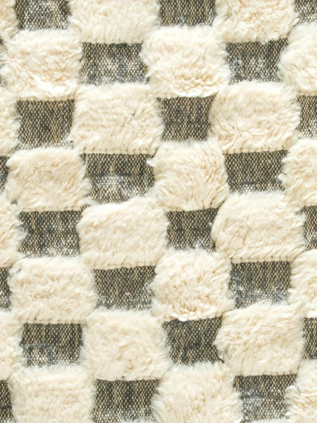 . Die Teppiche sind fast immer weißgrundig und zeichnen sich durch schwarze Zickzack-, Gitter- oder Rauten-Muster sowie einem wohnlich-zotteligen Flor aus. Kaum eine andere Teppichprovenienz passt mit ihren ursprünglichen nomadischen Designs besser in einen minimalistischen Wohnstil. Wie viele andere Nomadenteppiche auch, wurden dieBeni Ourain