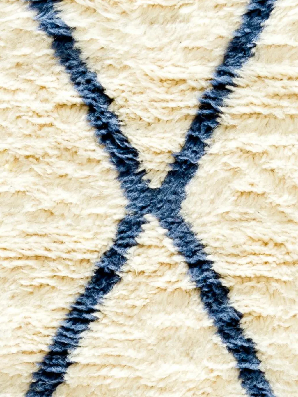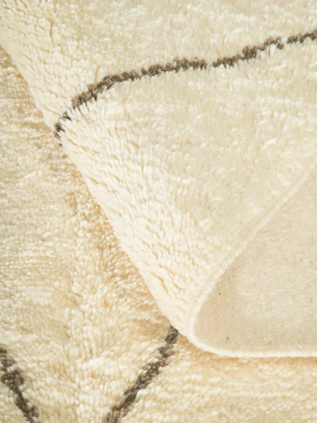 . Die Teppiche sind fast immer weißgrundig und zeichnen sich durch schwarze Zickzack-, Gitter- oder Rauten-Muster sowie einem wohnlich-zotteligen Flor aus. Kaum eine andere Teppichprovenienz passt mit ihren ursprünglichen nomadischen Designs besser in einen minimalistischen Wohnstil. Wie viele andere Nomadenteppiche auch, wurden dieBeni Ourain