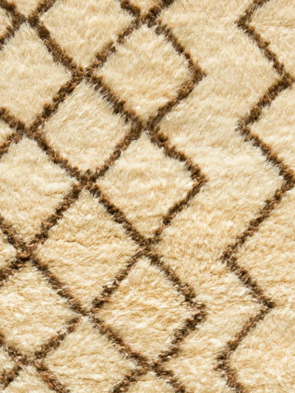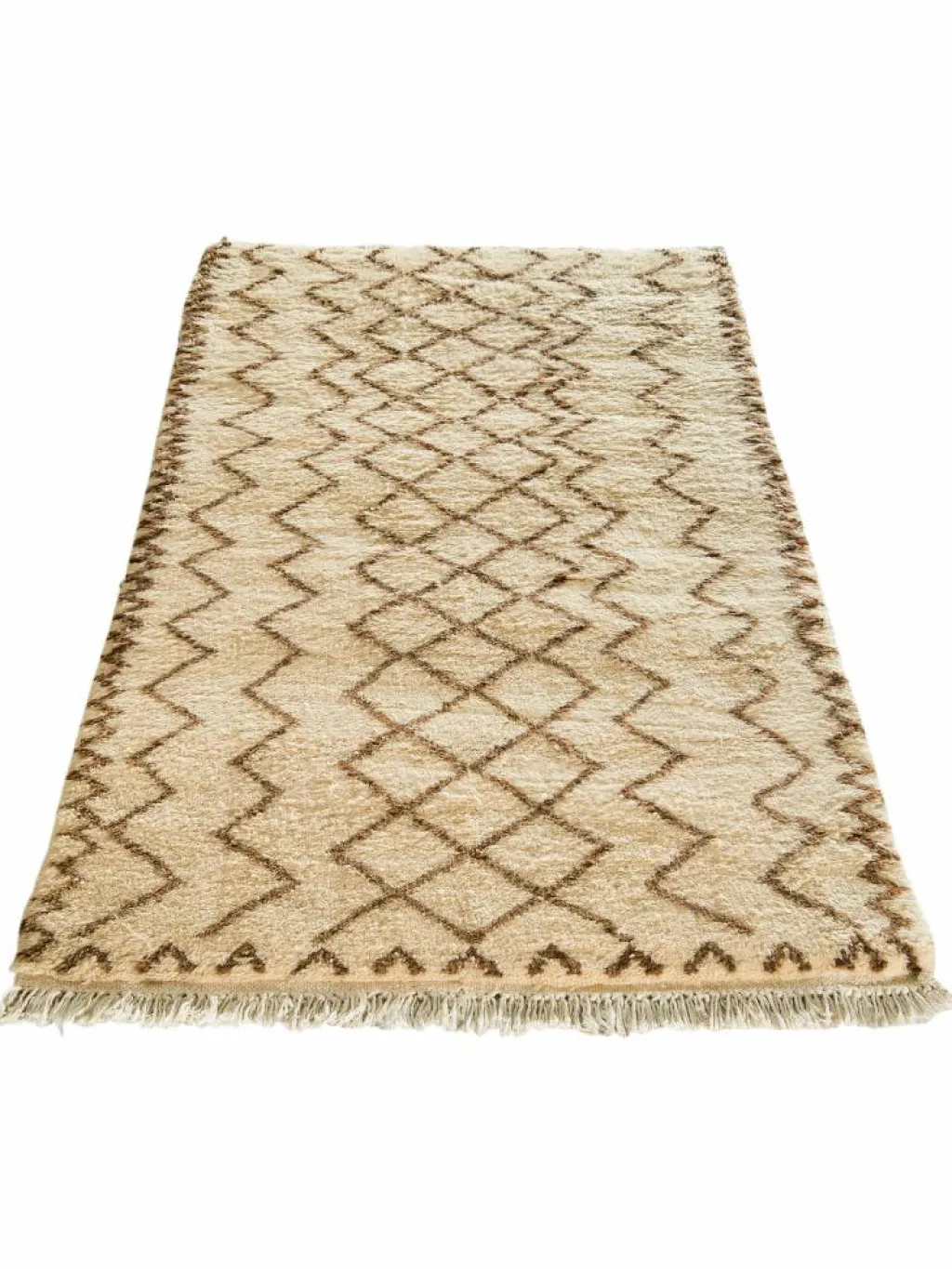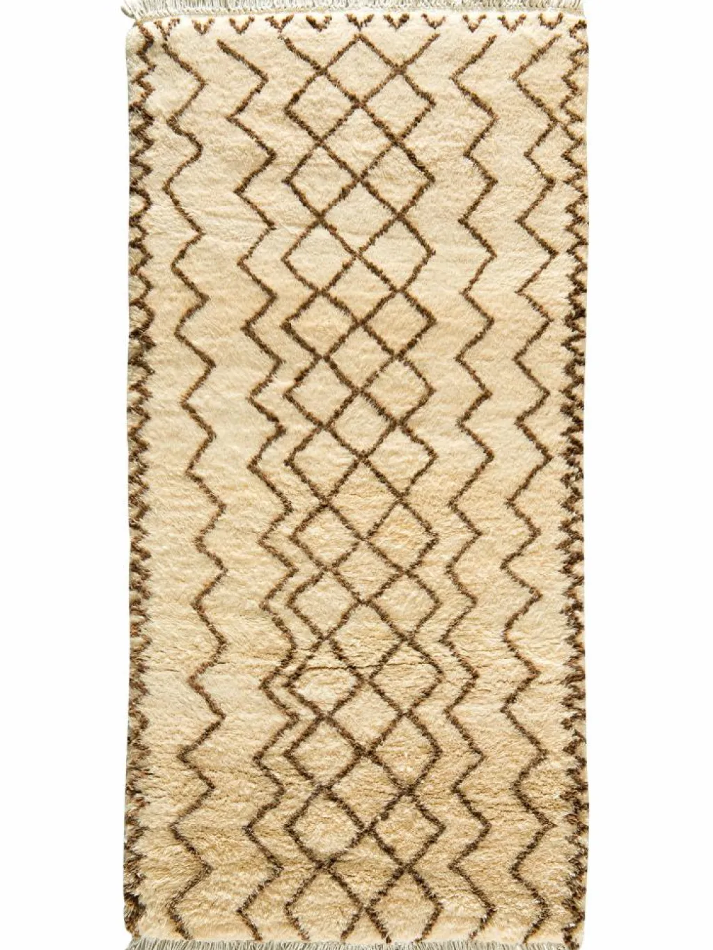 . Die Teppiche sind fast immer weißgrundig und zeichnen sich durch schwarze Zickzack-, Gitter- oder Rauten-Muster sowie einem wohnlich-zotteligen Flor aus. Kaum eine andere Teppichprovenienz passt mit ihren ursprünglichen nomadischen Designs besser in einen minimalistischen Wohnstil. Wie viele andere Nomadenteppiche auch, wurden dieBeni Ourain