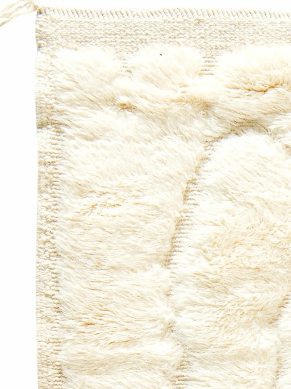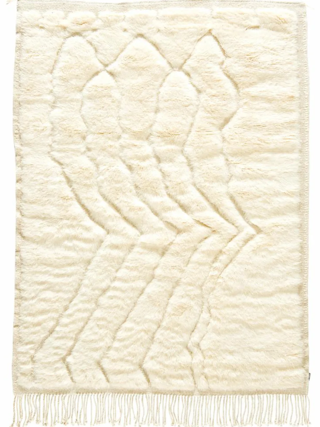 . Die Teppiche sind fast immer weißgrundig und zeichnen sich durch schwarze Zickzack-, Gitter- oder Rauten-Muster sowie einem wohnlich-zotteligen Flor aus. Kaum eine andere Teppichprovenienz passt mit ihren ursprünglichen nomadischen Designs besser in einen minimalistischen Wohnstil. Wie viele andere Nomadenteppiche auch, wurden dieBeni Ourain