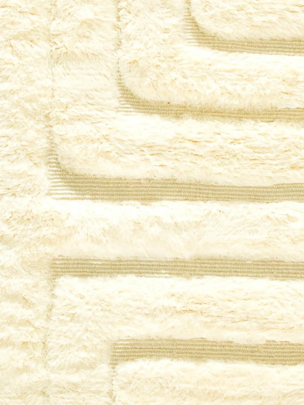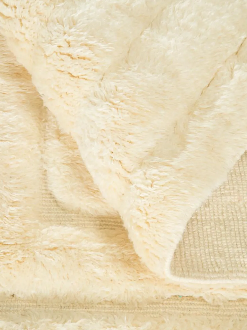 . Die Teppiche sind fast immer weißgrundig und zeichnen sich durch schwarze Zickzack-, Gitter- oder Rauten-Muster sowie einem wohnlich-zotteligen Flor aus. Kaum eine andere Teppichprovenienz passt mit ihren ursprünglichen nomadischen Designs besser in einen minimalistischen Wohnstil. Wie viele andere Nomadenteppiche auch, wurden dieBeni Ourain