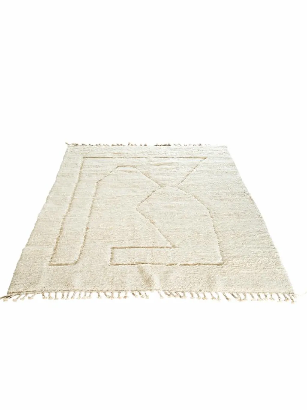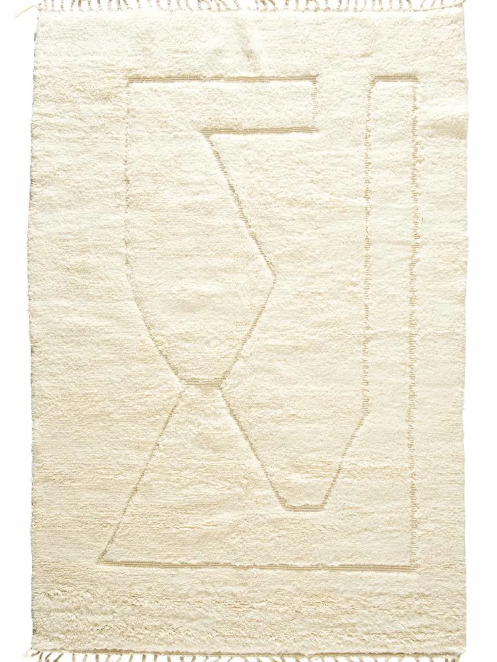 . Die Teppiche sind fast immer weißgrundig und zeichnen sich durch schwarze Zickzack-, Gitter- oder Rauten-Muster sowie einem wohnlich-zotteligen Flor aus. Kaum eine andere Teppichprovenienz passt mit ihren ursprünglichen nomadischen Designs besser in einen minimalistischen Wohnstil. Wie viele andere Nomadenteppiche auch, wurden dieBeni Ourain
