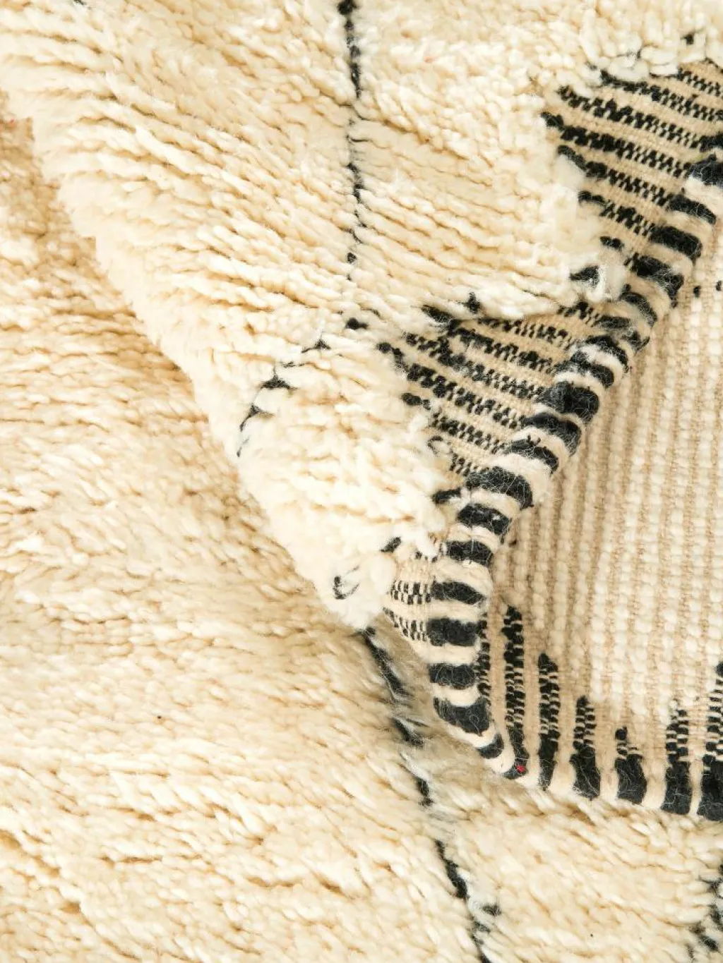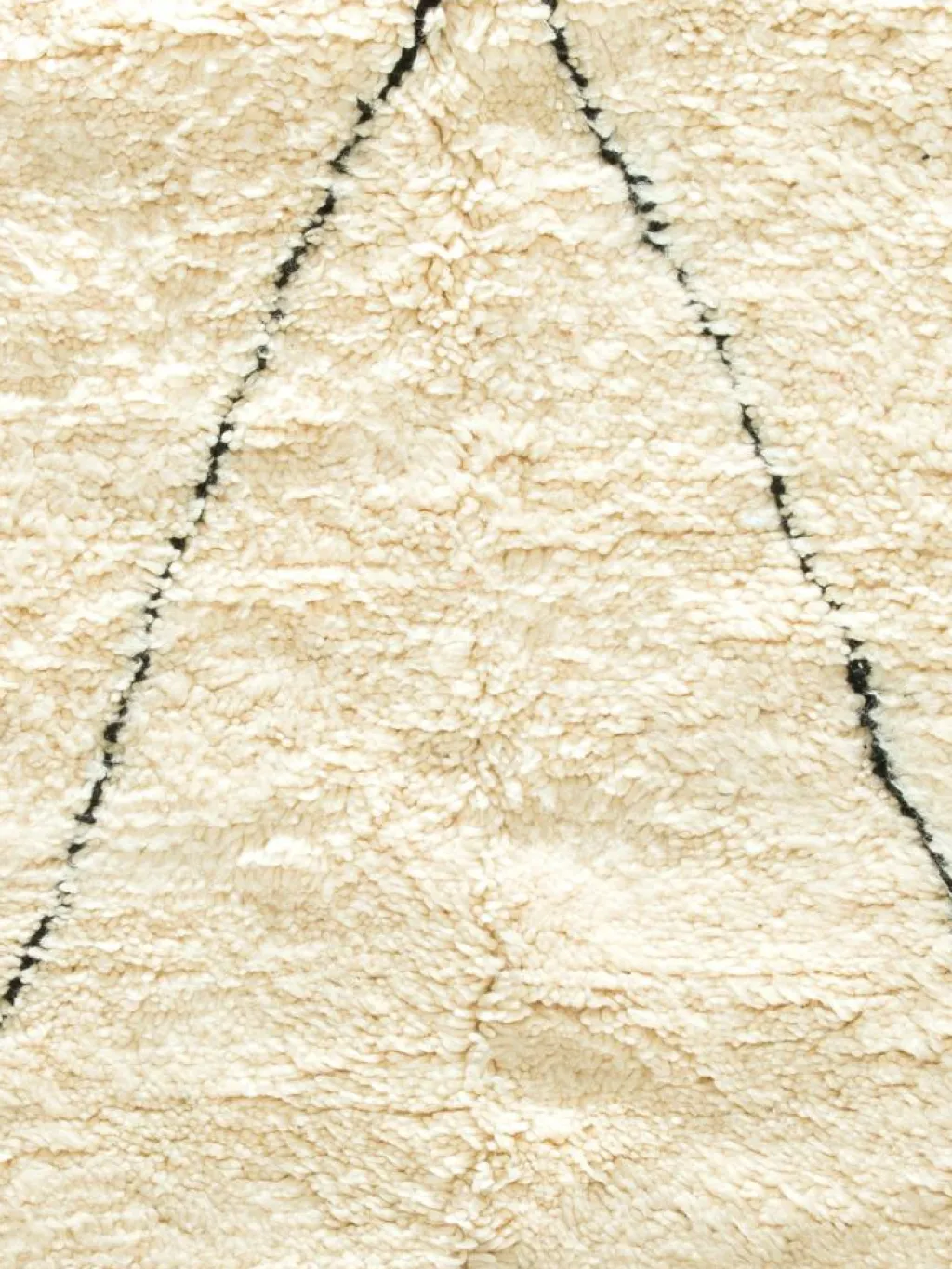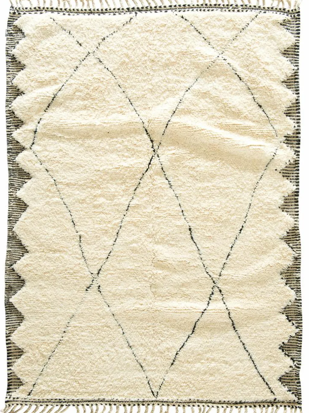 . Die Teppiche sind fast immer weißgrundig und zeichnen sich durch schwarze Zickzack-, Gitter- oder Rauten-Muster sowie einem wohnlich-zotteligen Flor aus. Kaum eine andere Teppichprovenienz passt mit ihren ursprünglichen nomadischen Designs besser in einen minimalistischen Wohnstil. Wie viele andere Nomadenteppiche auch, wurden dieBeni Ourain