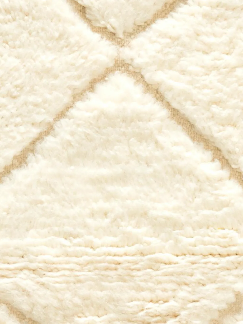 . Die Teppiche sind fast immer weißgrundig und zeichnen sich durch schwarze Zickzack-, Gitter- oder Rauten-Muster sowie einem wohnlich-zotteligen Flor aus. Kaum eine andere Teppichprovenienz passt mit ihren ursprünglichen nomadischen Designs besser in einen minimalistischen Wohnstil. Wie viele andere Nomadenteppiche auch, wurden dieBeni Ourain