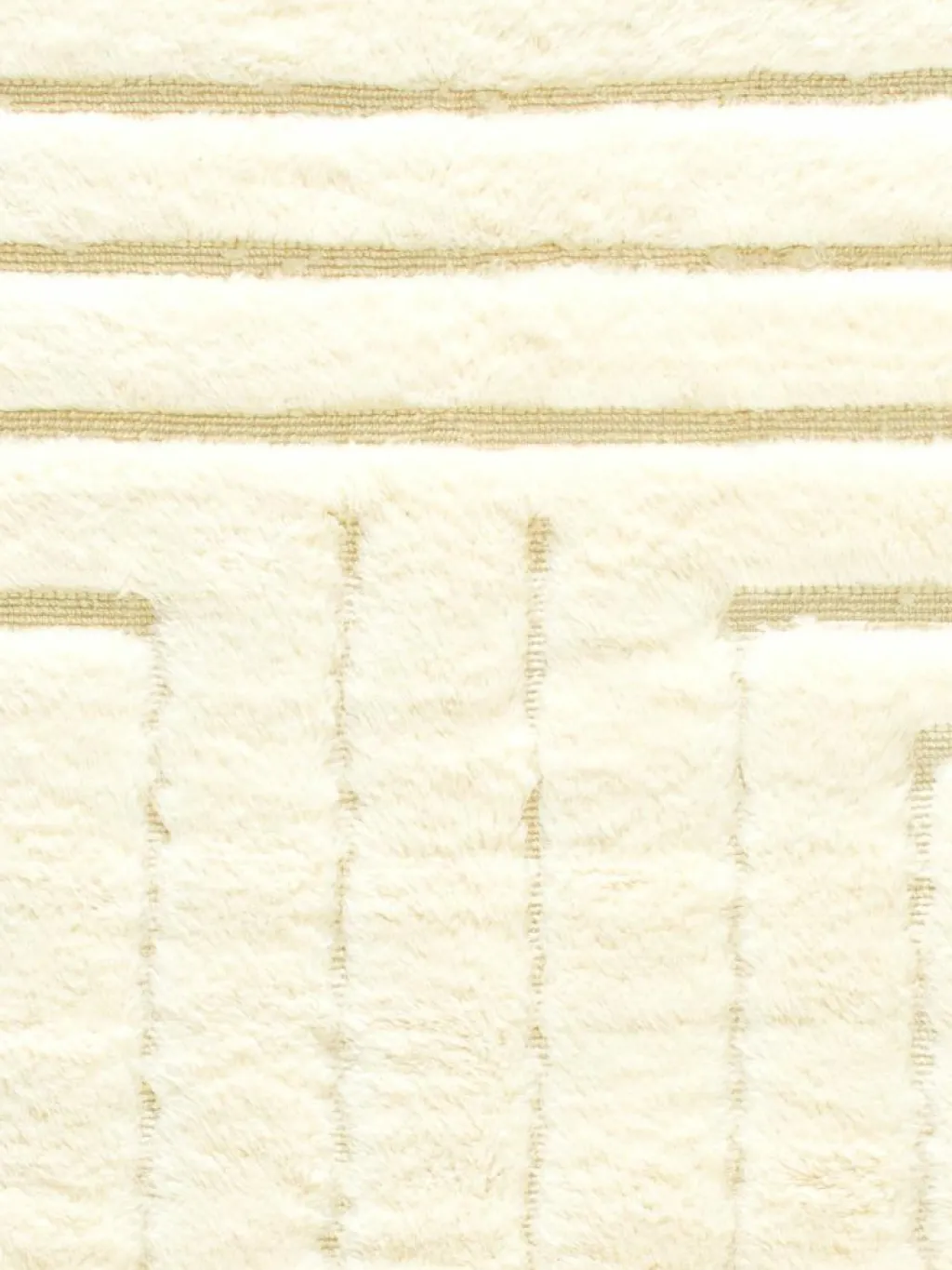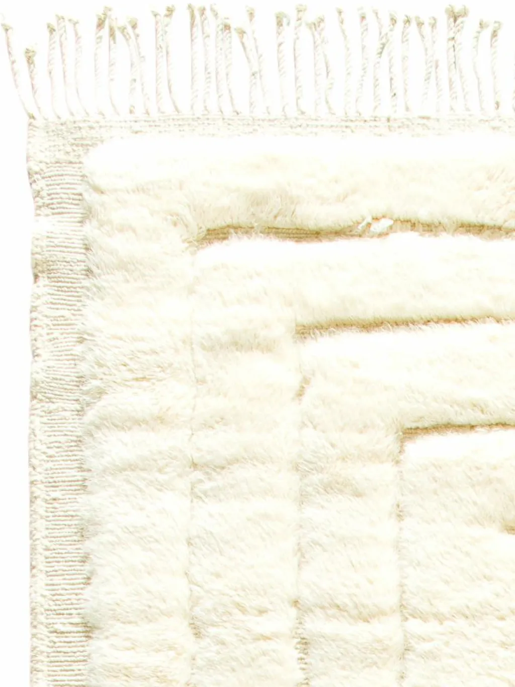 . Die Teppiche sind fast immer weißgrundig und zeichnen sich durch schwarze Zickzack-, Gitter- oder Rauten-Muster sowie einem wohnlich-zotteligen Flor aus. Kaum eine andere Teppichprovenienz passt mit ihren ursprünglichen nomadischen Designs besser in einen minimalistischen Wohnstil. Wie viele andere Nomadenteppiche auch, wurden dieBeni Ourain