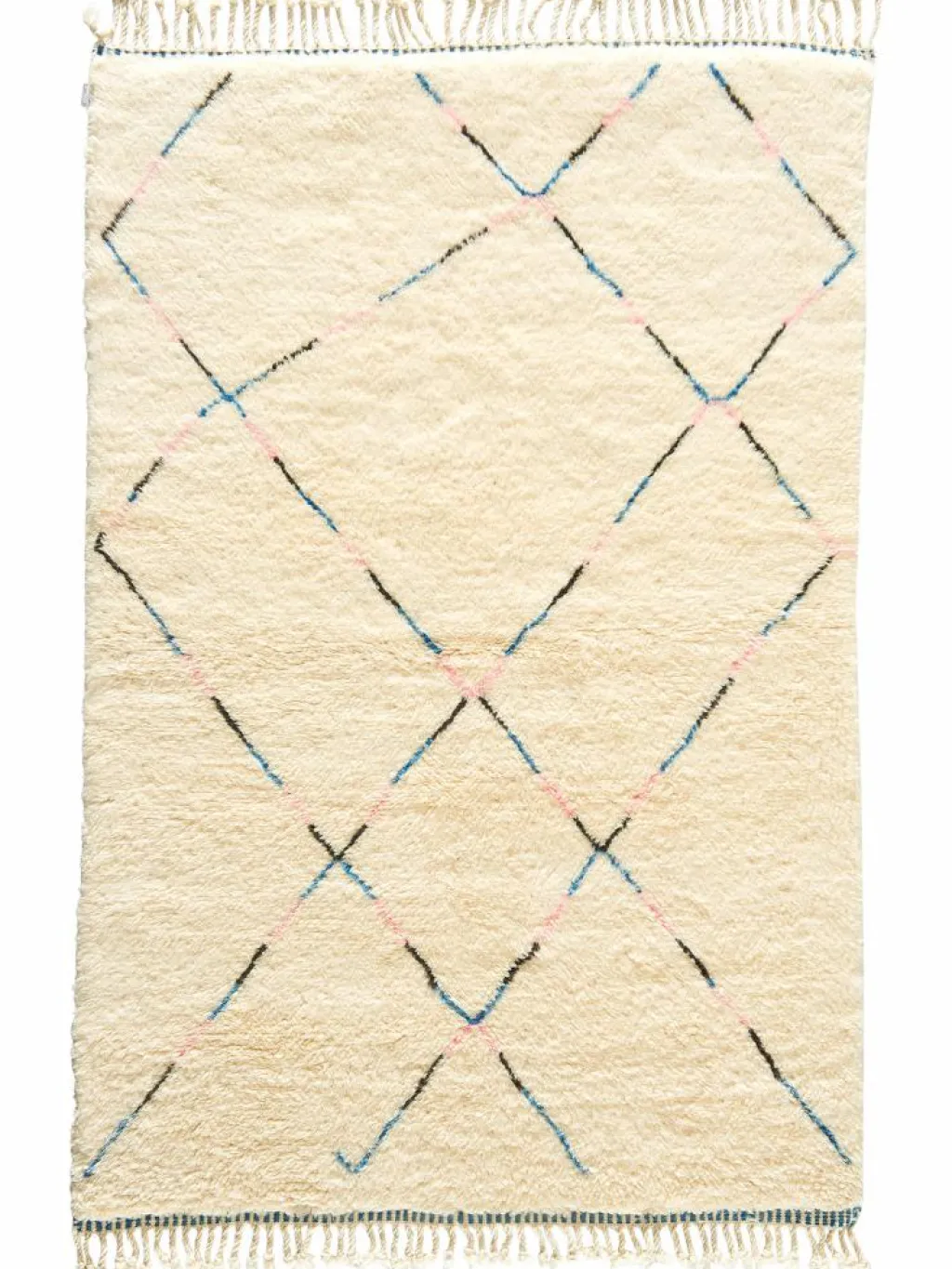 . Die Teppiche sind fast immer weißgrundig und zeichnen sich durch schwarze Zickzack-, Gitter- oder Rauten-Muster sowie einem wohnlich-zotteligen Flor aus. Kaum eine andere Teppichprovenienz passt mit ihren ursprünglichen nomadischen Designs besser in einen minimalistischen Wohnstil. Wie viele andere Nomadenteppiche auch, wurden dieBeni Ourain