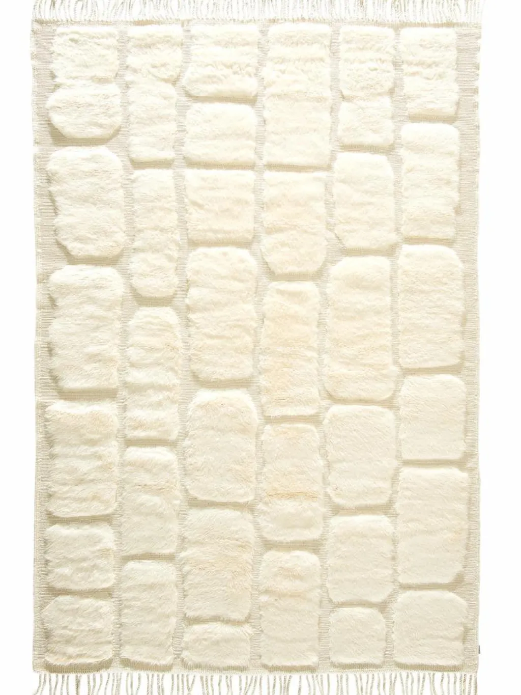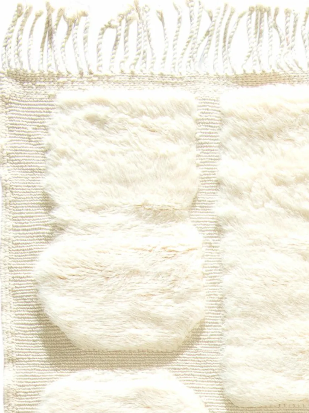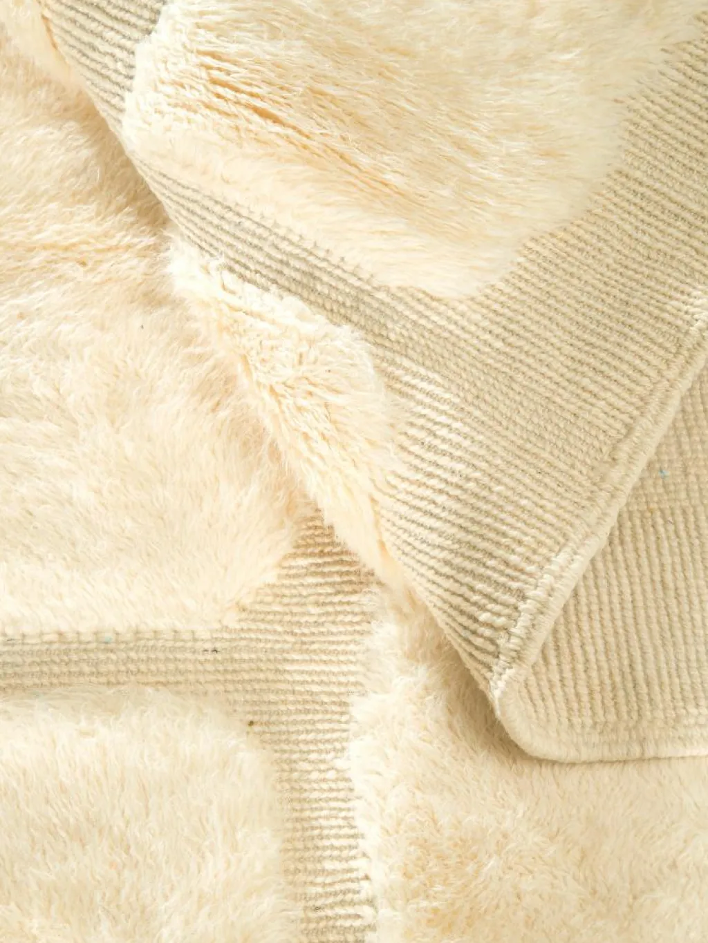 . Die Teppiche sind fast immer weißgrundig und zeichnen sich durch schwarze Zickzack-, Gitter- oder Rauten-Muster sowie einem wohnlich-zotteligen Flor aus. Kaum eine andere Teppichprovenienz passt mit ihren ursprünglichen nomadischen Designs besser in einen minimalistischen Wohnstil. Wie viele andere Nomadenteppiche auch, wurden dieBeni Ourain