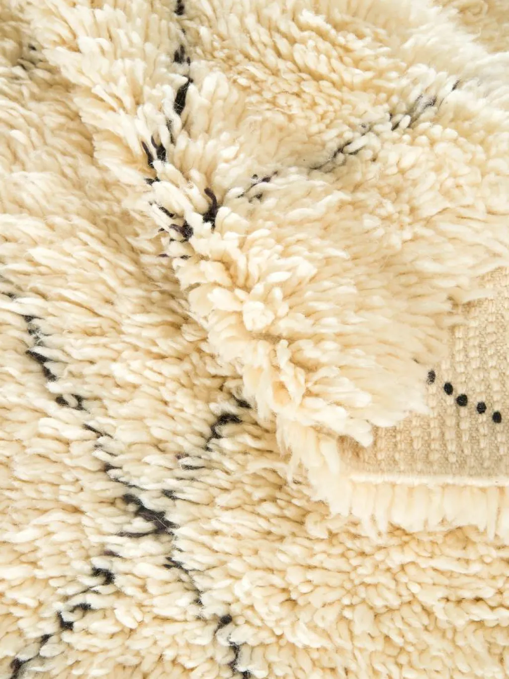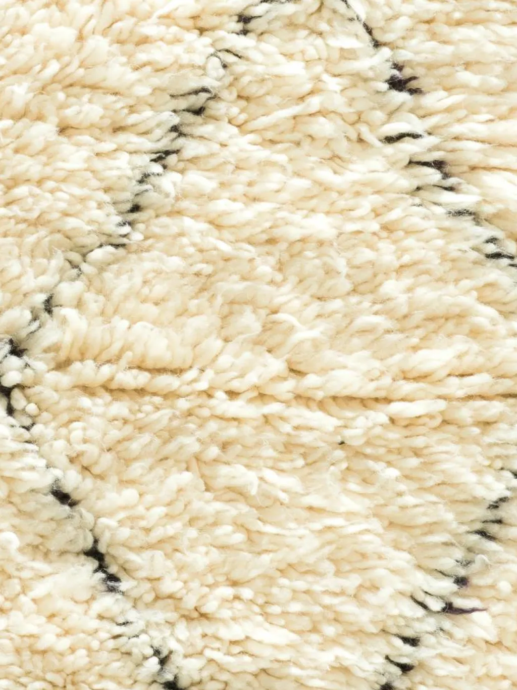 . Die Teppiche sind fast immer weißgrundig und zeichnen sich durch schwarze Zickzack-, Gitter- oder Rauten-Muster sowie einem wohnlich-zotteligen Flor aus. Kaum eine andere Teppichprovenienz passt mit ihren ursprünglichen nomadischen Designs besser in einen minimalistischen Wohnstil. Wie viele andere Nomadenteppiche auch, wurden dieBeni Ourain