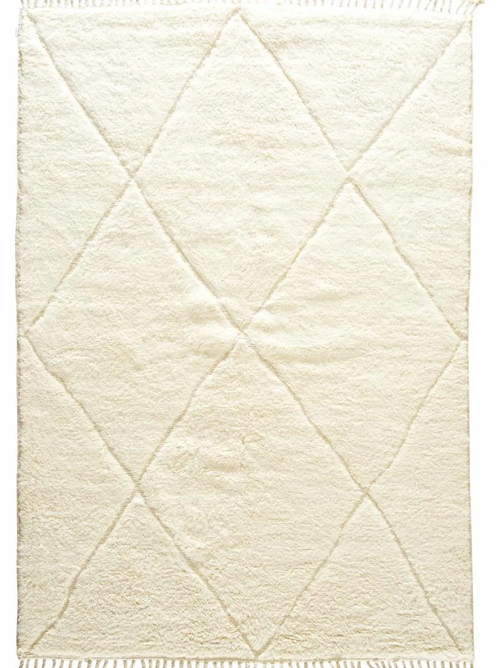 . Die Teppiche sind fast immer weißgrundig und zeichnen sich durch schwarze Zickzack-, Gitter- oder Rauten-Muster sowie einem wohnlich-zotteligen Flor aus. Kaum eine andere Teppichprovenienz passt mit ihren ursprünglichen nomadischen Designs besser in einen minimalistischen Wohnstil. Wie viele andere Nomadenteppiche auch, wurden dieBeni Ourain
