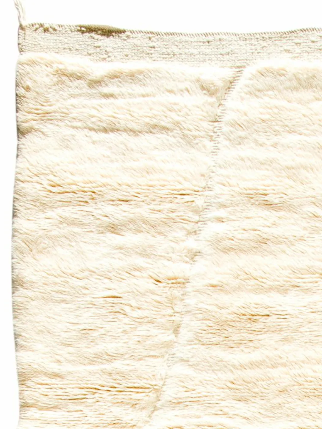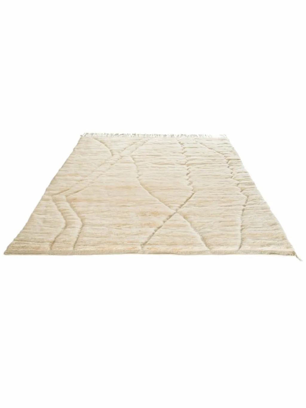 . Die Teppiche sind fast immer weißgrundig und zeichnen sich durch schwarze Zickzack-, Gitter- oder Rauten-Muster sowie einem wohnlich-zotteligen Flor aus. Kaum eine andere Teppichprovenienz passt mit ihren ursprünglichen nomadischen Designs besser in einen minimalistischen Wohnstil. Wie viele andere Nomadenteppiche auch, wurden dieBeni Ourain