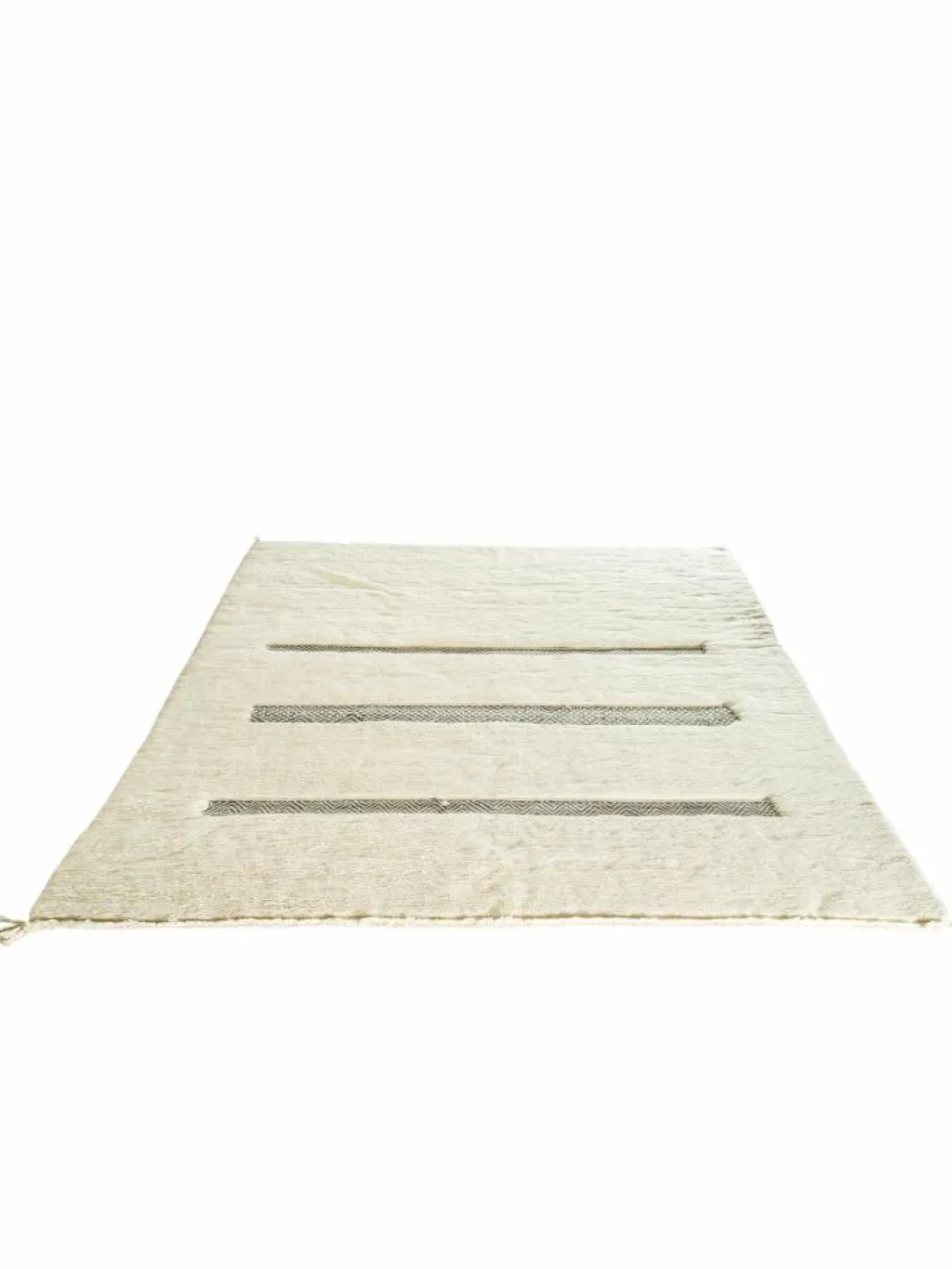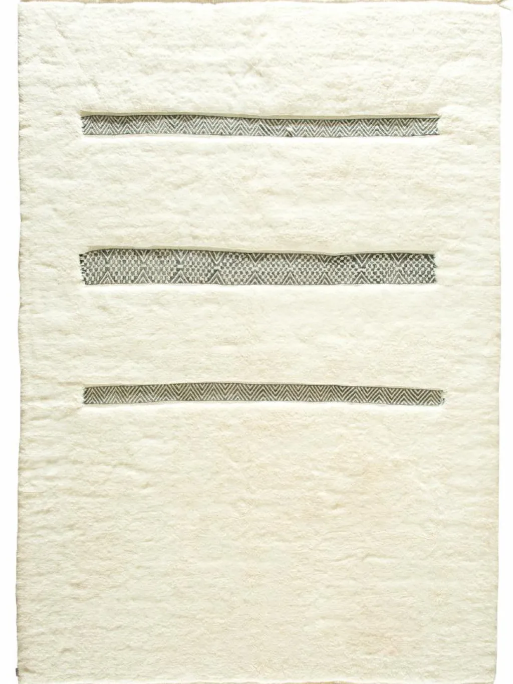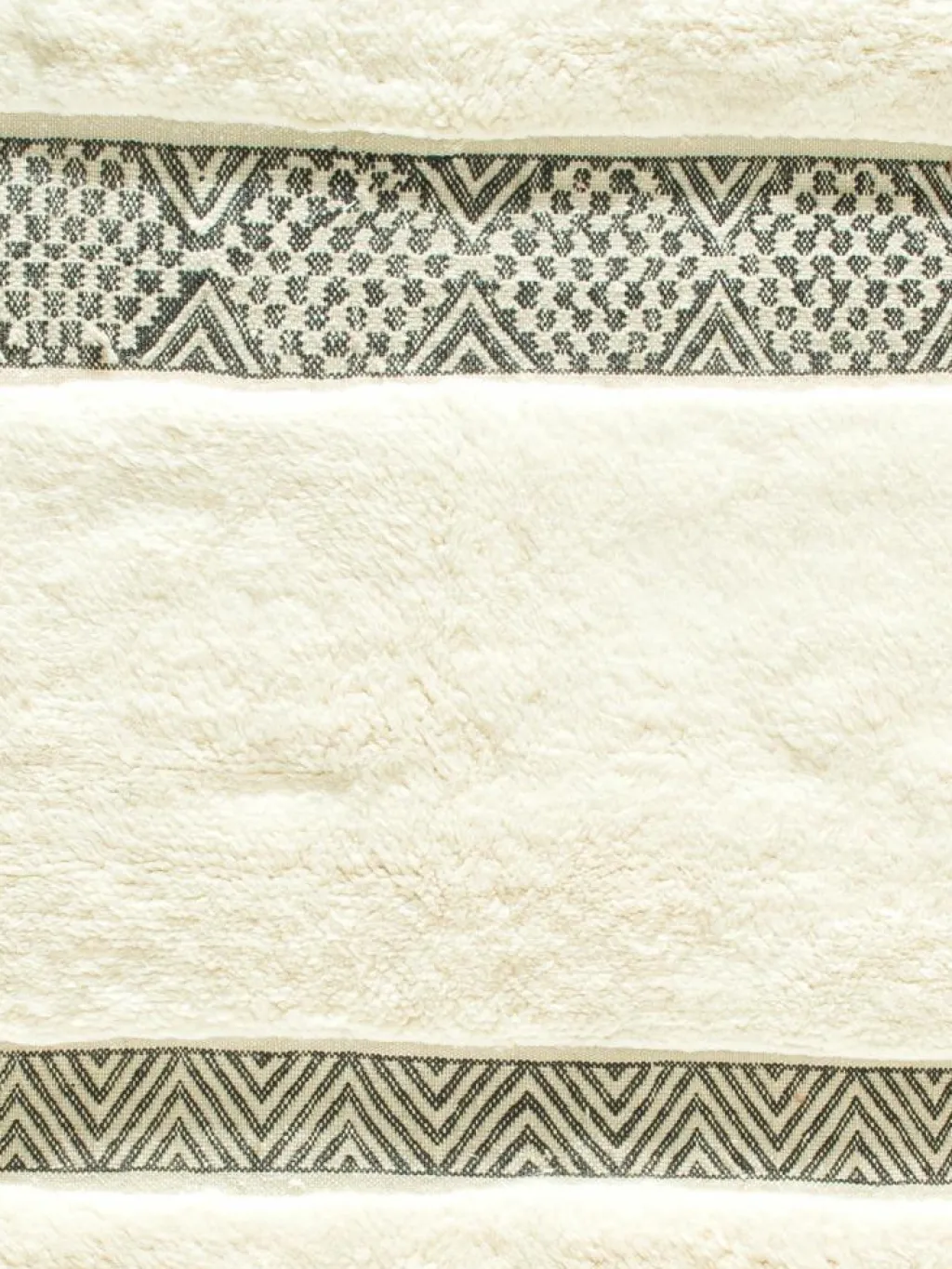. Die Teppiche sind fast immer weißgrundig und zeichnen sich durch schwarze Zickzack-, Gitter- oder Rauten-Muster sowie einem wohnlich-zotteligen Flor aus. Kaum eine andere Teppichprovenienz passt mit ihren ursprünglichen nomadischen Designs besser in einen minimalistischen Wohnstil. Wie viele andere Nomadenteppiche auch, wurden dieBeni Ourain