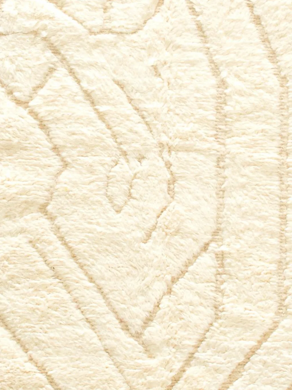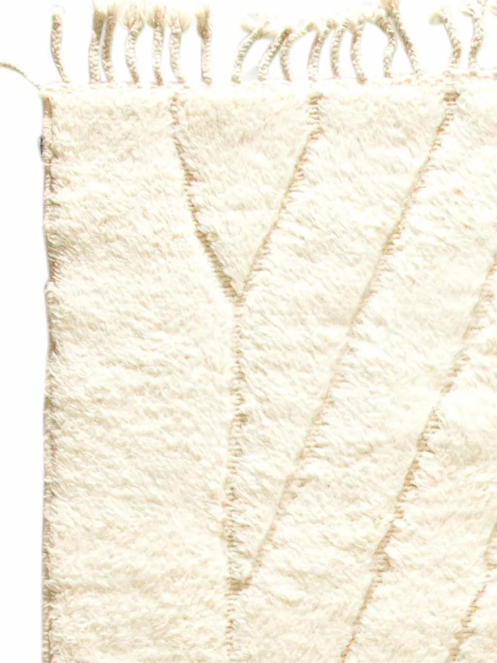 . Die Teppiche sind fast immer weißgrundig und zeichnen sich durch schwarze Zickzack-, Gitter- oder Rauten-Muster sowie einem wohnlich-zotteligen Flor aus. Kaum eine andere Teppichprovenienz passt mit ihren ursprünglichen nomadischen Designs besser in einen minimalistischen Wohnstil. Wie viele andere Nomadenteppiche auch, wurden dieBeni Ourain
