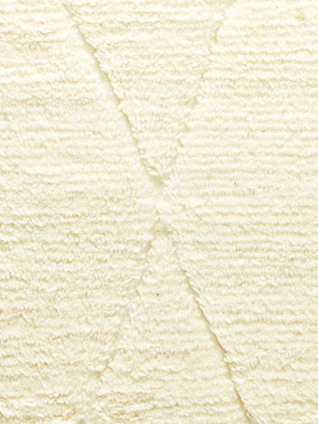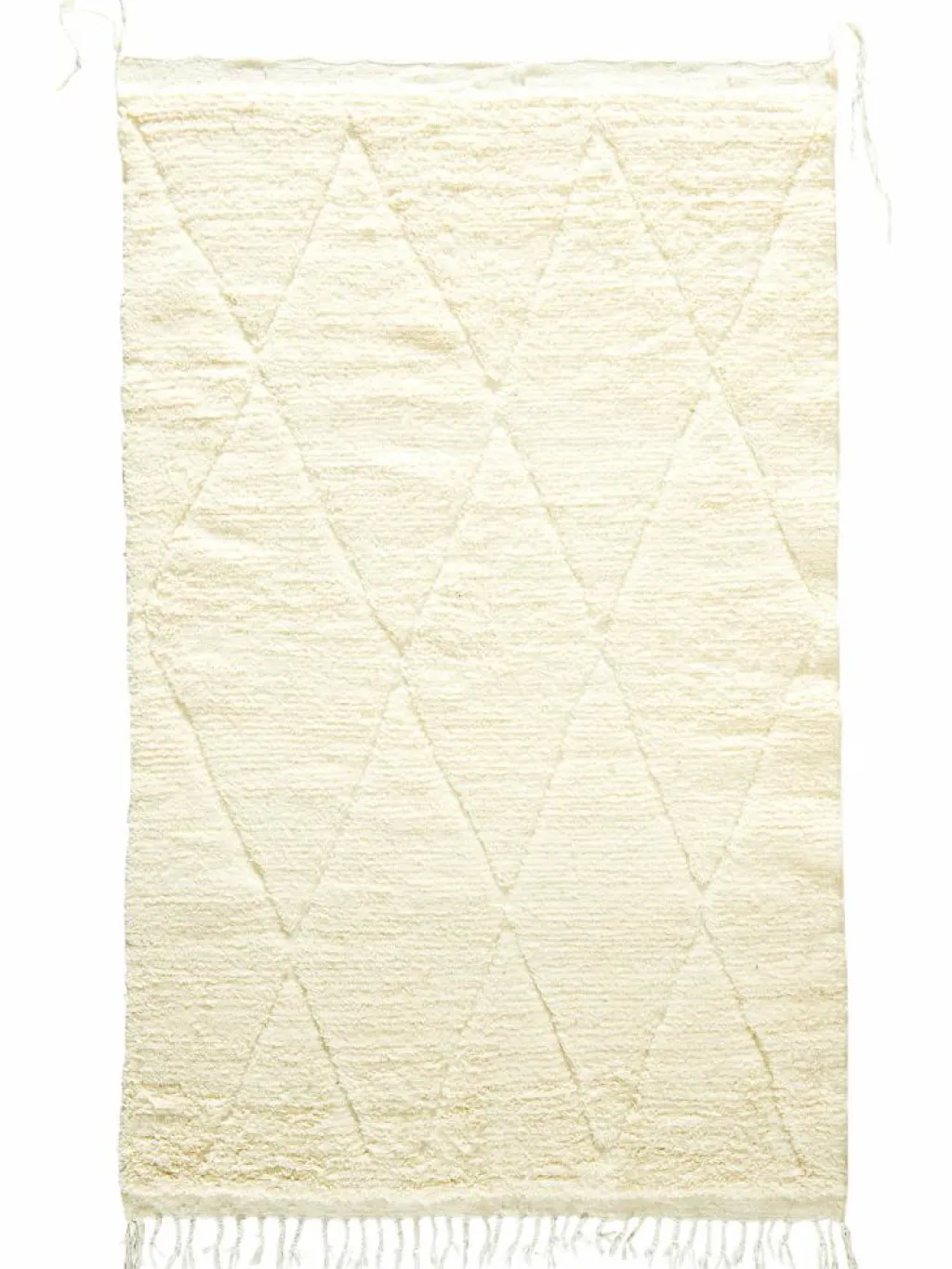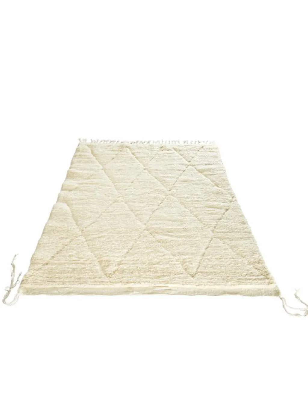 . Die Teppiche sind fast immer weißgrundig und zeichnen sich durch schwarze Zickzack-, Gitter- oder Rauten-Muster sowie einem wohnlich-zotteligen Flor aus. Kaum eine andere Teppichprovenienz passt mit ihren ursprünglichen nomadischen Designs besser in einen minimalistischen Wohnstil. Wie viele andere Nomadenteppiche auch, wurden dieBeni Ourain