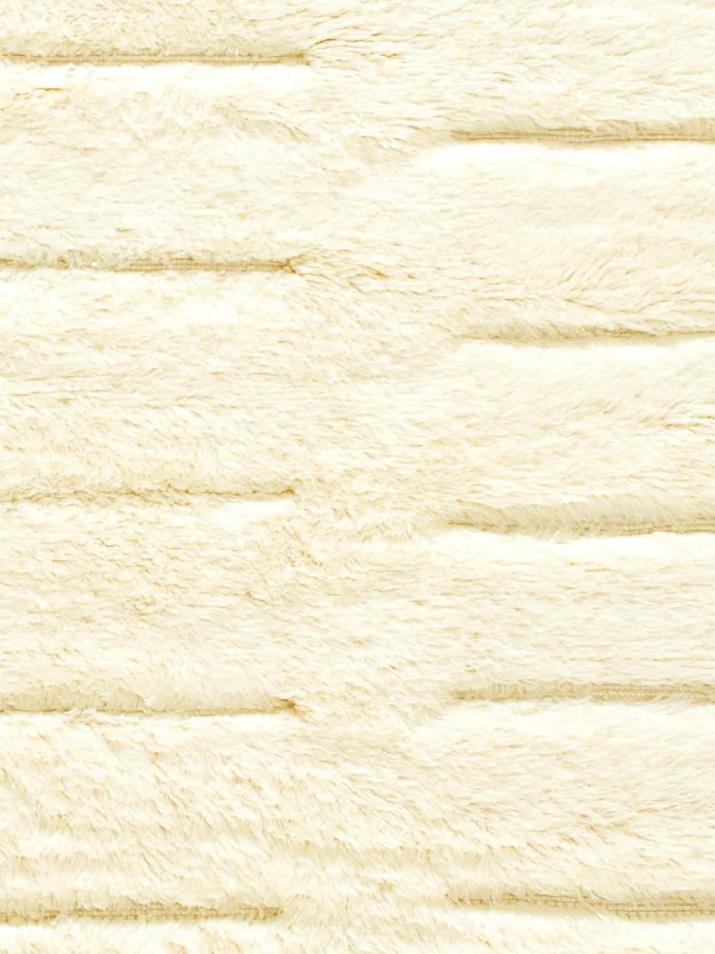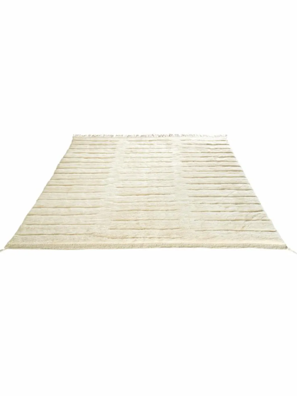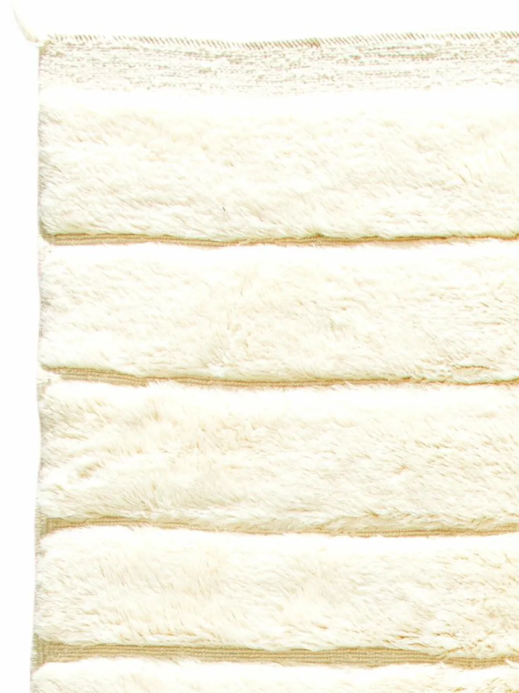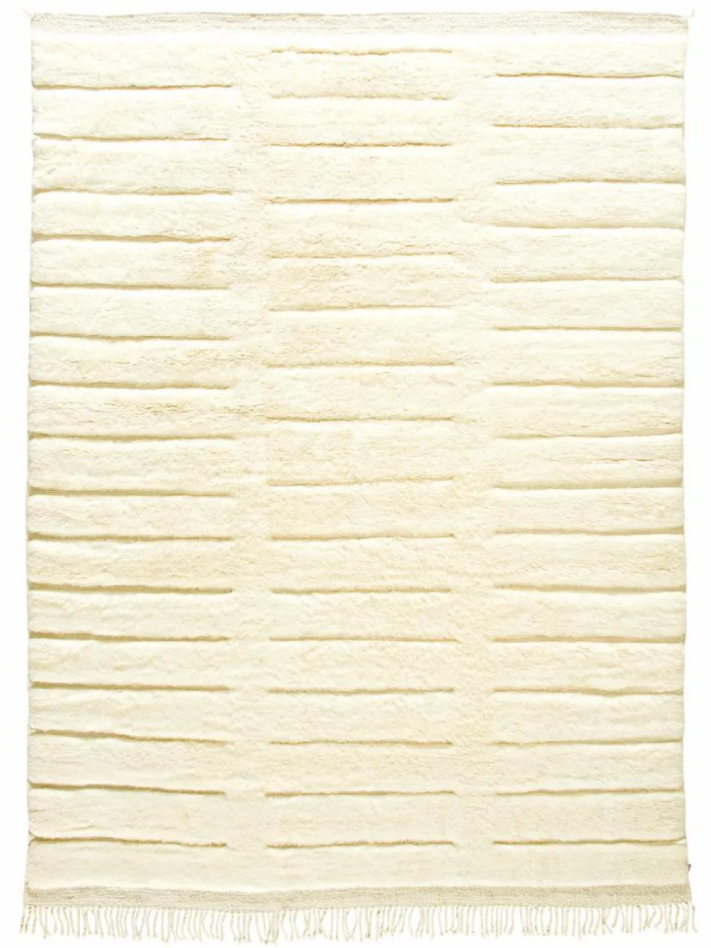 . Die Teppiche sind fast immer weißgrundig und zeichnen sich durch schwarze Zickzack-, Gitter- oder Rauten-Muster sowie einem wohnlich-zotteligen Flor aus. Kaum eine andere Teppichprovenienz passt mit ihren ursprünglichen nomadischen Designs besser in einen minimalistischen Wohnstil. Wie viele andere Nomadenteppiche auch, wurden dieBeni Ourain