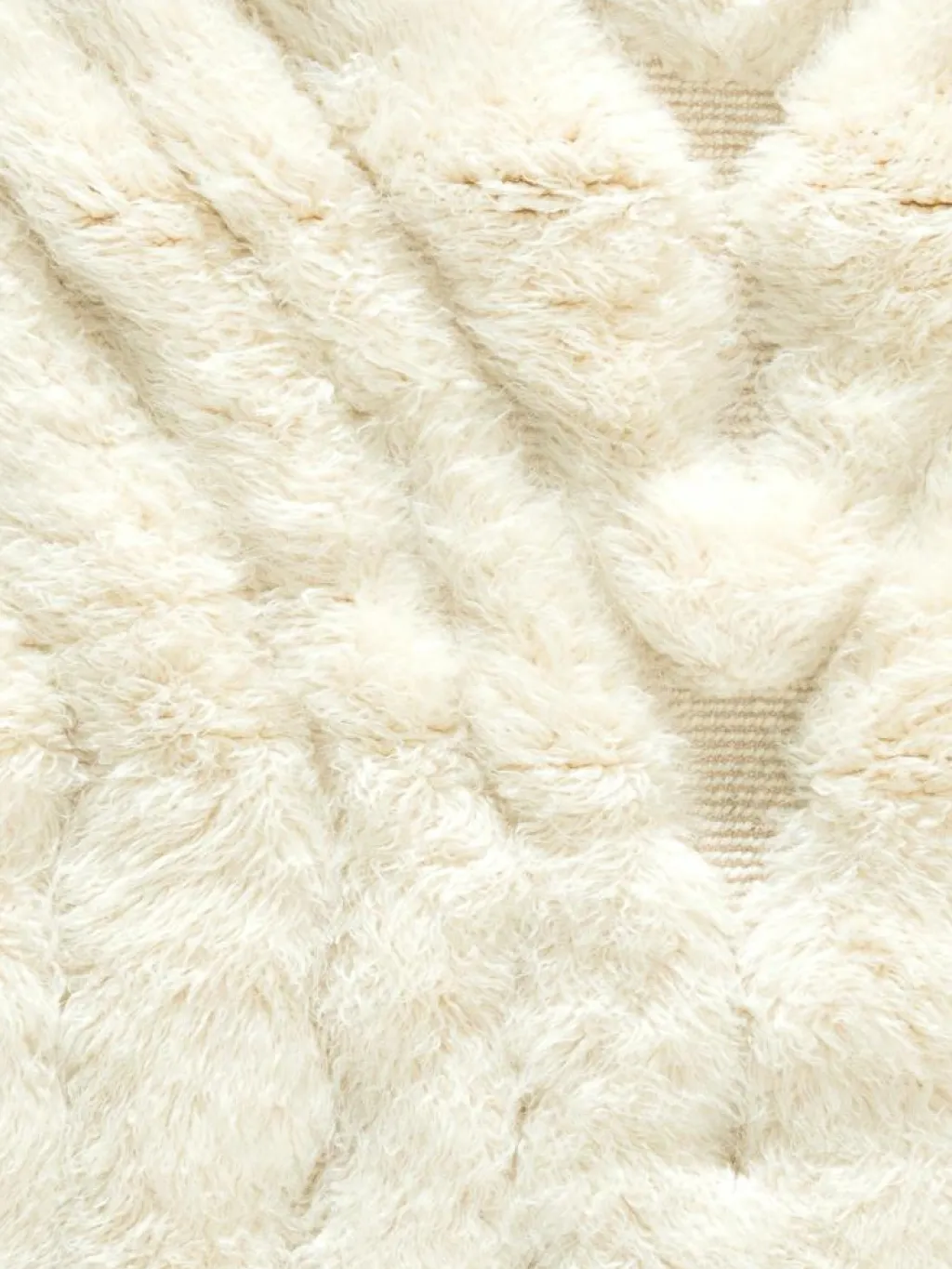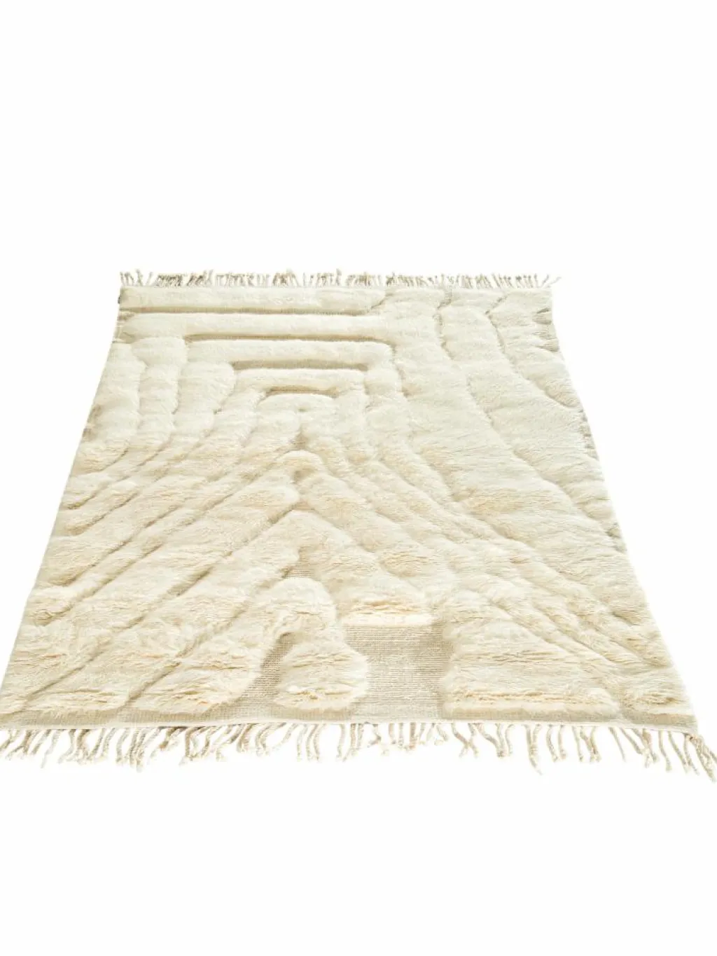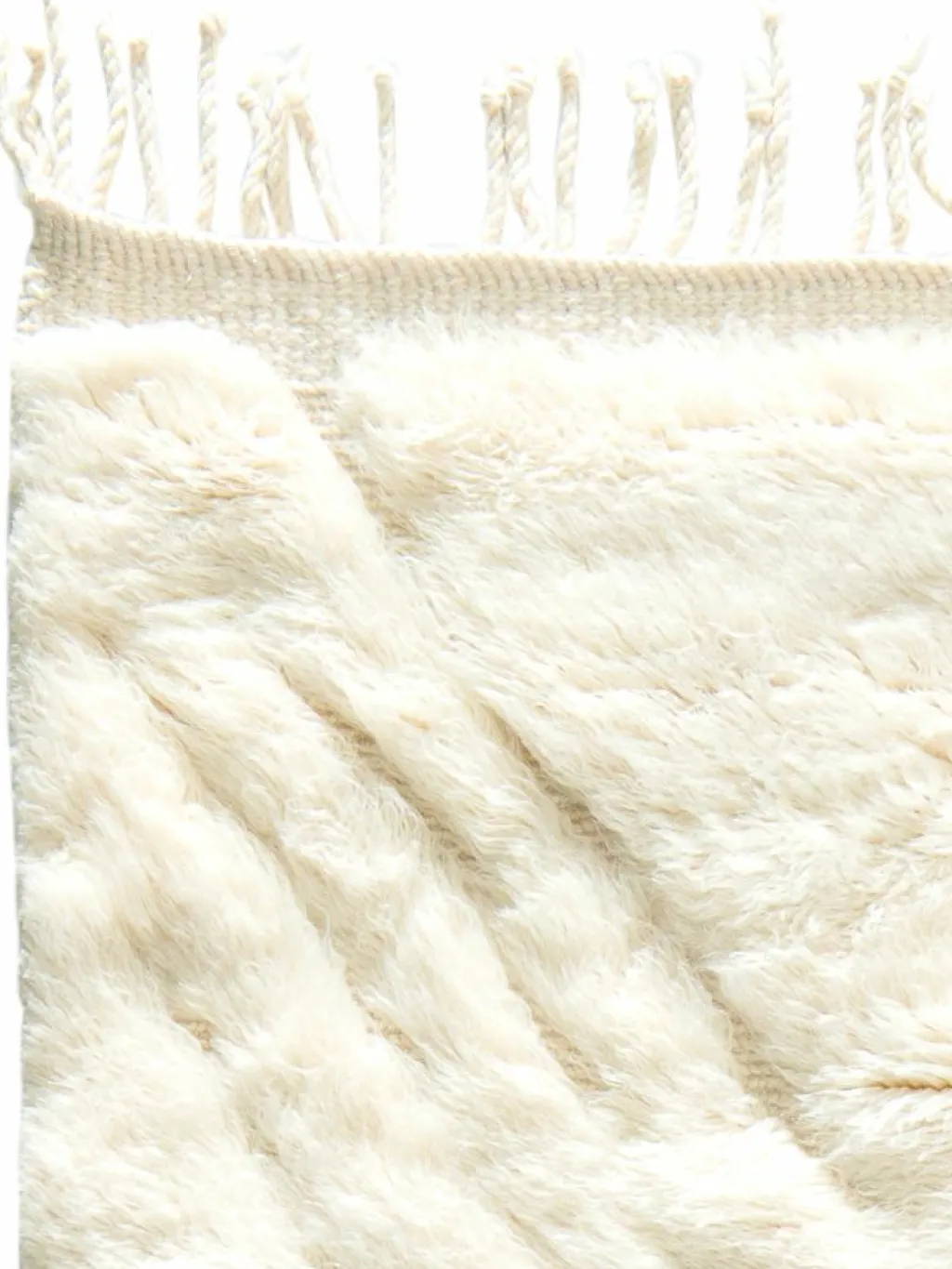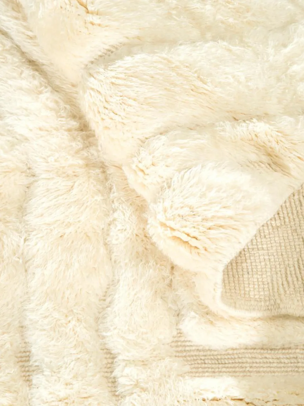 . Die Teppiche sind fast immer weißgrundig und zeichnen sich durch schwarze Zickzack-, Gitter- oder Rauten-Muster sowie einem wohnlich-zotteligen Flor aus. Kaum eine andere Teppichprovenienz passt mit ihren ursprünglichen nomadischen Designs besser in einen minimalistischen Wohnstil. Wie viele andere Nomadenteppiche auch, wurden dieBeni Ourain