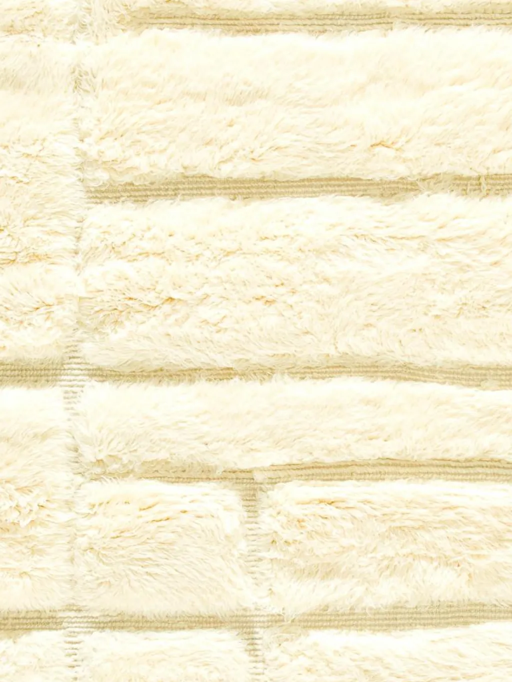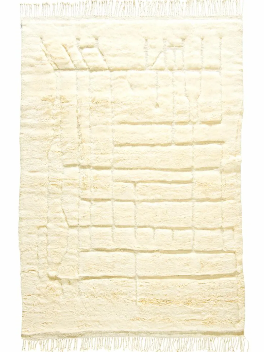 . Die Teppiche sind fast immer weißgrundig und zeichnen sich durch schwarze Zickzack-, Gitter- oder Rauten-Muster sowie einem wohnlich-zotteligen Flor aus. Kaum eine andere Teppichprovenienz passt mit ihren ursprünglichen nomadischen Designs besser in einen minimalistischen Wohnstil. Wie viele andere Nomadenteppiche auch, wurden dieBeni Ourain