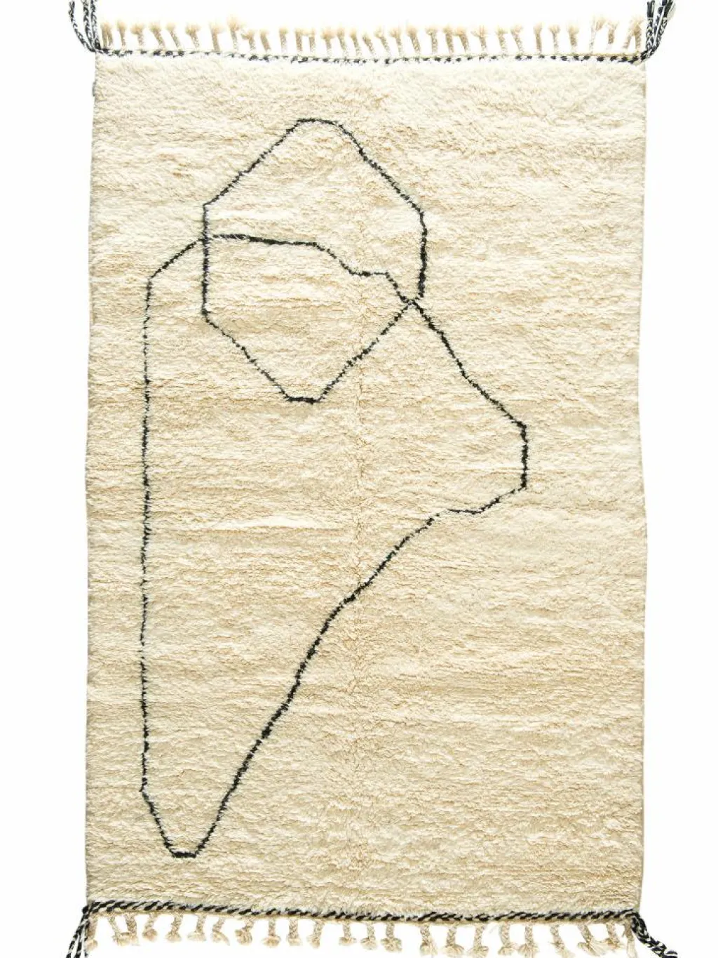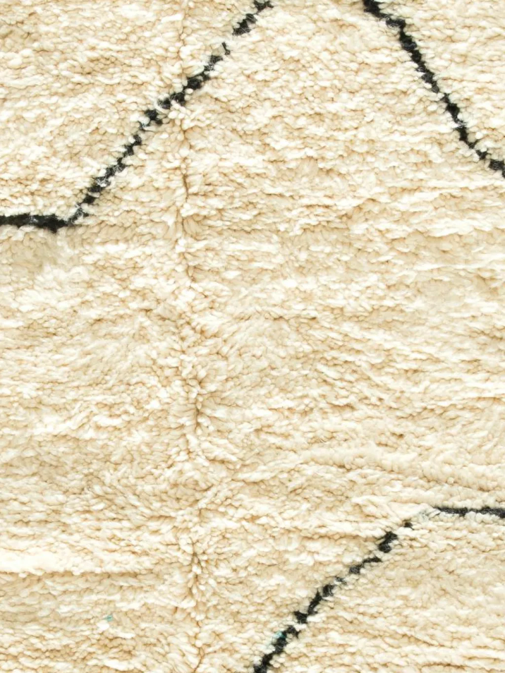 . Die Teppiche sind fast immer weißgrundig und zeichnen sich durch schwarze Zickzack-, Gitter- oder Rauten-Muster sowie einem wohnlich-zotteligen Flor aus. Kaum eine andere Teppichprovenienz passt mit ihren ursprünglichen nomadischen Designs besser in einen minimalistischen Wohnstil. Wie viele andere Nomadenteppiche auch, wurden dieBeni Ourain