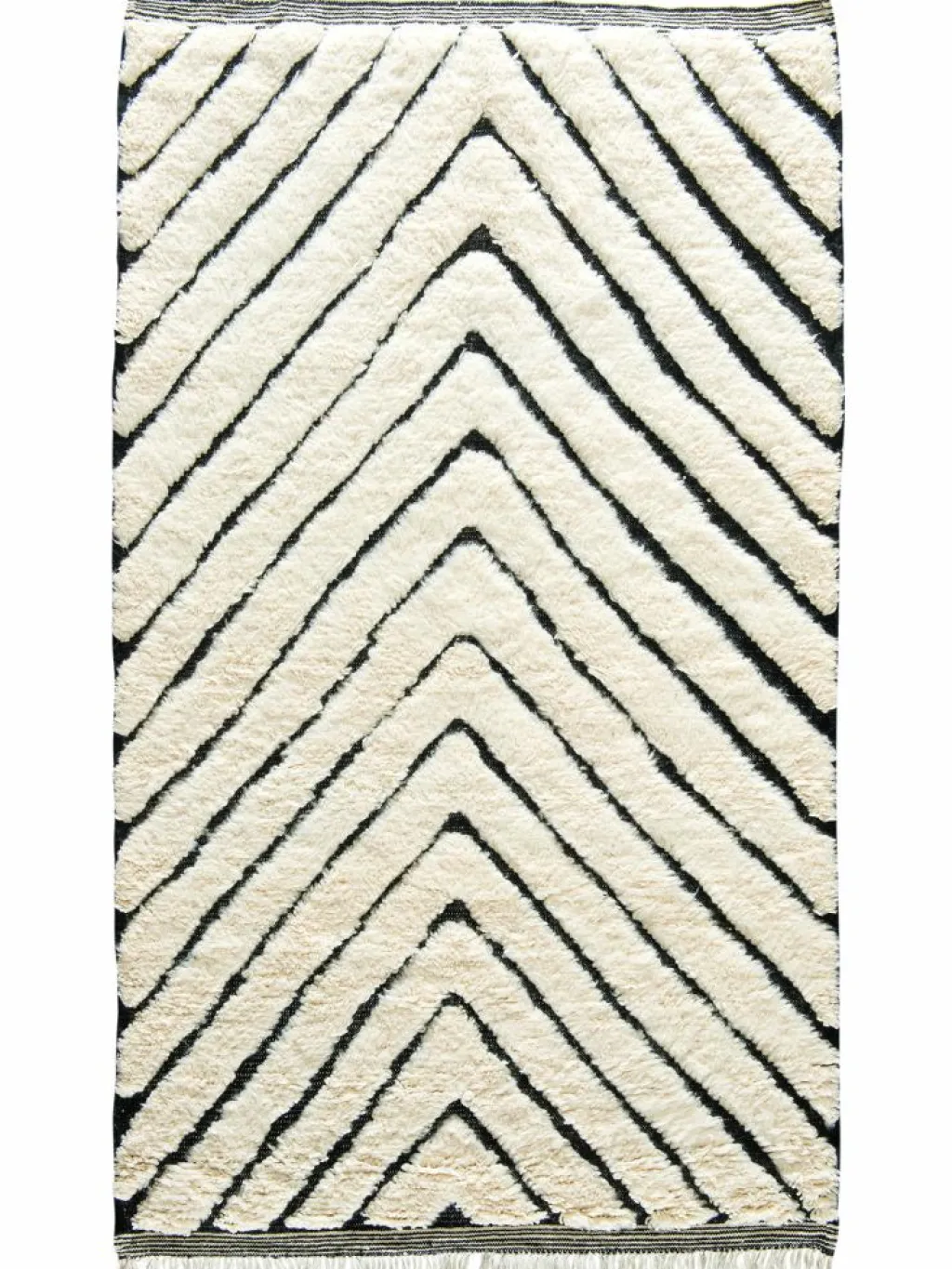 . Die Teppiche sind fast immer weißgrundig und zeichnen sich durch schwarze Zickzack-, Gitter- oder Rauten-Muster sowie einem wohnlich-zotteligen Flor aus. Kaum eine andere Teppichprovenienz passt mit ihren ursprünglichen nomadischen Designs besser in einen minimalistischen Wohnstil. Wie viele andere Nomadenteppiche auch, wurden dieBeni Ourain