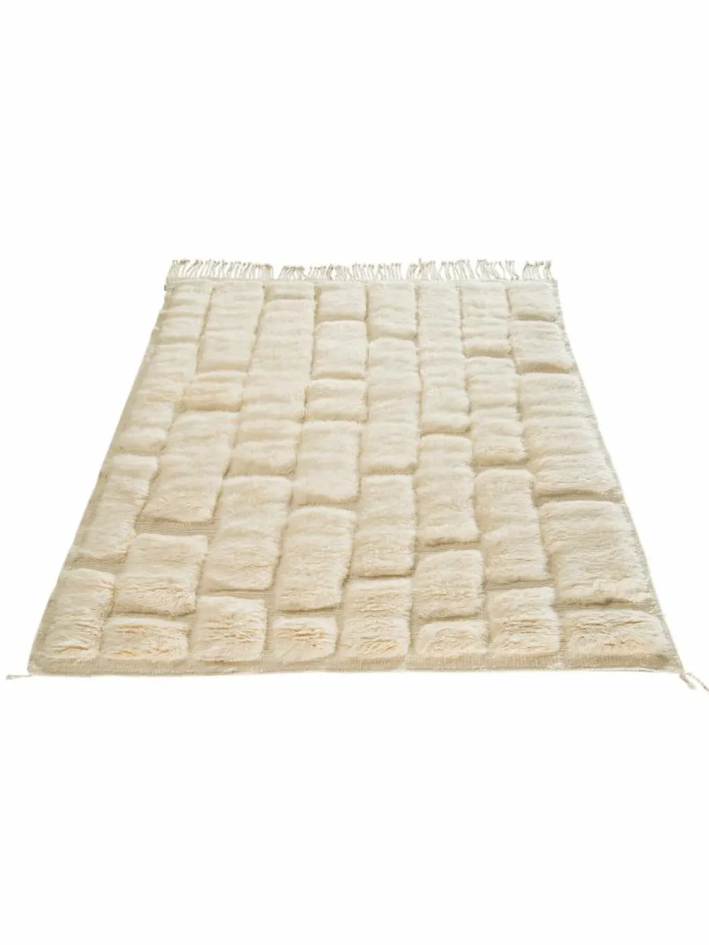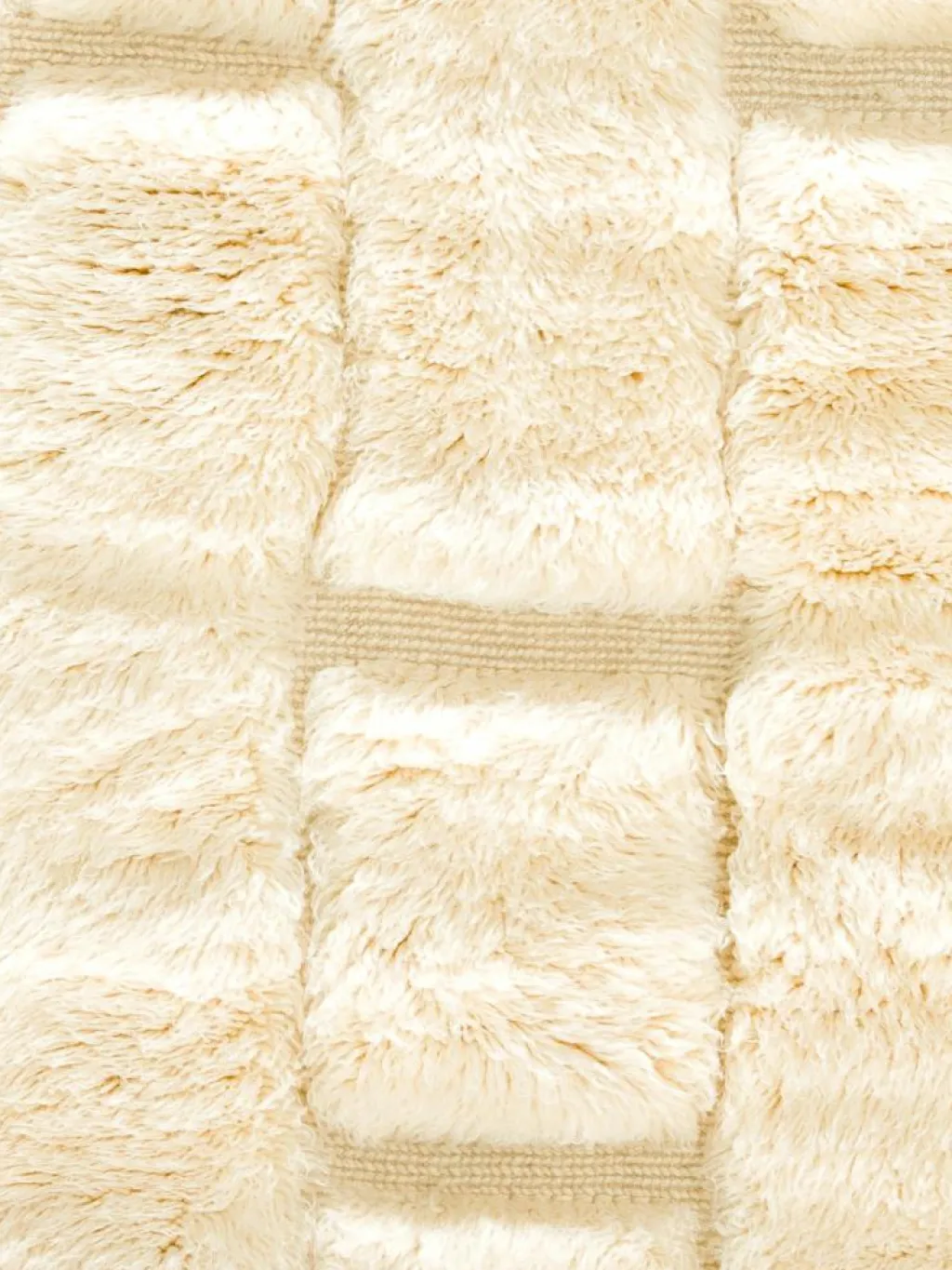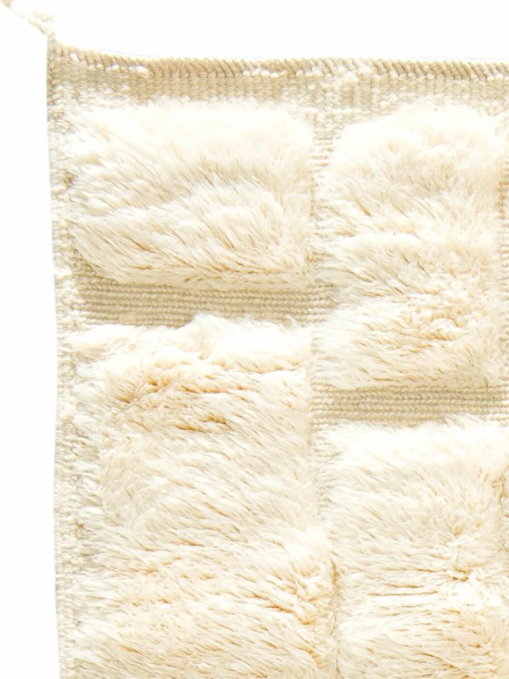 . Die Teppiche sind fast immer weißgrundig und zeichnen sich durch schwarze Zickzack-, Gitter- oder Rauten-Muster sowie einem wohnlich-zotteligen Flor aus. Kaum eine andere Teppichprovenienz passt mit ihren ursprünglichen nomadischen Designs besser in einen minimalistischen Wohnstil. Wie viele andere Nomadenteppiche auch, wurden dieBeni Ourain
