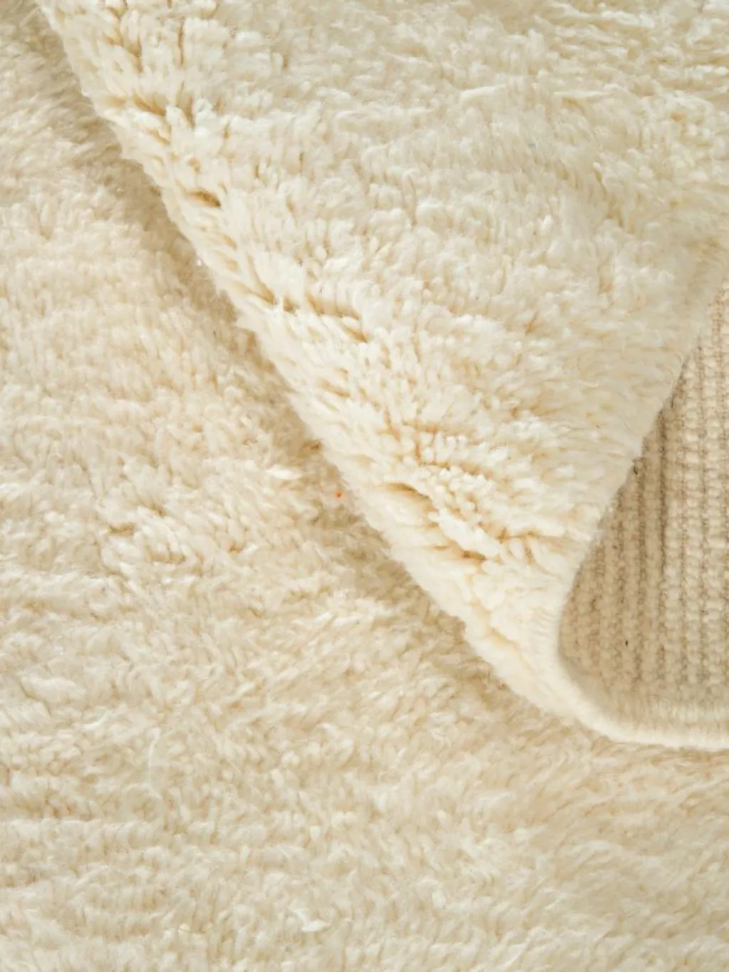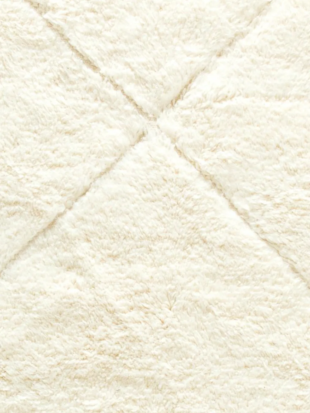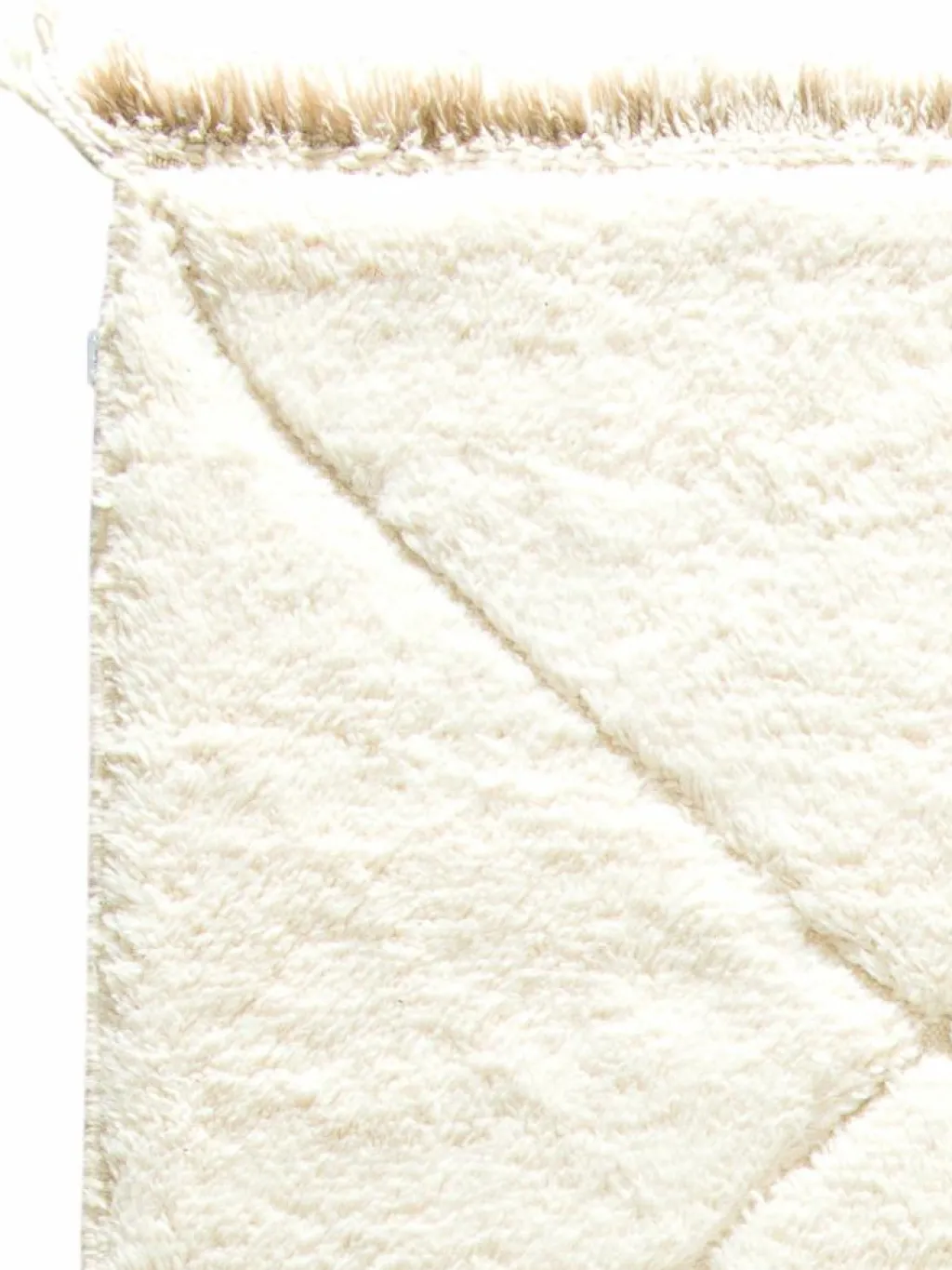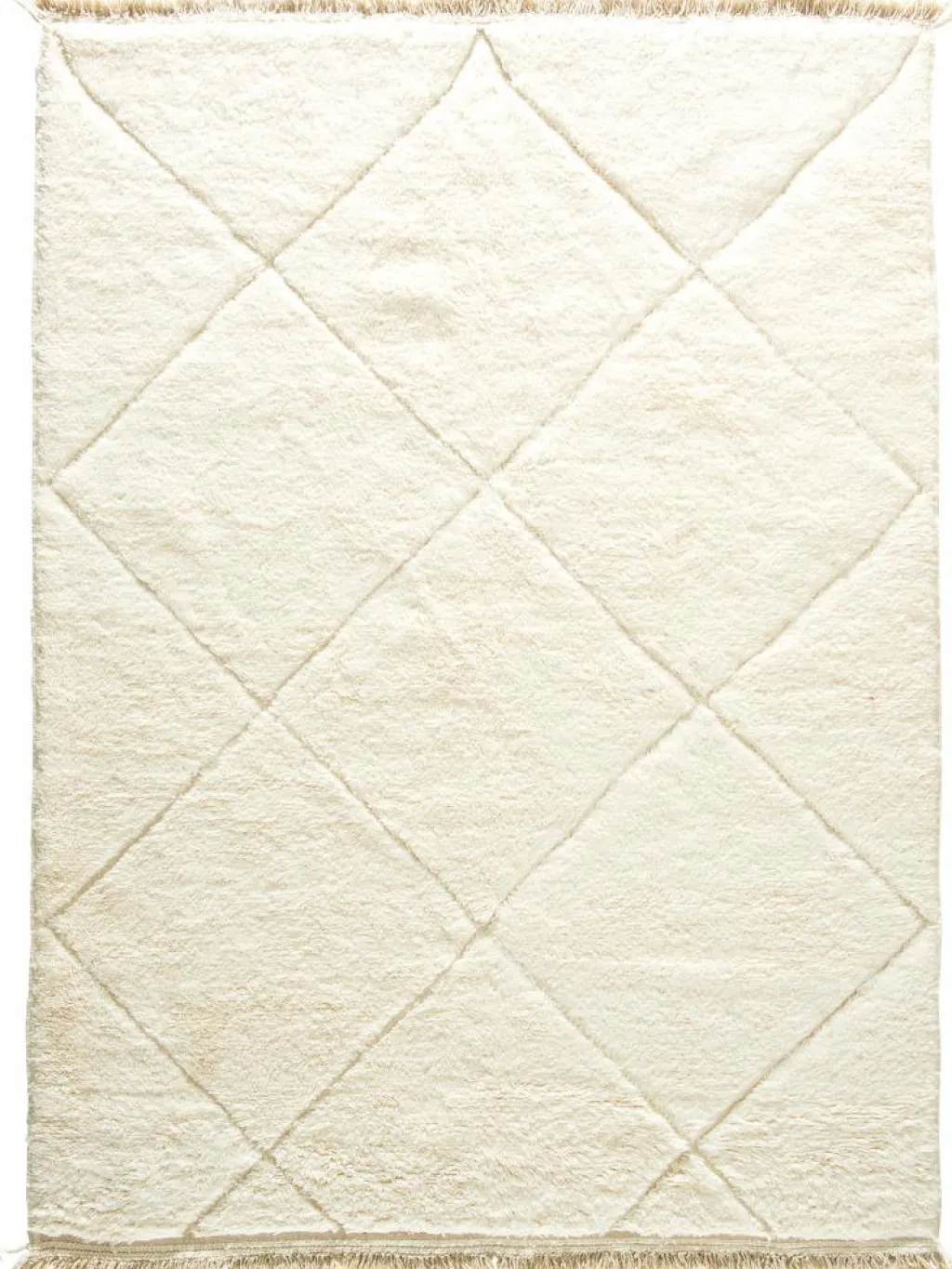 . Die Teppiche sind fast immer weißgrundig und zeichnen sich durch schwarze Zickzack-, Gitter- oder Rauten-Muster sowie einem wohnlich-zotteligen Flor aus. Kaum eine andere Teppichprovenienz passt mit ihren ursprünglichen nomadischen Designs besser in einen minimalistischen Wohnstil. Wie viele andere Nomadenteppiche auch, wurden dieBeni Ourain