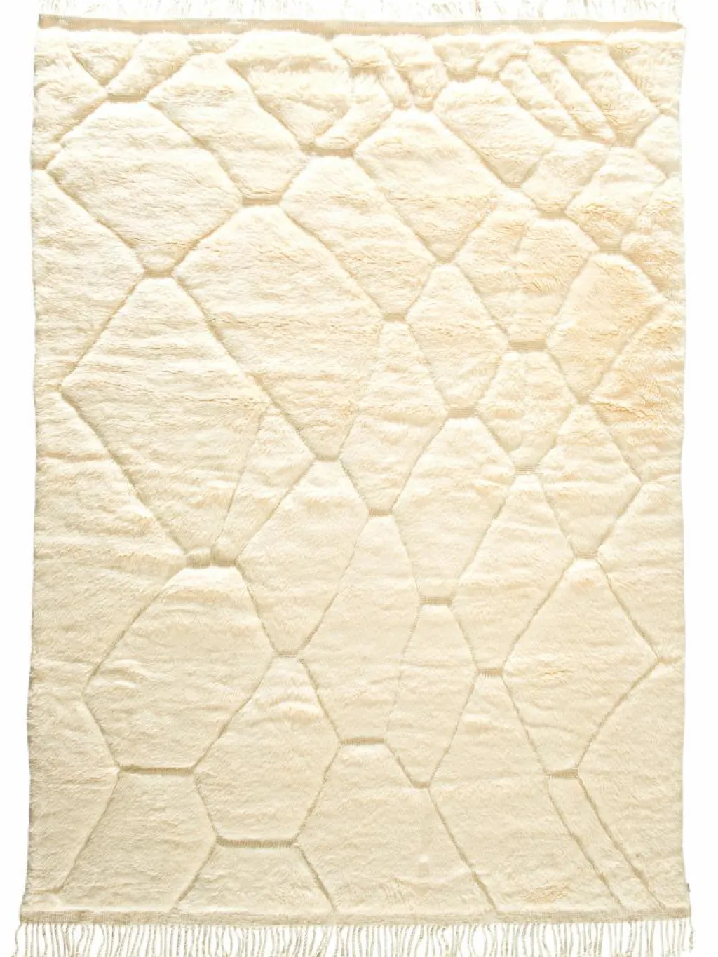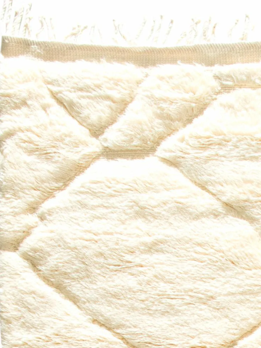 . Die Teppiche sind fast immer weißgrundig und zeichnen sich durch schwarze Zickzack-, Gitter- oder Rauten-Muster sowie einem wohnlich-zotteligen Flor aus. Kaum eine andere Teppichprovenienz passt mit ihren ursprünglichen nomadischen Designs besser in einen minimalistischen Wohnstil. Wie viele andere Nomadenteppiche auch, wurden dieBeni Ourain