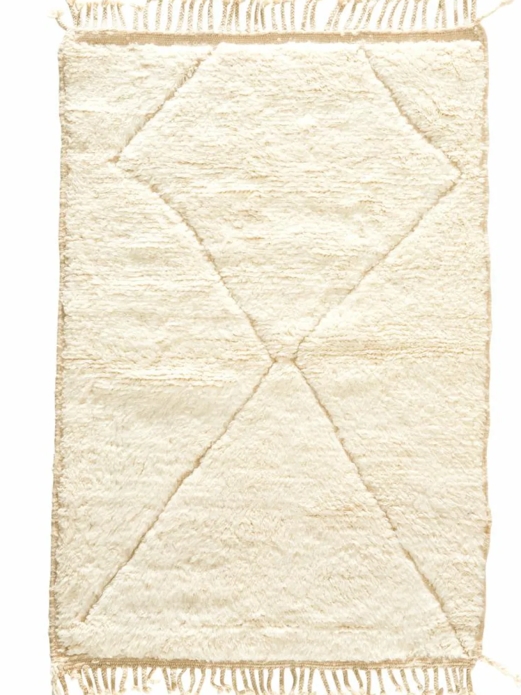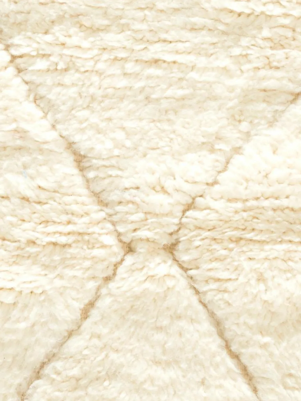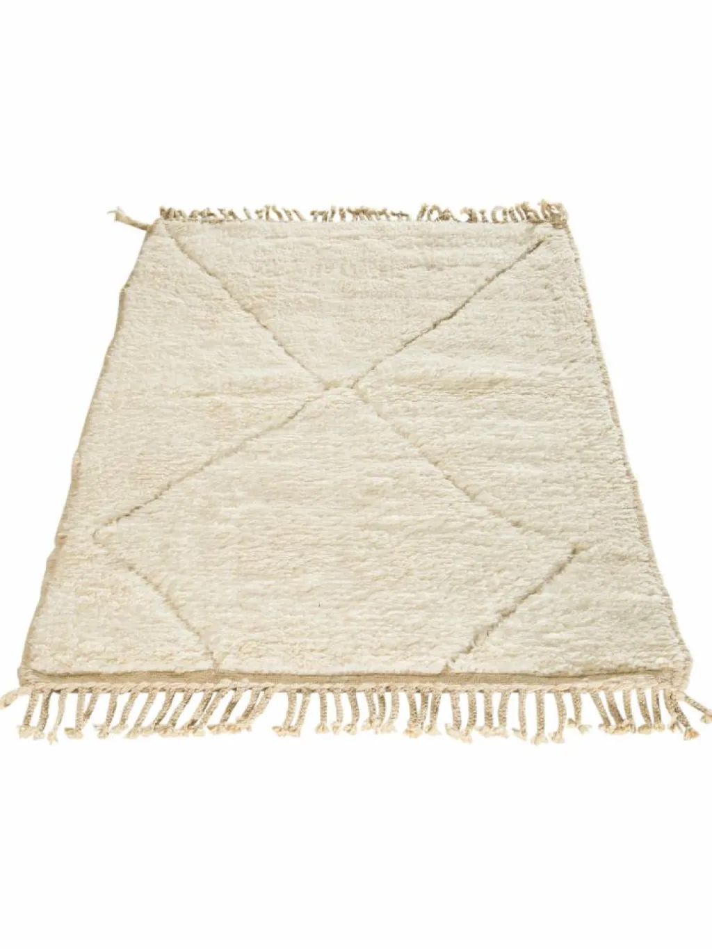 . Die Teppiche sind fast immer weißgrundig und zeichnen sich durch schwarze Zickzack-, Gitter- oder Rauten-Muster sowie einem wohnlich-zotteligen Flor aus. Kaum eine andere Teppichprovenienz passt mit ihren ursprünglichen nomadischen Designs besser in einen minimalistischen Wohnstil. Wie viele andere Nomadenteppiche auch, wurden dieBeni Ourain