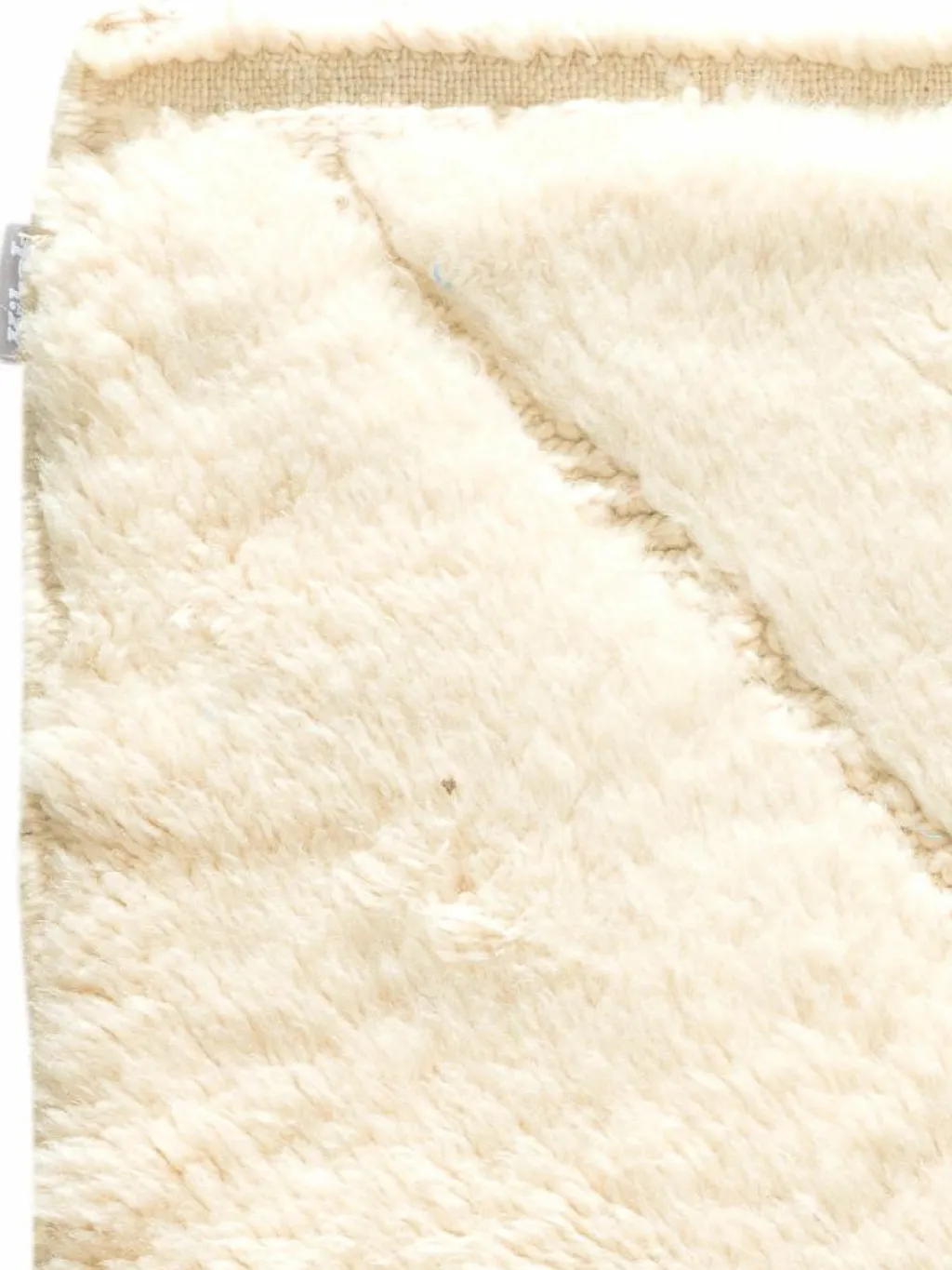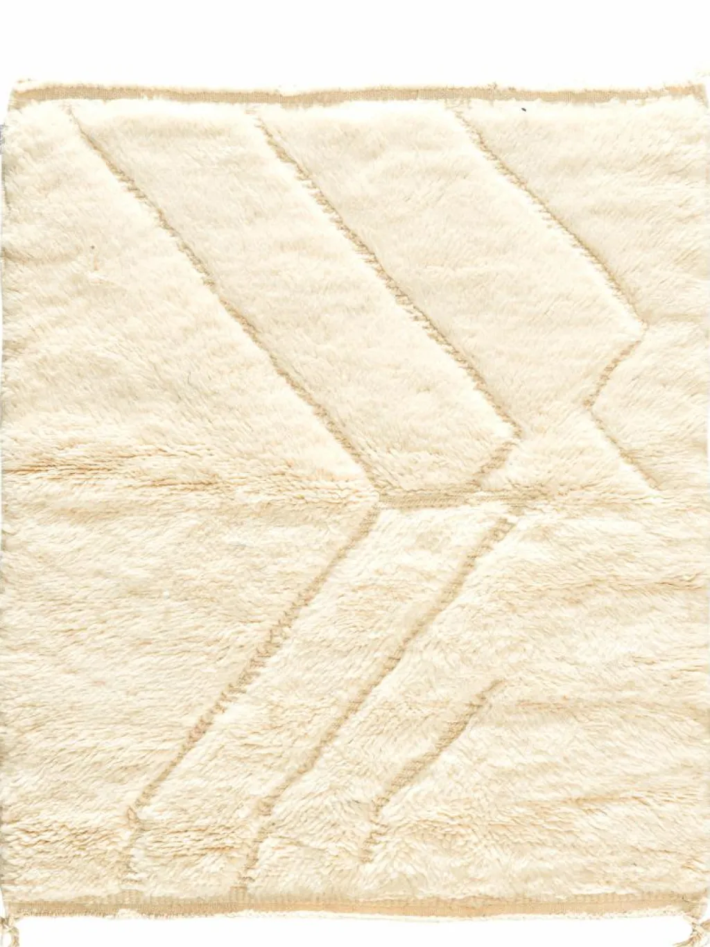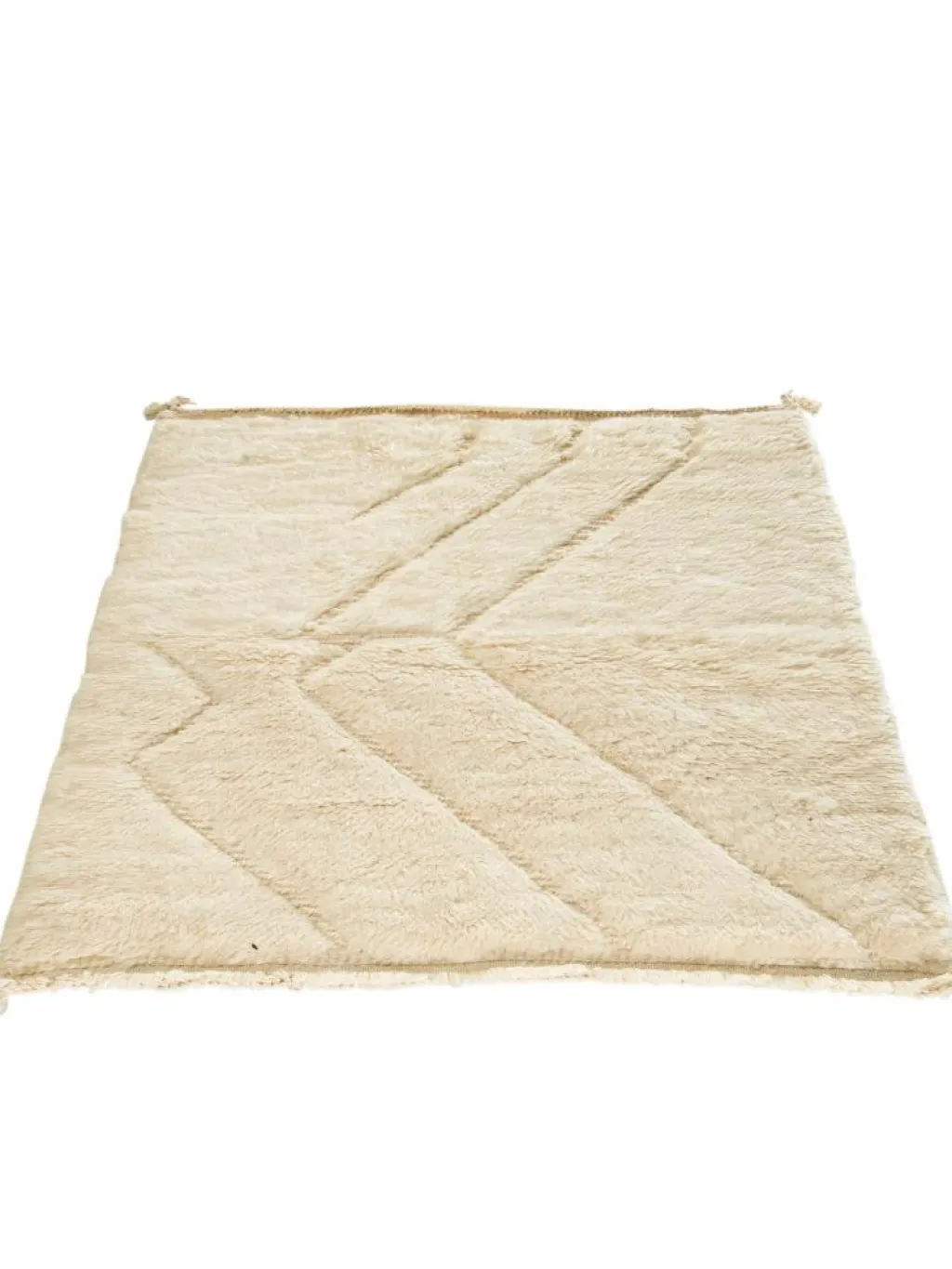 . Die Teppiche sind fast immer weißgrundig und zeichnen sich durch schwarze Zickzack-, Gitter- oder Rauten-Muster sowie einem wohnlich-zotteligen Flor aus. Kaum eine andere Teppichprovenienz passt mit ihren ursprünglichen nomadischen Designs besser in einen minimalistischen Wohnstil. Wie viele andere Nomadenteppiche auch, wurden dieBeni Ourain