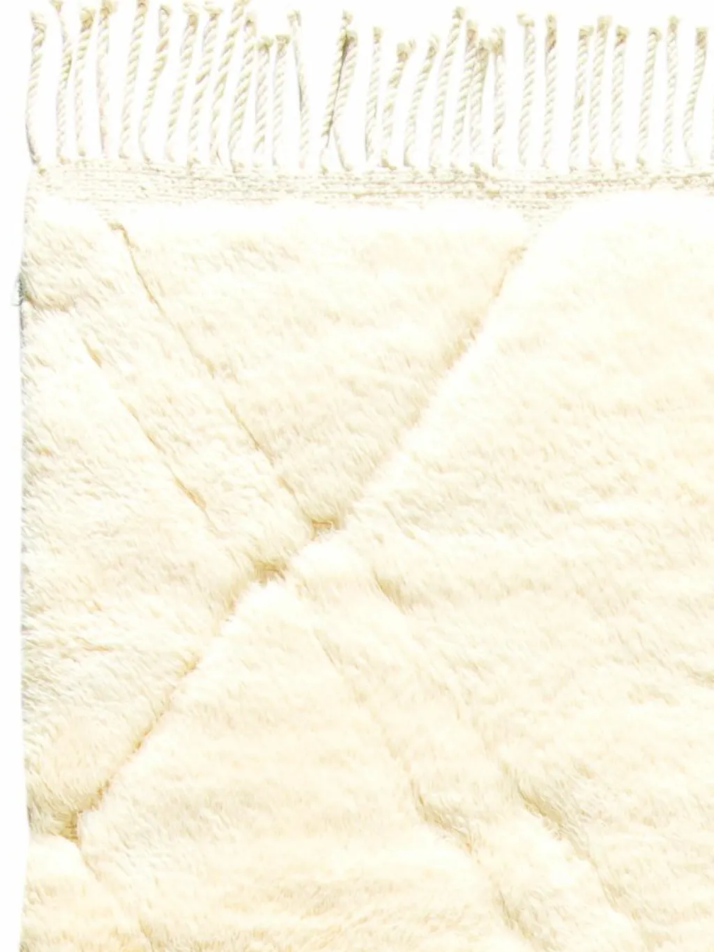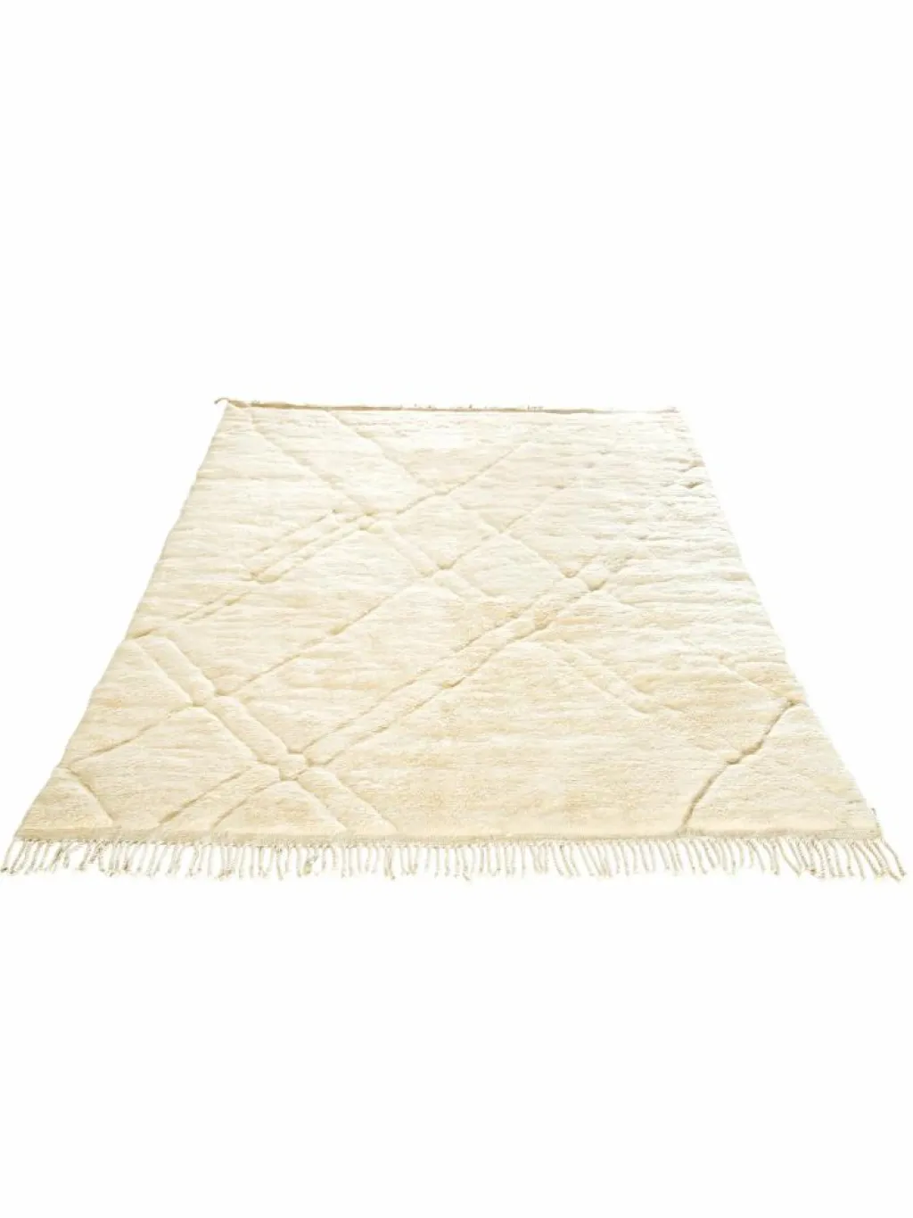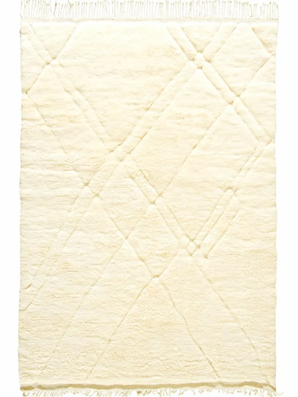 . Die Teppiche sind fast immer weißgrundig und zeichnen sich durch schwarze Zickzack-, Gitter- oder Rauten-Muster sowie einem wohnlich-zotteligen Flor aus. Kaum eine andere Teppichprovenienz passt mit ihren ursprünglichen nomadischen Designs besser in einen minimalistischen Wohnstil. Wie viele andere Nomadenteppiche auch, wurden dieBeni Ourain