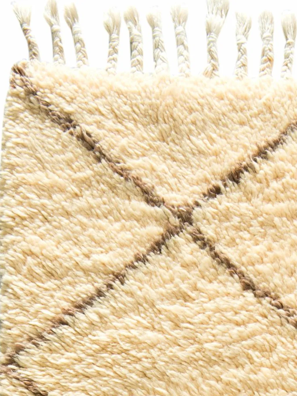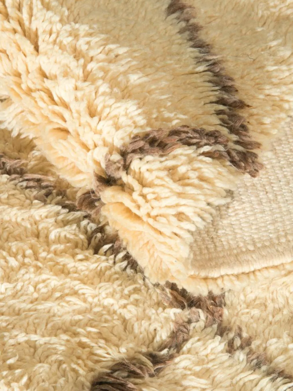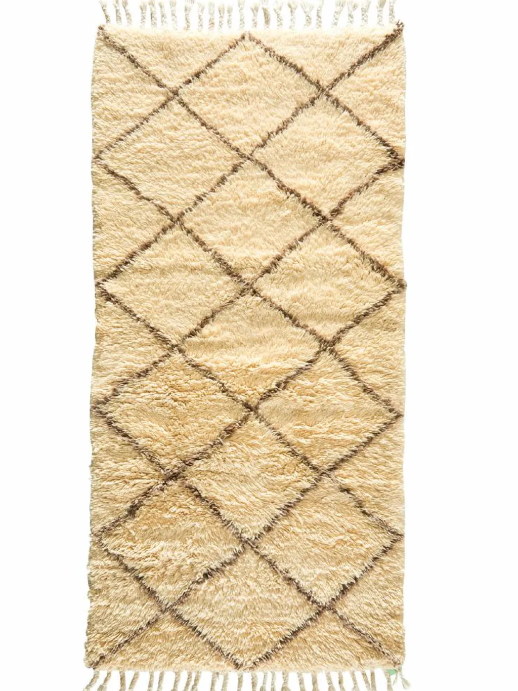 . Die Teppiche sind fast immer weißgrundig und zeichnen sich durch schwarze Zickzack-, Gitter- oder Rauten-Muster sowie einem wohnlich-zotteligen Flor aus. Kaum eine andere Teppichprovenienz passt mit ihren ursprünglichen nomadischen Designs besser in einen minimalistischen Wohnstil. Wie viele andere Nomadenteppiche auch, wurden dieBeni Ourain