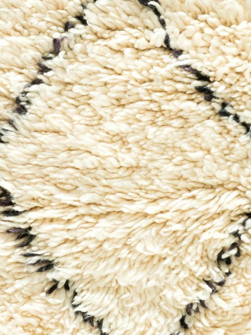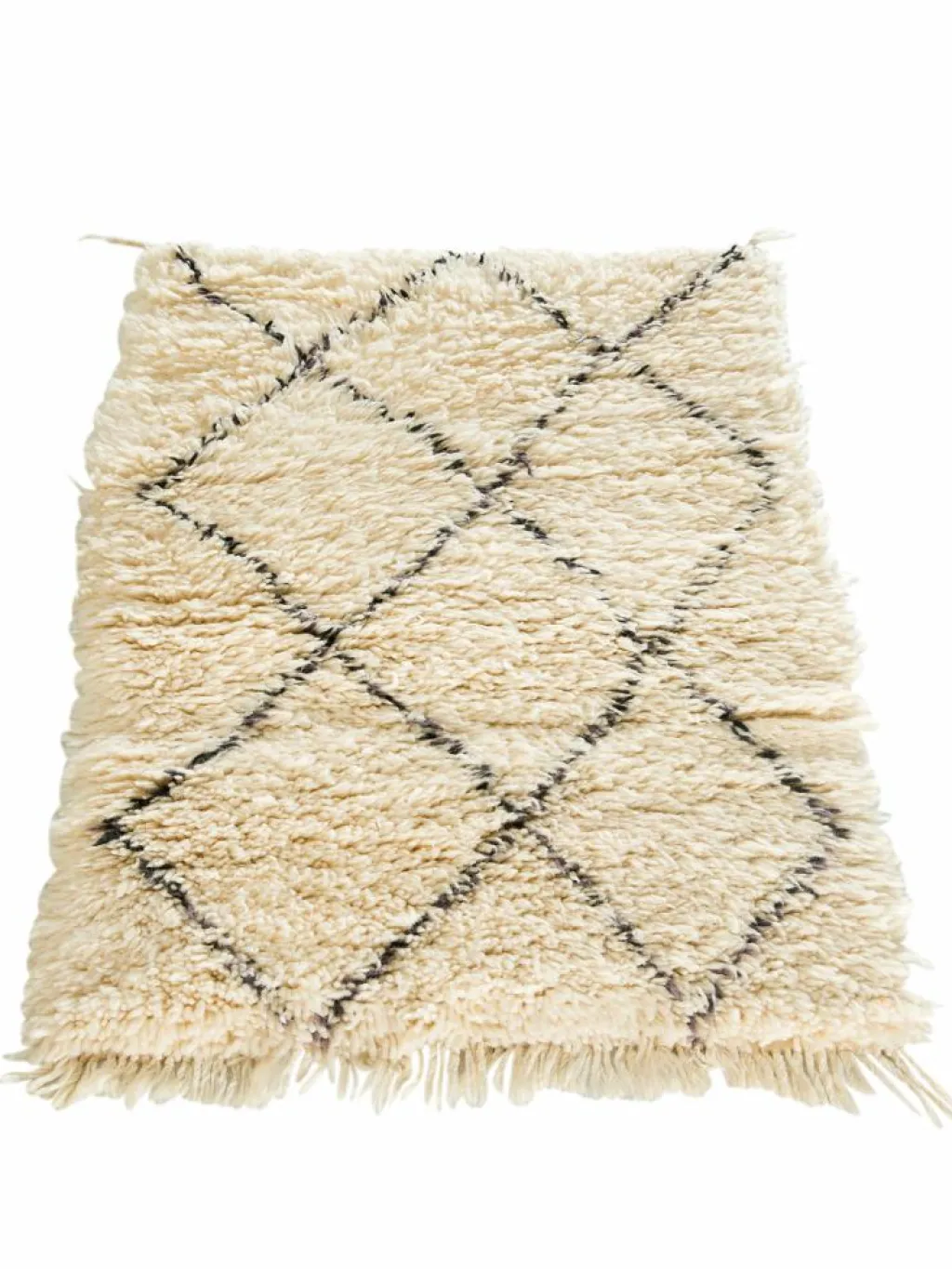 . Die Teppiche sind fast immer weißgrundig und zeichnen sich durch schwarze Zickzack-, Gitter- oder Rauten-Muster sowie einem wohnlich-zotteligen Flor aus. Kaum eine andere Teppichprovenienz passt mit ihren ursprünglichen nomadischen Designs besser in einen minimalistischen Wohnstil. Wie viele andere Nomadenteppiche auch, wurden dieBeni Ourain