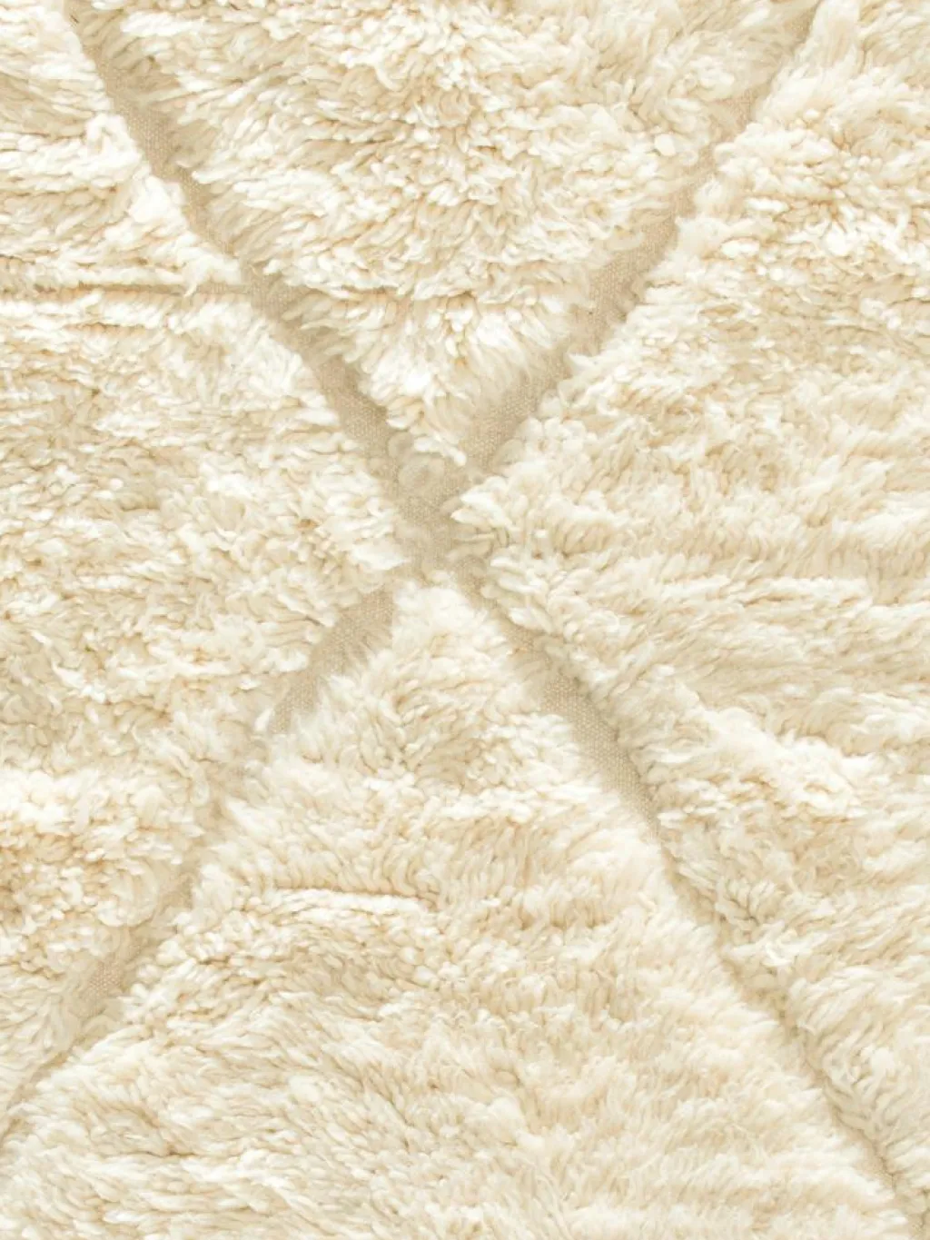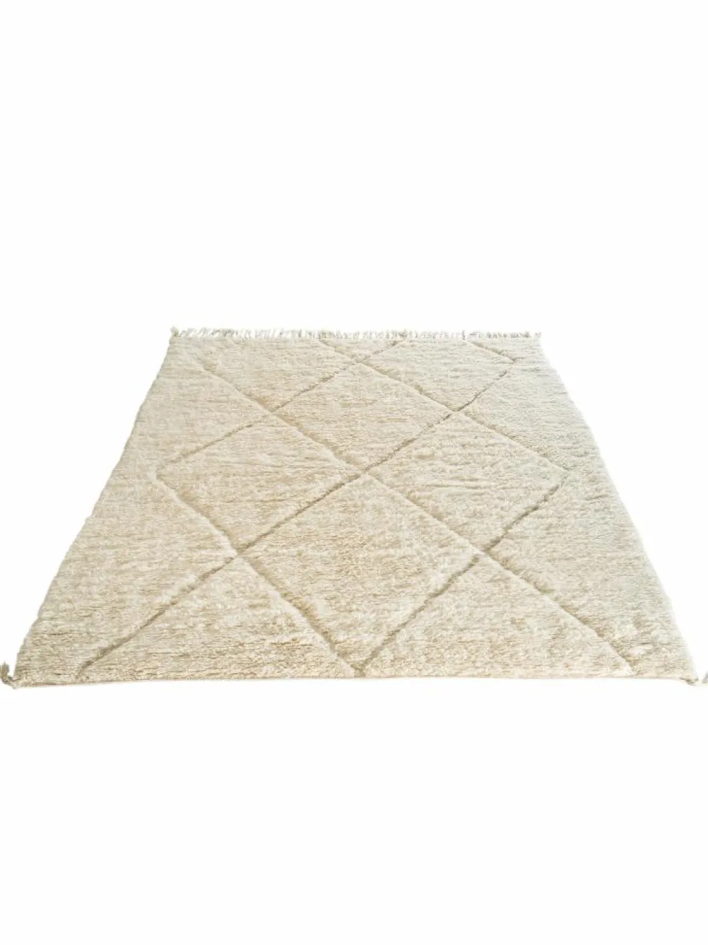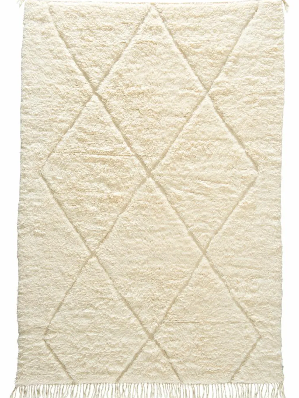 . Die Teppiche sind fast immer weißgrundig und zeichnen sich durch schwarze Zickzack-, Gitter- oder Rauten-Muster sowie einem wohnlich-zotteligen Flor aus. Kaum eine andere Teppichprovenienz passt mit ihren ursprünglichen nomadischen Designs besser in einen minimalistischen Wohnstil. Wie viele andere Nomadenteppiche auch, wurden dieBeni Ourain