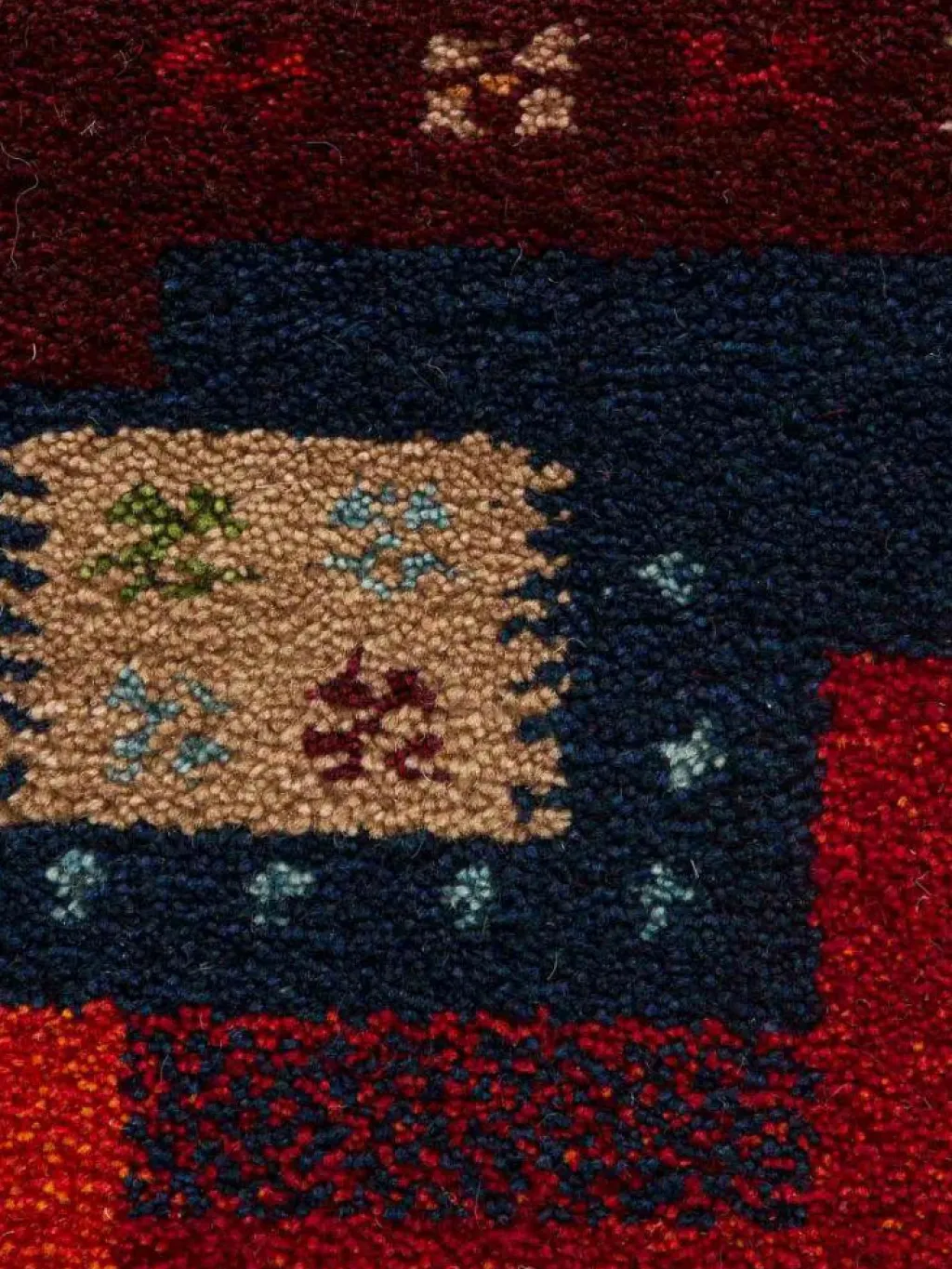 ist handgeknüpft. Ca. 5000 g pro m², ca. 53.000 Knoten pro m². Die typische vielfältige Musterung macht diesenGabbeh
