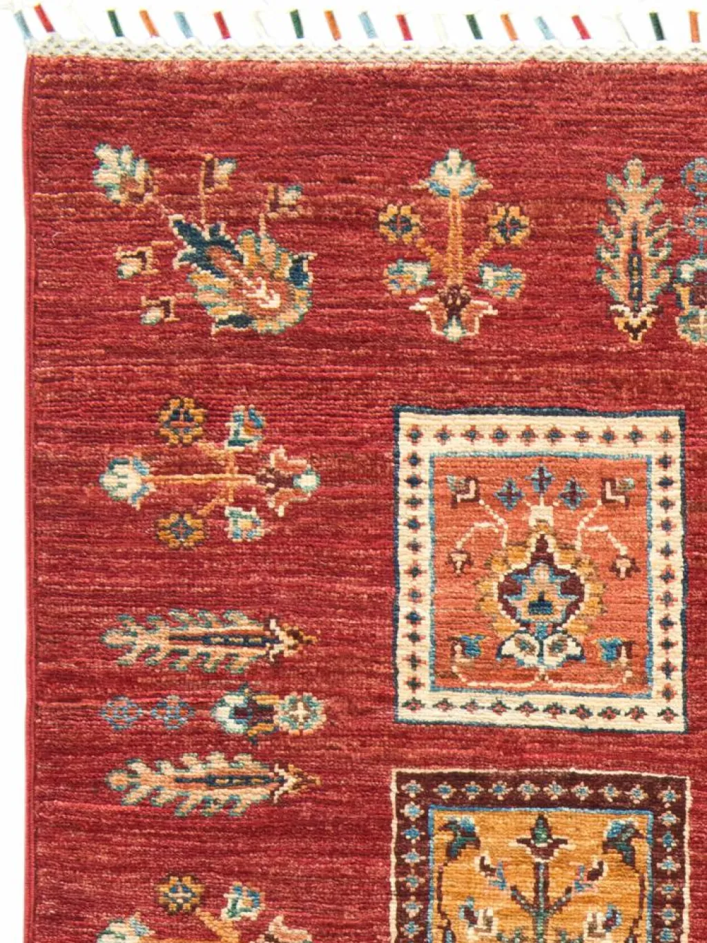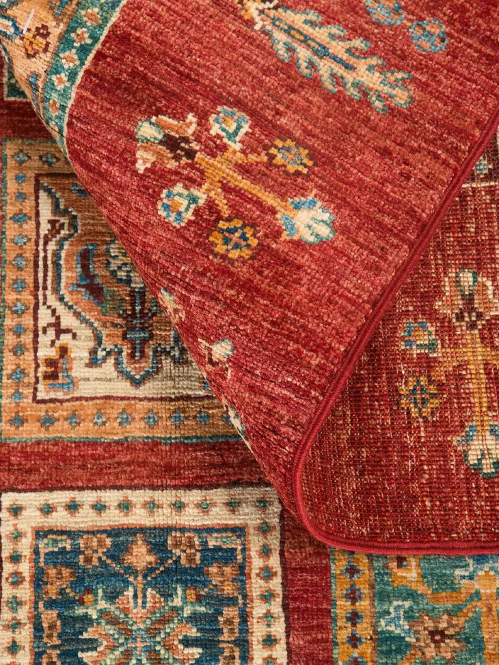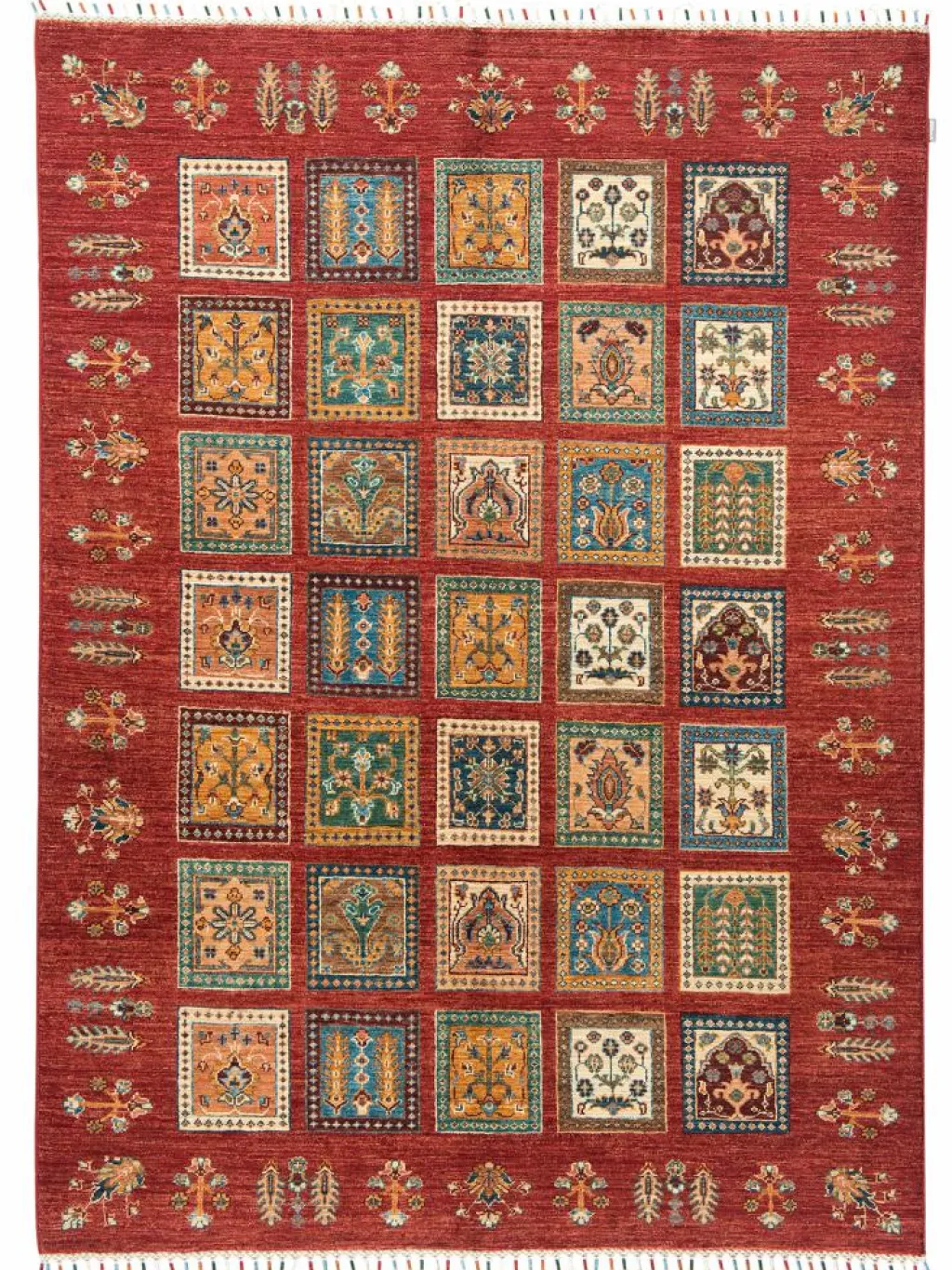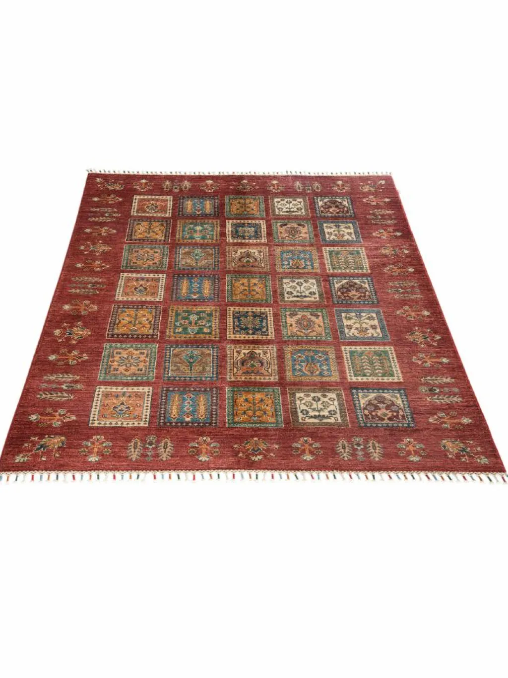 erinnert an einen üppig bewachsenen Garten mit geometrisch gegliederten, einzeln eingefassten Beeten zwischen denen die Bewässerungsgräben verlaufen. Durch den flachen und festen Flor ist der Teppich unempfindlich gegenüber den Belastungen des Alltags.- Das Besondere an diesemOrientteppich