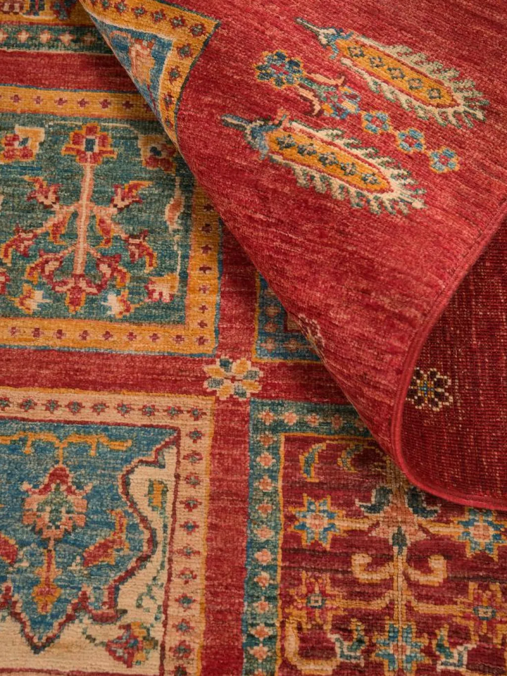 erinnert an einen üppig bewachsenen Garten mit geometrisch gegliederten, einzeln eingefassten Beeten zwischen denen die Bewässerungsgräben verlaufen. Durch den flachen und festen Flor ist der Teppich unempfindlich gegenüber den Belastungen des Alltags.- Das Besondere an diesemOrientteppich