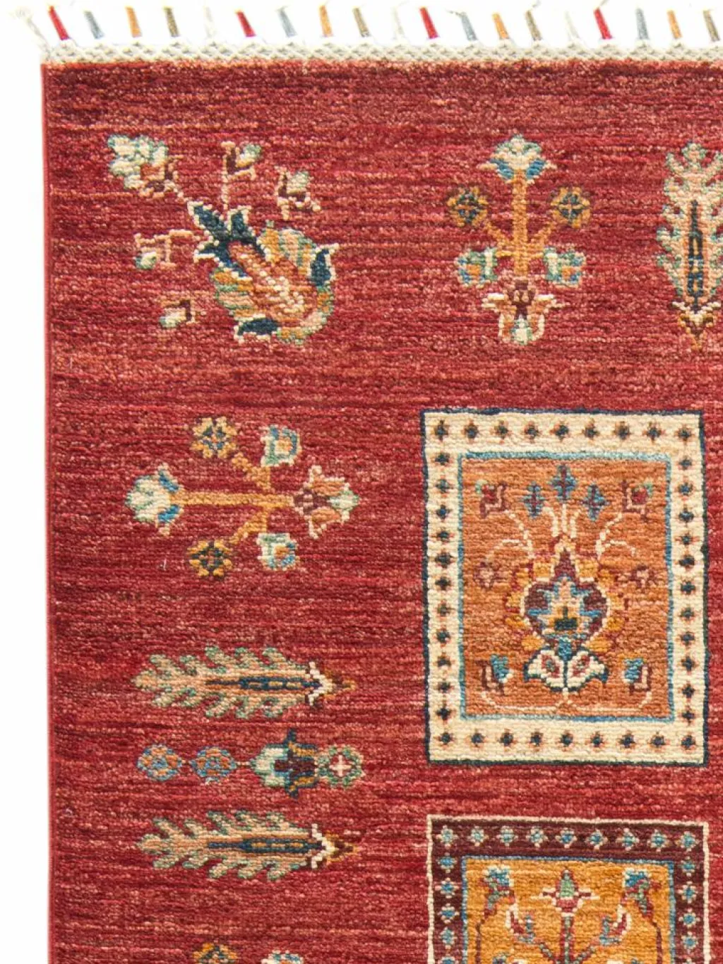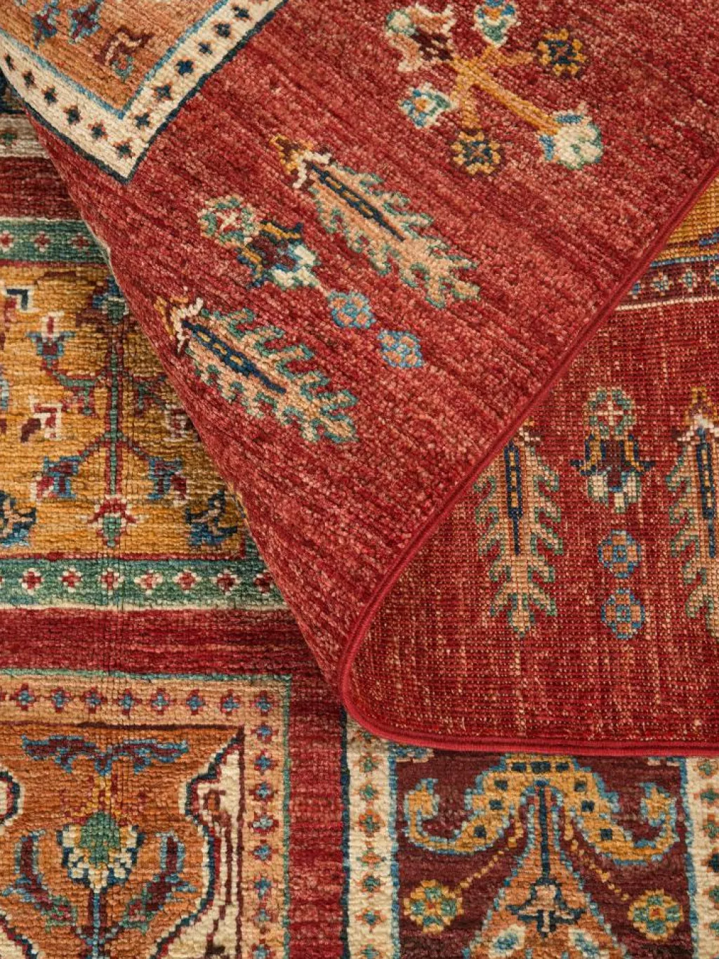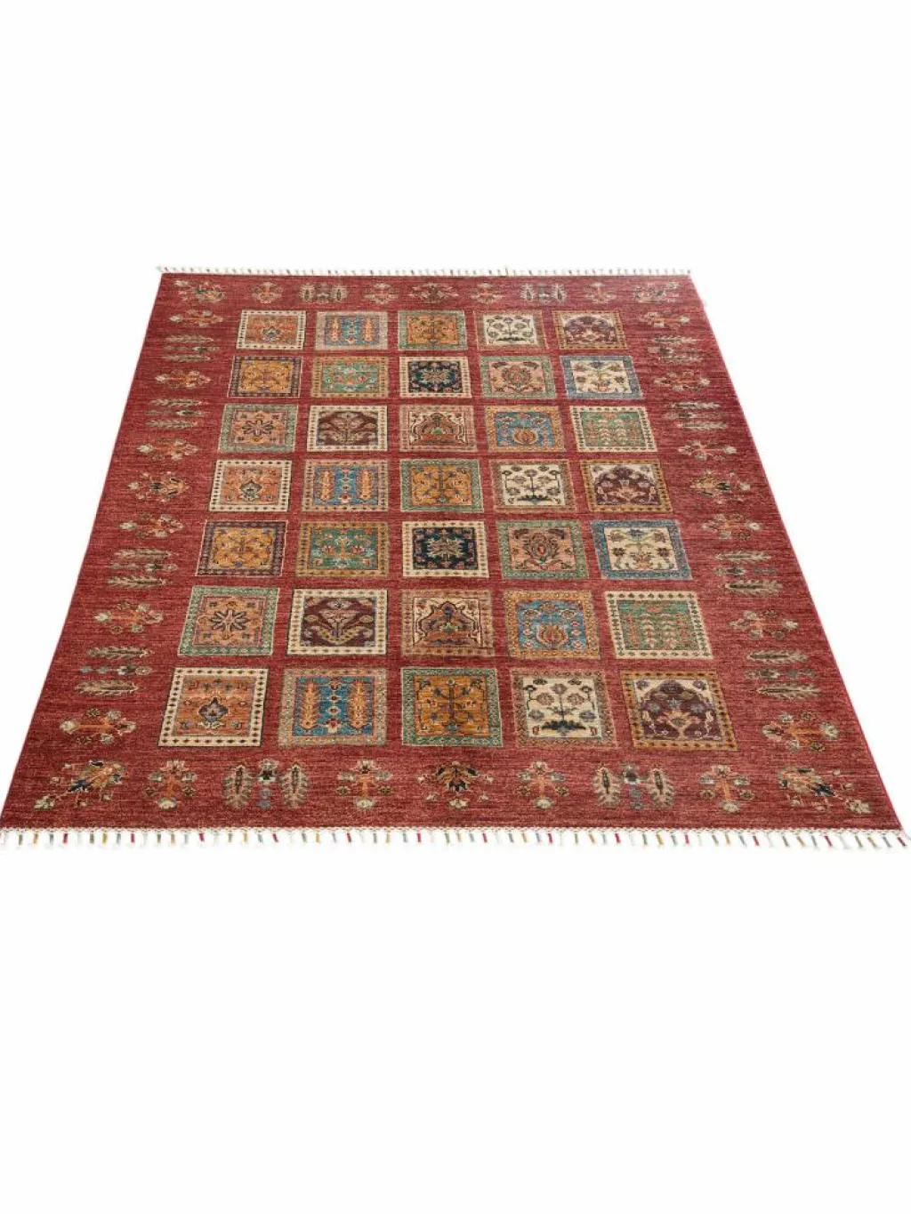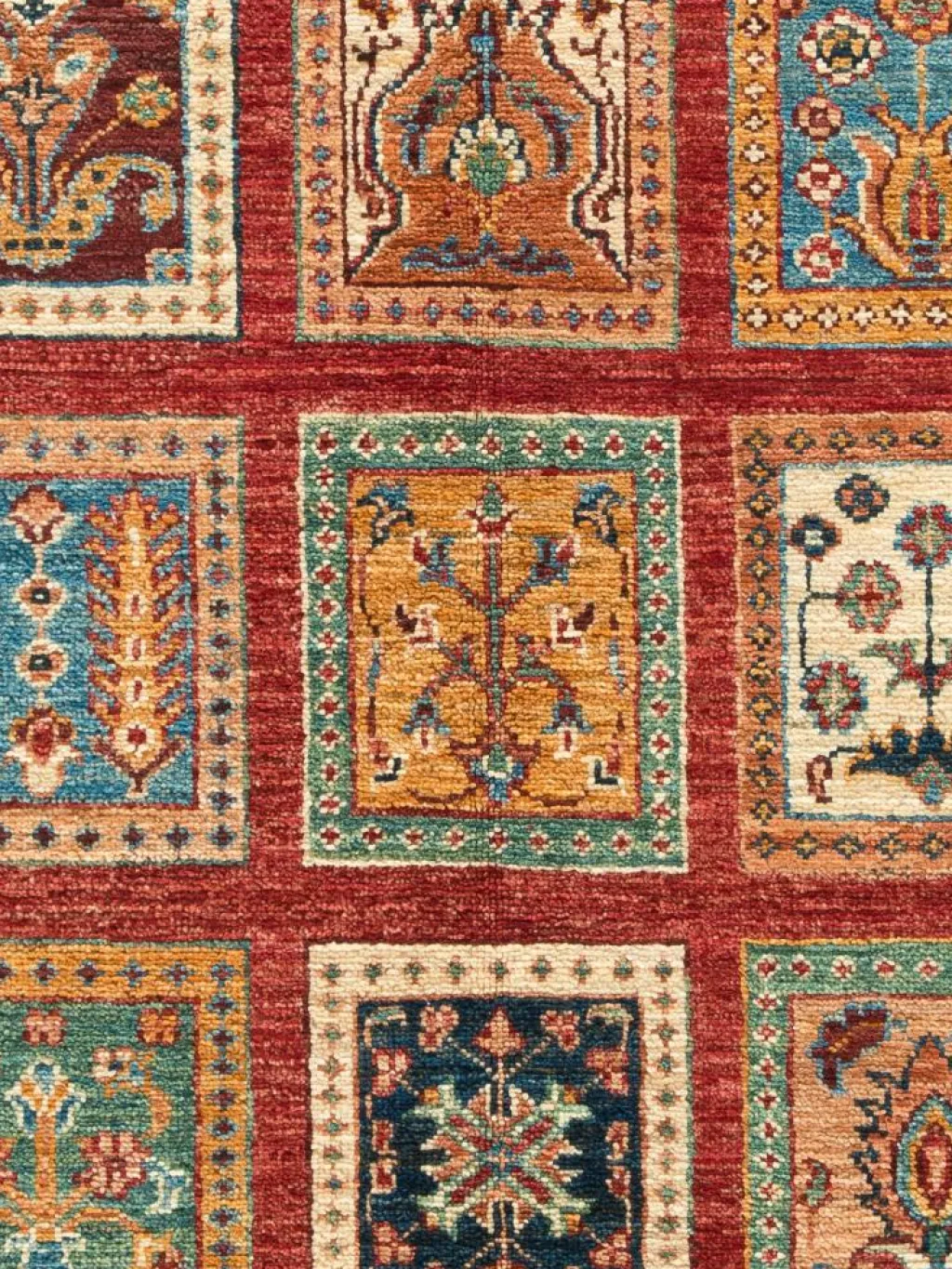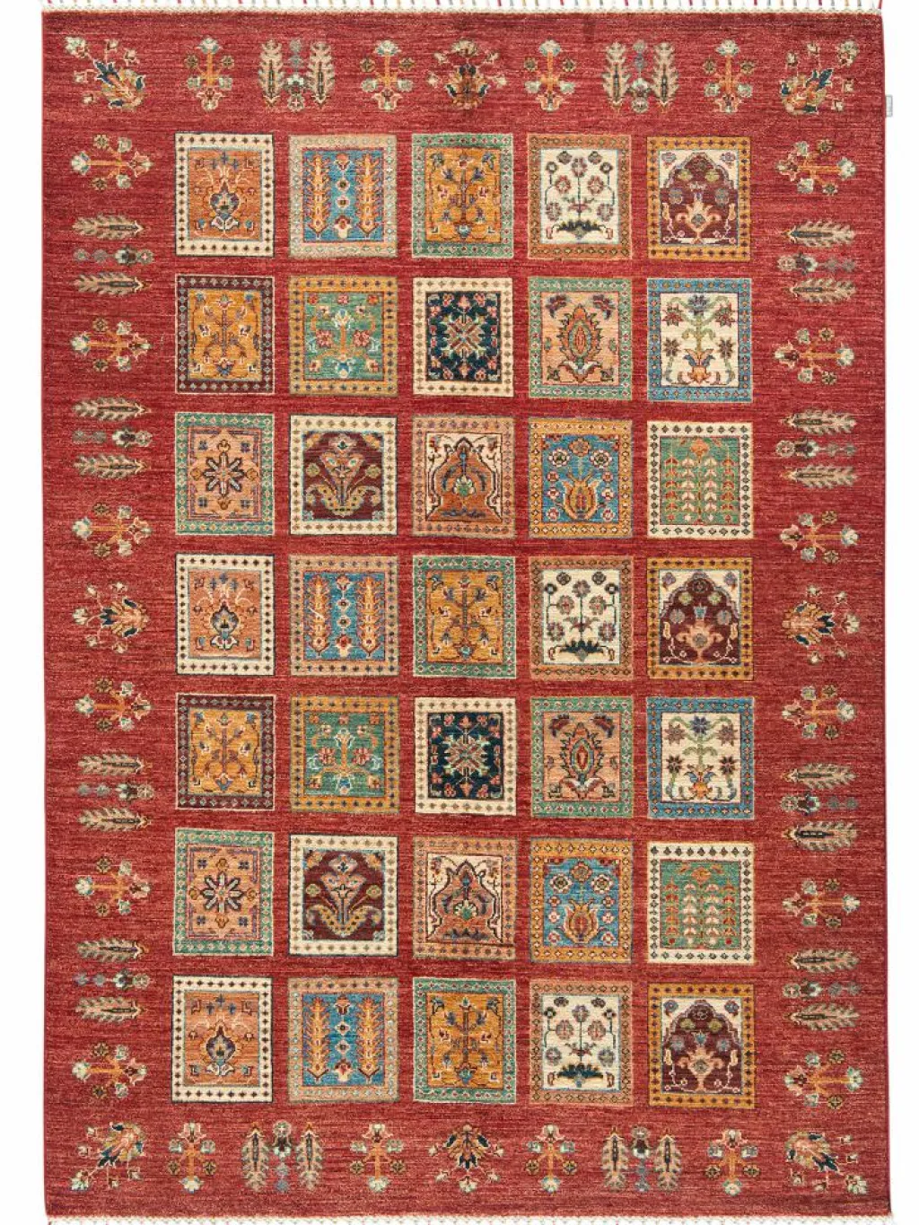 erinnert an einen üppig bewachsenen Garten mit geometrisch gegliederten, einzeln eingefassten Beeten zwischen denen die Bewässerungsgräben verlaufen. Durch den flachen und festen Flor ist der Teppich unempfindlich gegenüber den Belastungen des Alltags.- Das Besondere an diesemOrientteppich