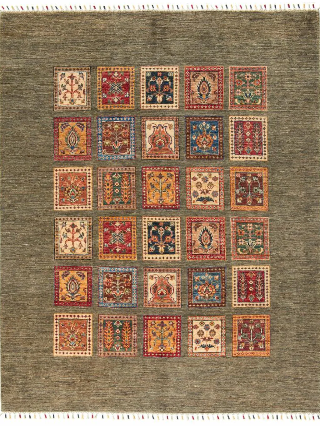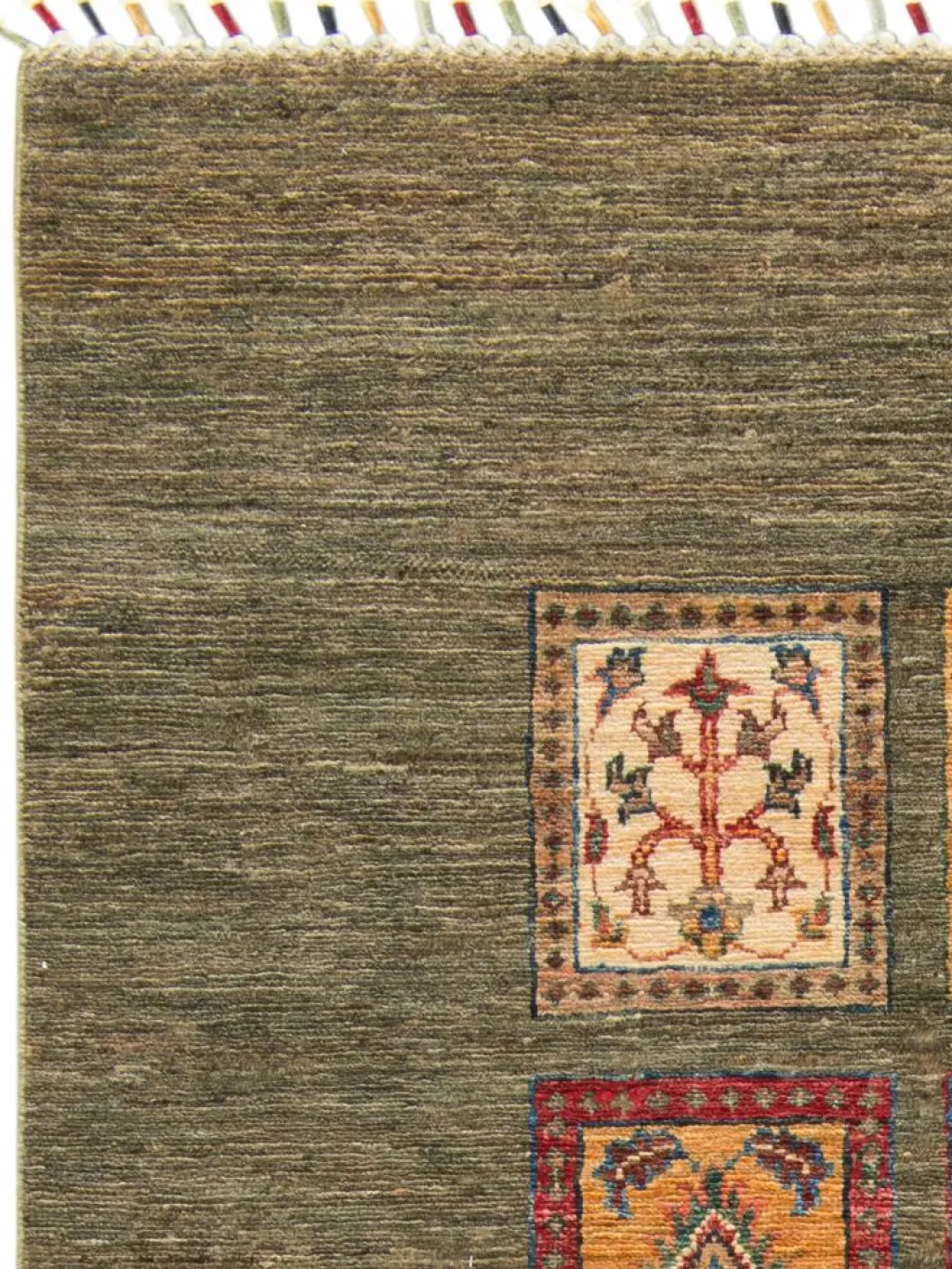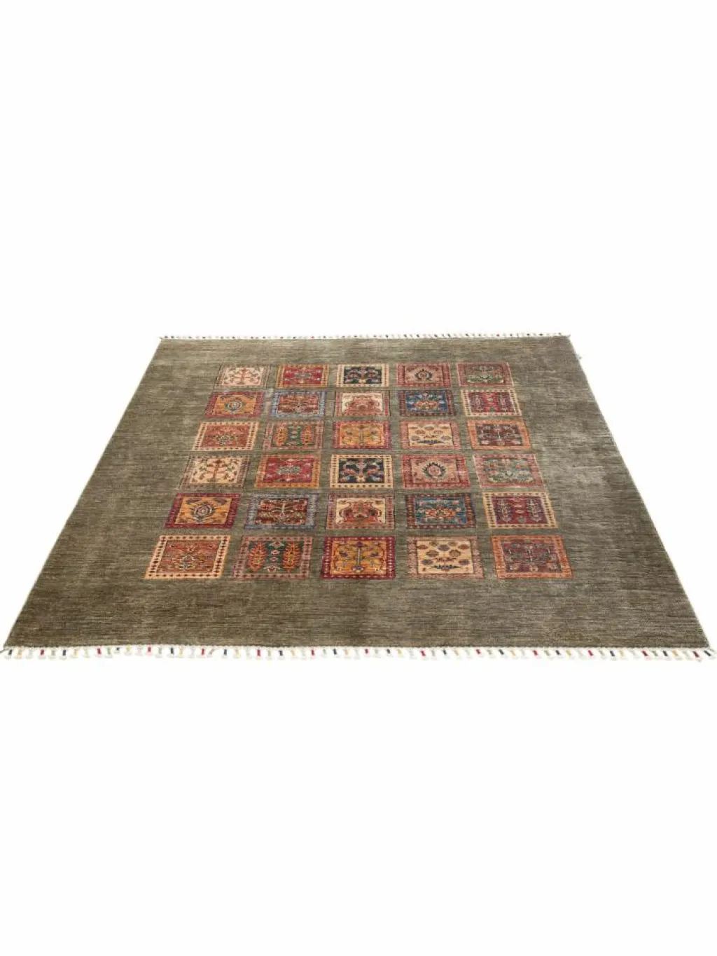 erinnert an einen üppig bewachsenen Garten mit geometrisch gegliederten, einzeln eingefassten Beeten zwischen denen die Bewässerungsgräben verlaufen. Durch den flachen und festen Flor ist der Teppich unempfindlich gegenüber den Belastungen des Alltags. – Das Besondere an diesemOrientteppich