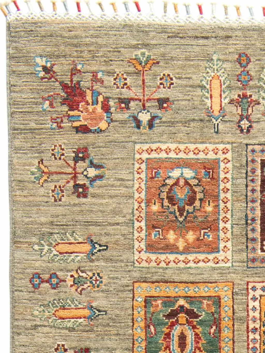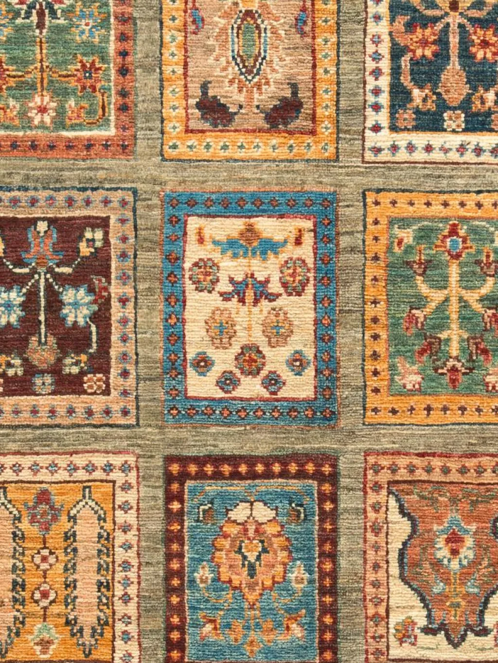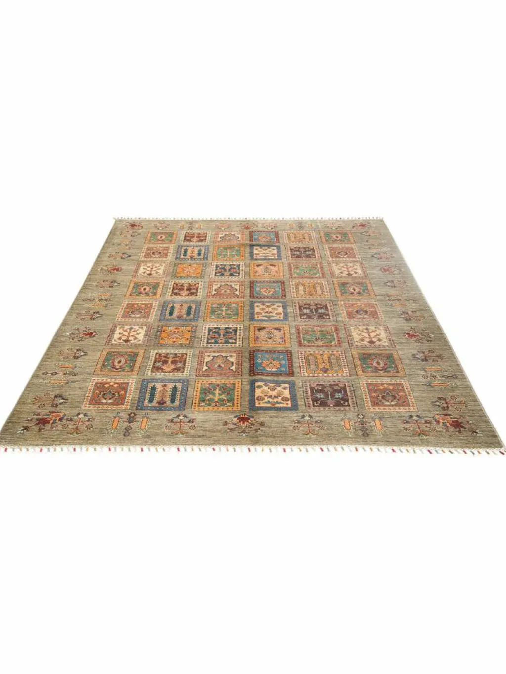 erinnert an einen üppig bewachsenen Garten mit geometrisch gegliederten, einzeln eingefassten Beeten zwischen denen die Bewässerungsgräben verlaufen. Durch den flachen und festen Flor ist der Teppich unempfindlich gegenüber den Belastungen des Alltags.- Das Besondere an diesemOrientteppich