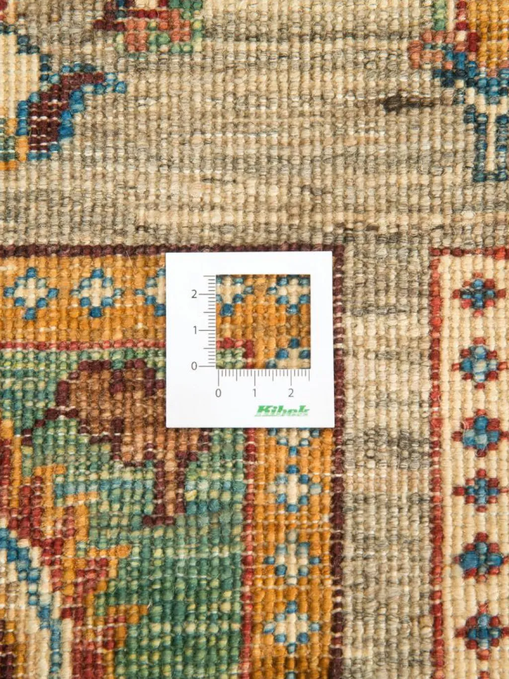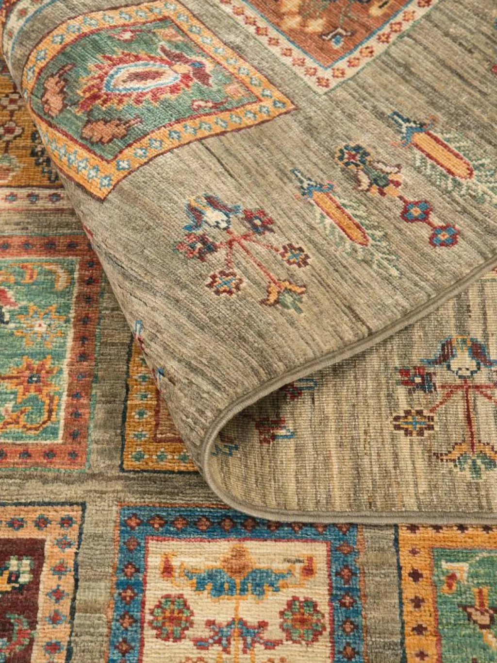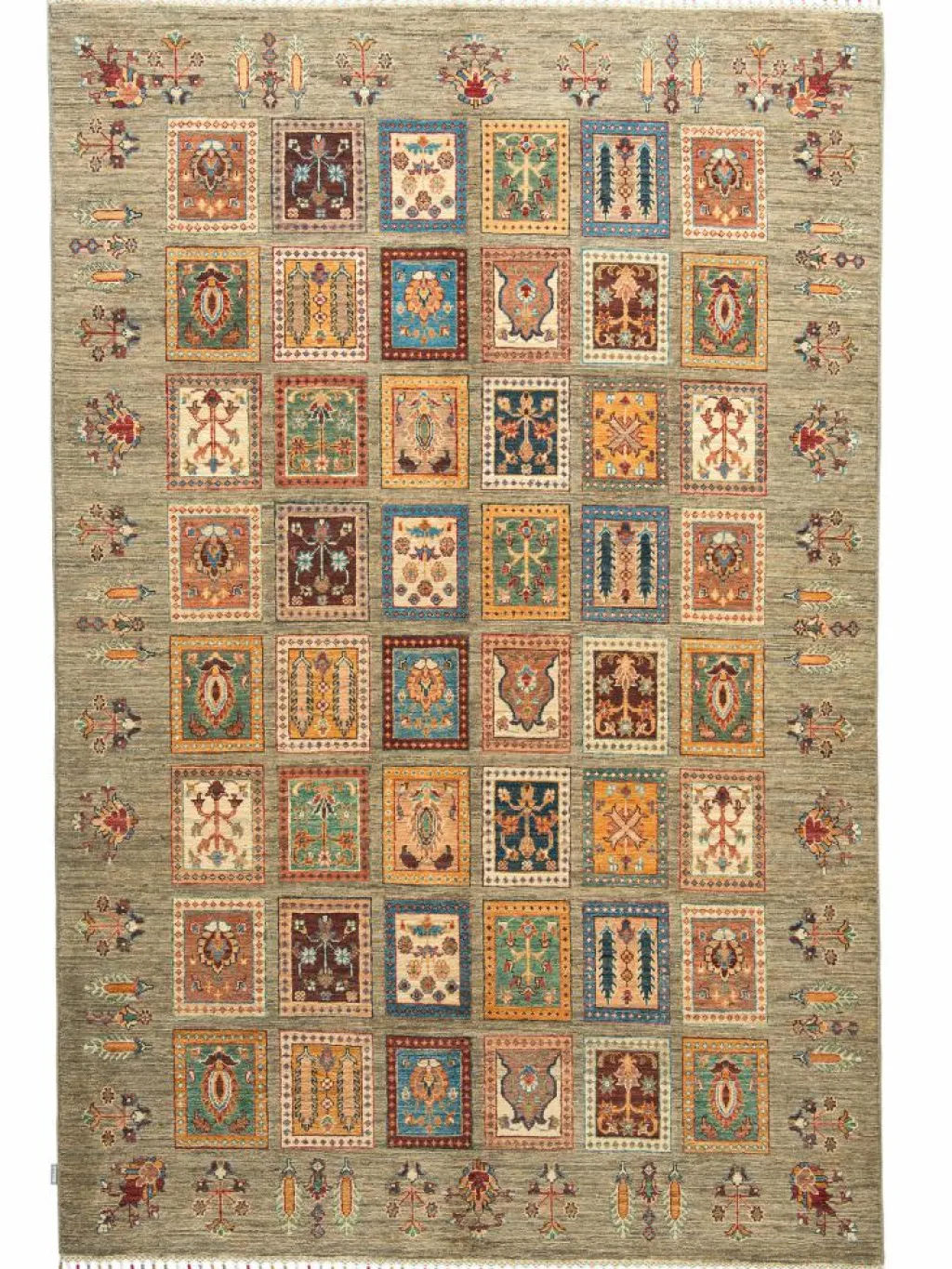 erinnert an einen üppig bewachsenen Garten mit geometrisch gegliederten, einzeln eingefassten Beeten zwischen denen die Bewässerungsgräben verlaufen. Durch den flachen und festen Flor ist der Teppich unempfindlich gegenüber den Belastungen des Alltags.- Das Besondere an diesemOrientteppich
