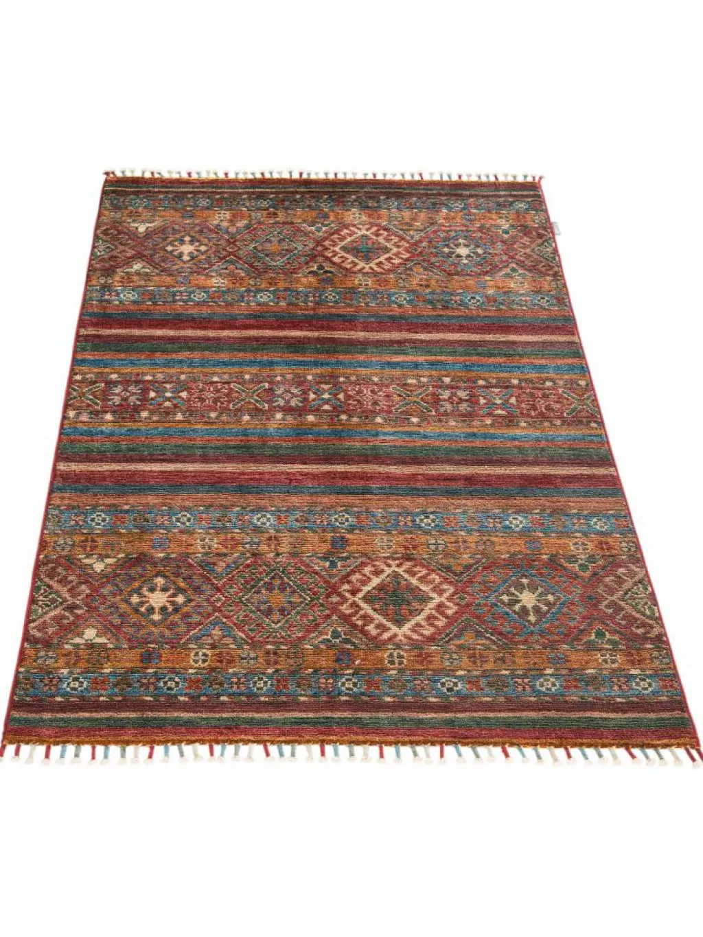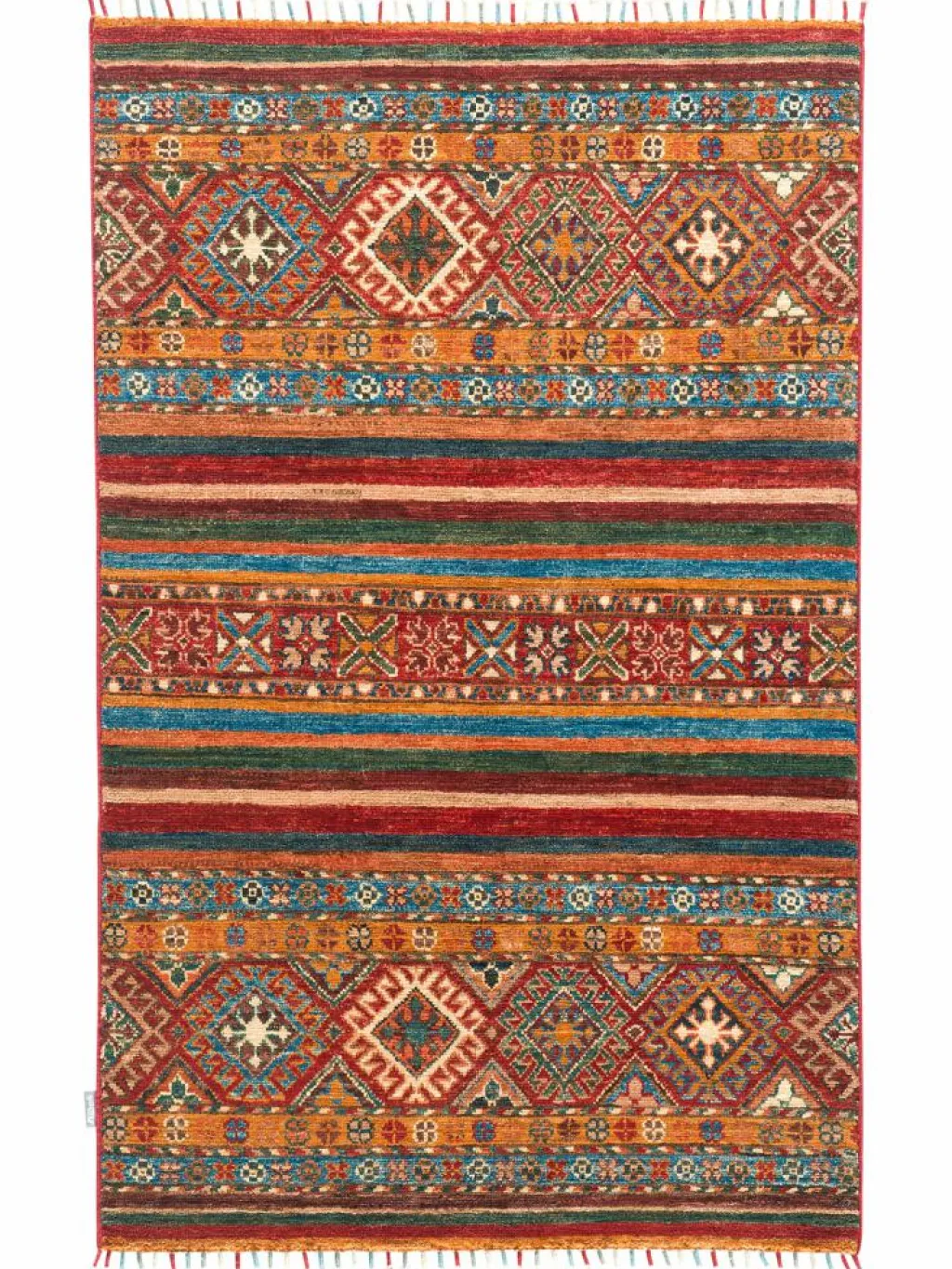 -Muster sind bunte Längsstreifen mit vielen verschiedenen Motiven gefüllt. Durch den flachen und festen Flor ist der Teppich unempfindlich gegenüber den Belastungen des Alltags.- Das Besondere an diesemOrientteppich