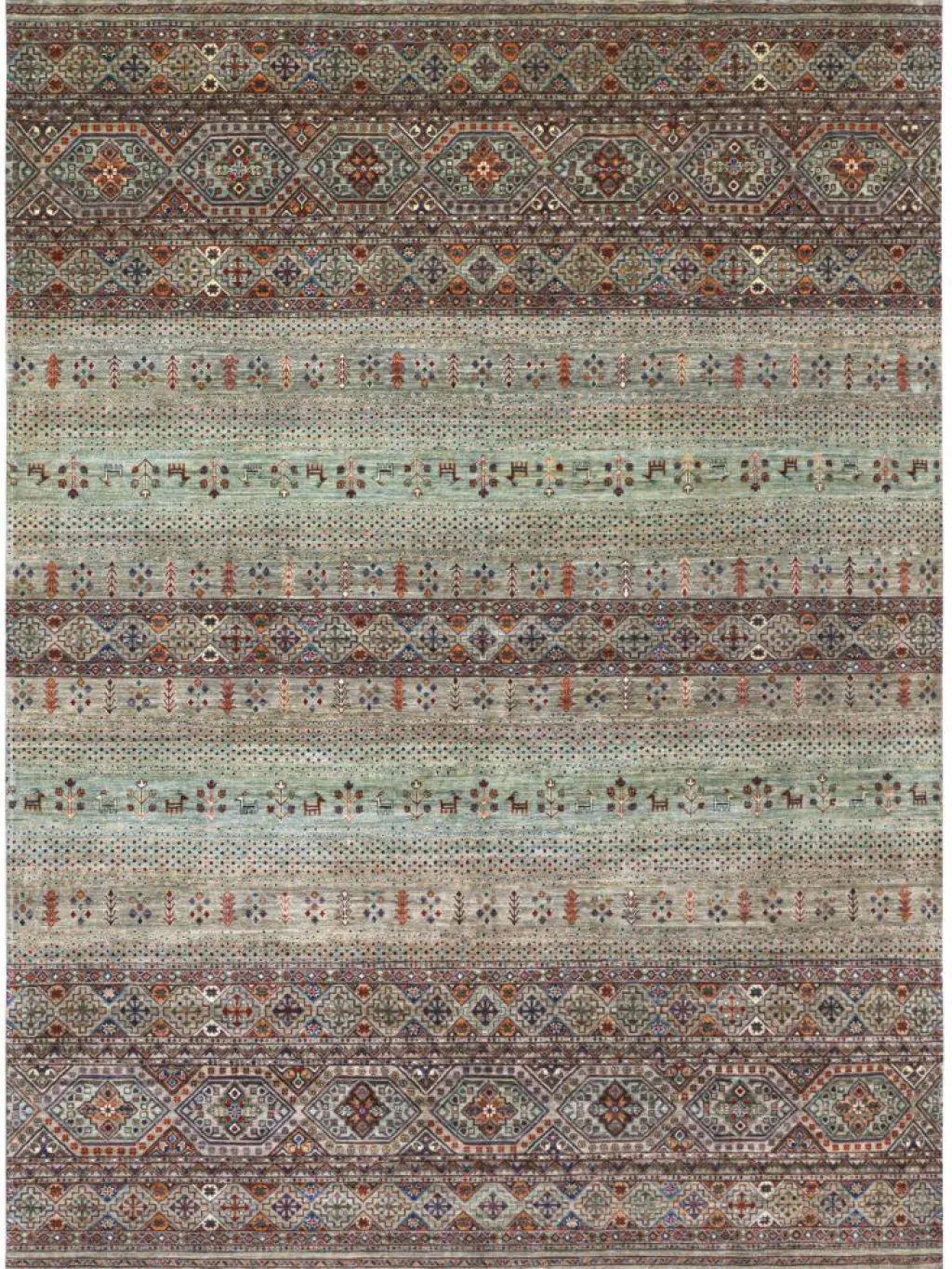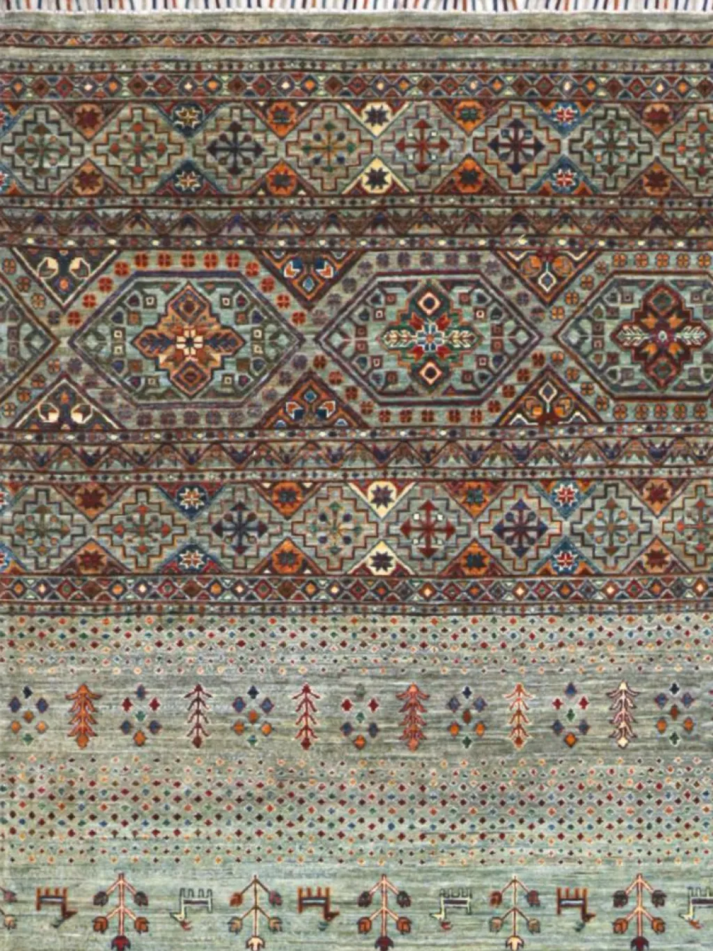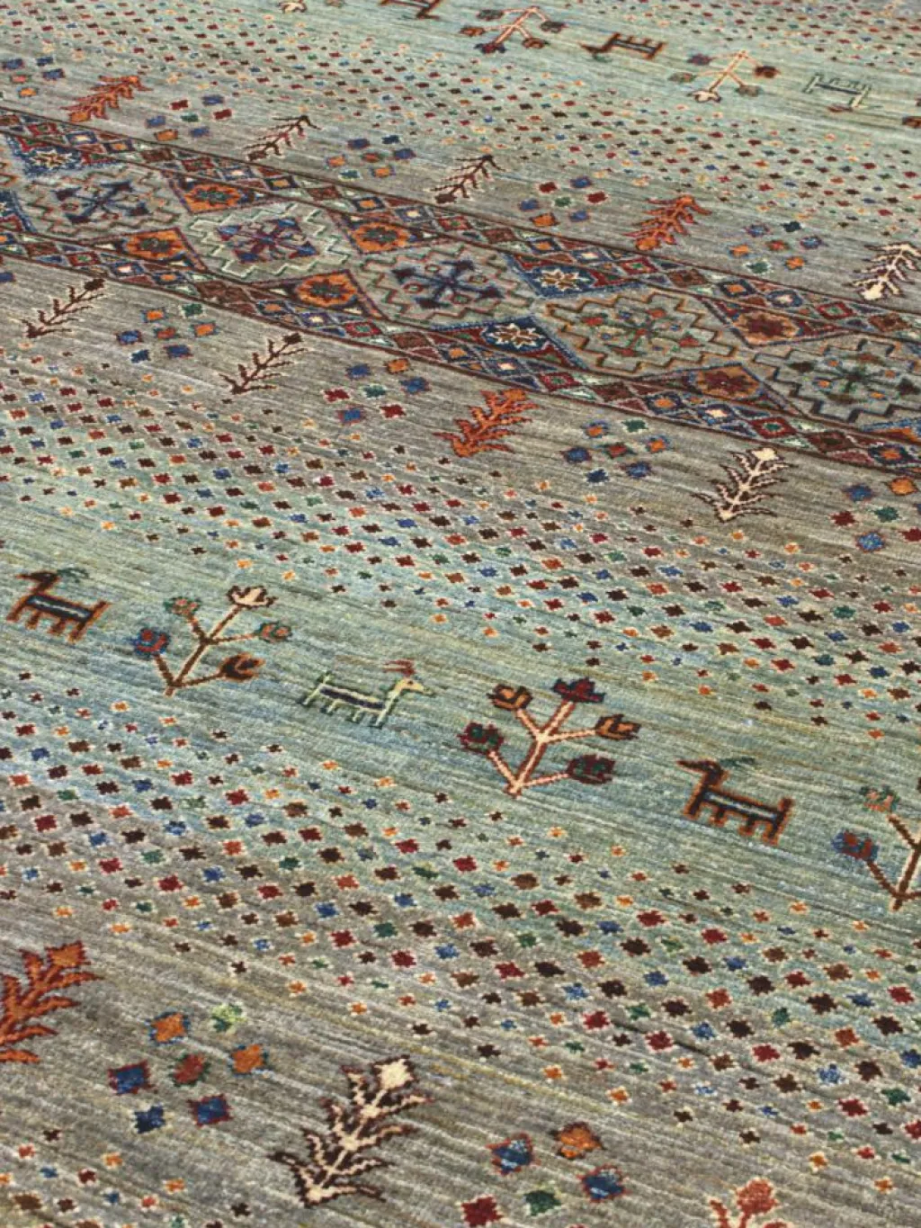 -Muster sind bunte Längsstreifen mit vielen verschiedenen Motiven gefüllt. Durch den flachen und festen Flor ist der Teppich unempfindlich gegenüber den Belastungen des Alltags. – Das Besondere an diesemOrientteppich