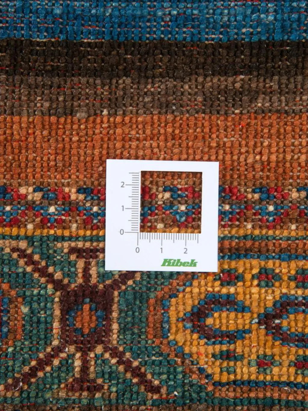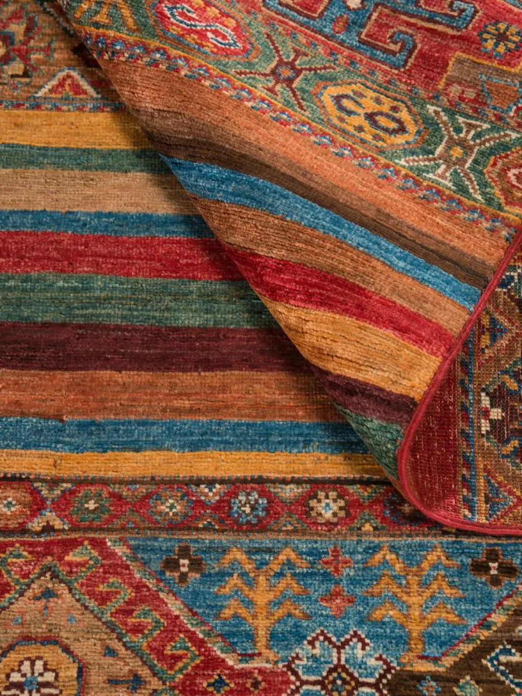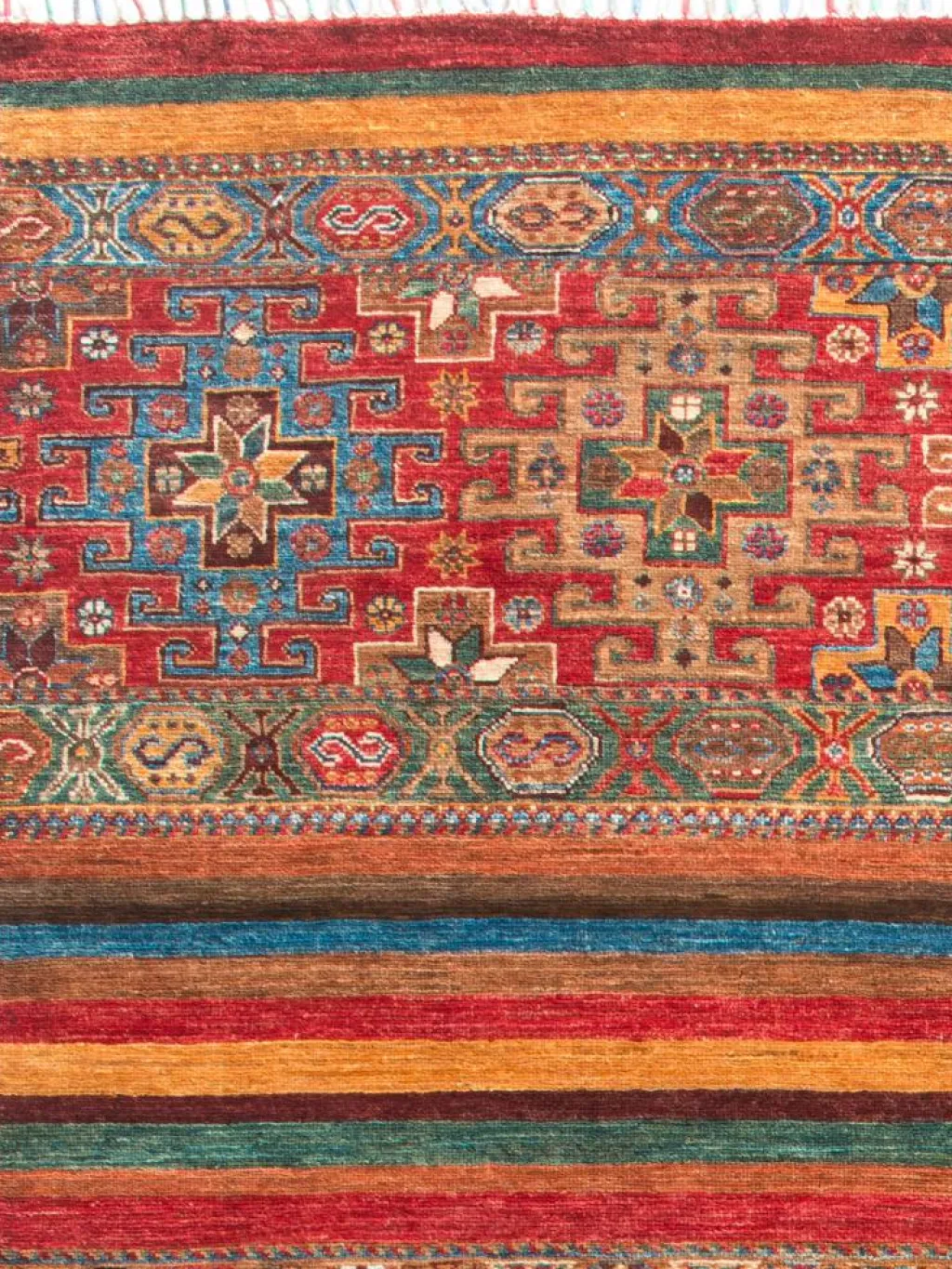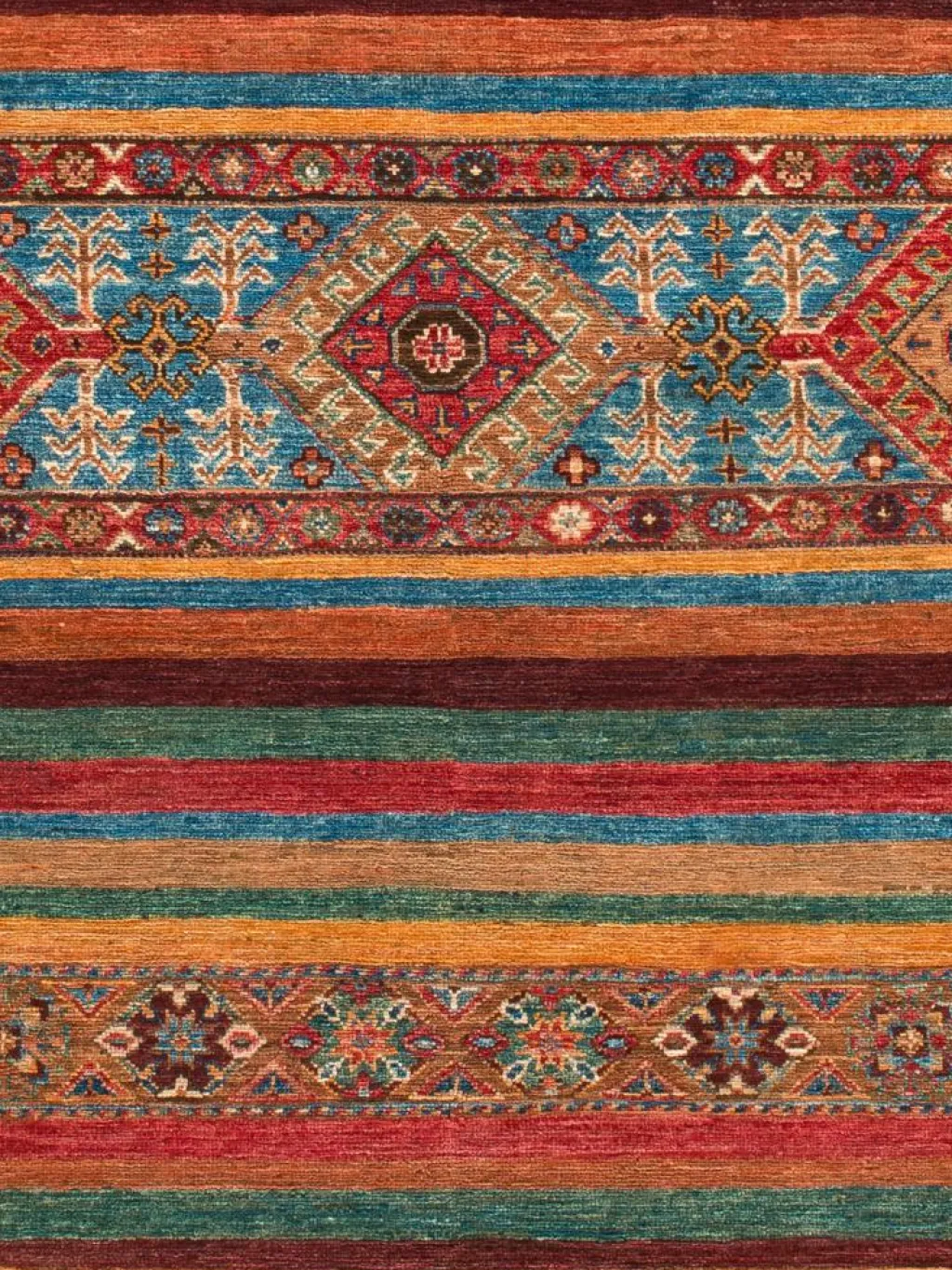 -Muster sind bunte Längsstreifen mit vielen verschiedenen Motiven gefüllt. Durch den flachen und festen Flor ist der Teppich unempfindlich gegenüber den Belastungen des Alltags.- Das Besondere an diesemOrientteppich