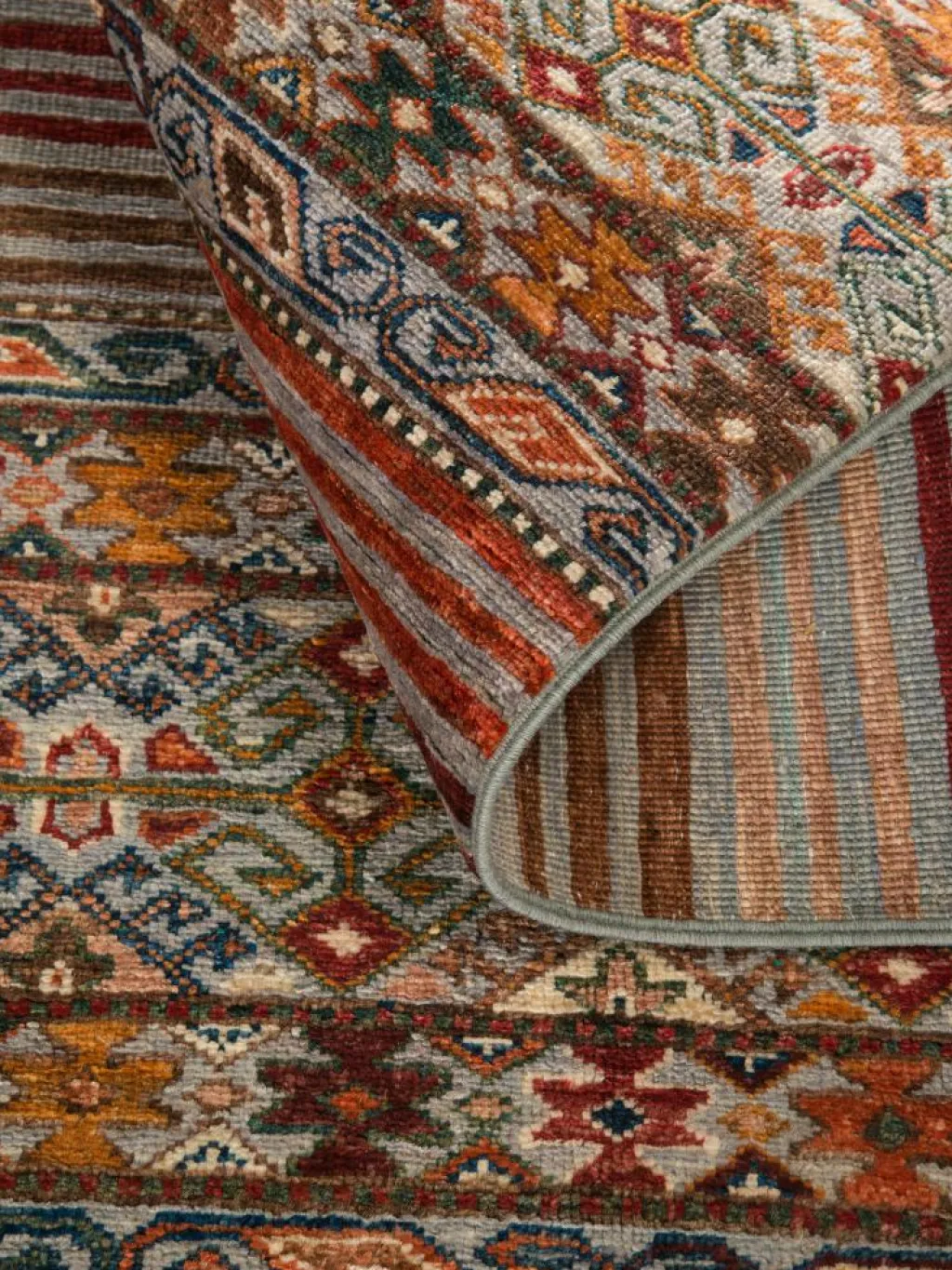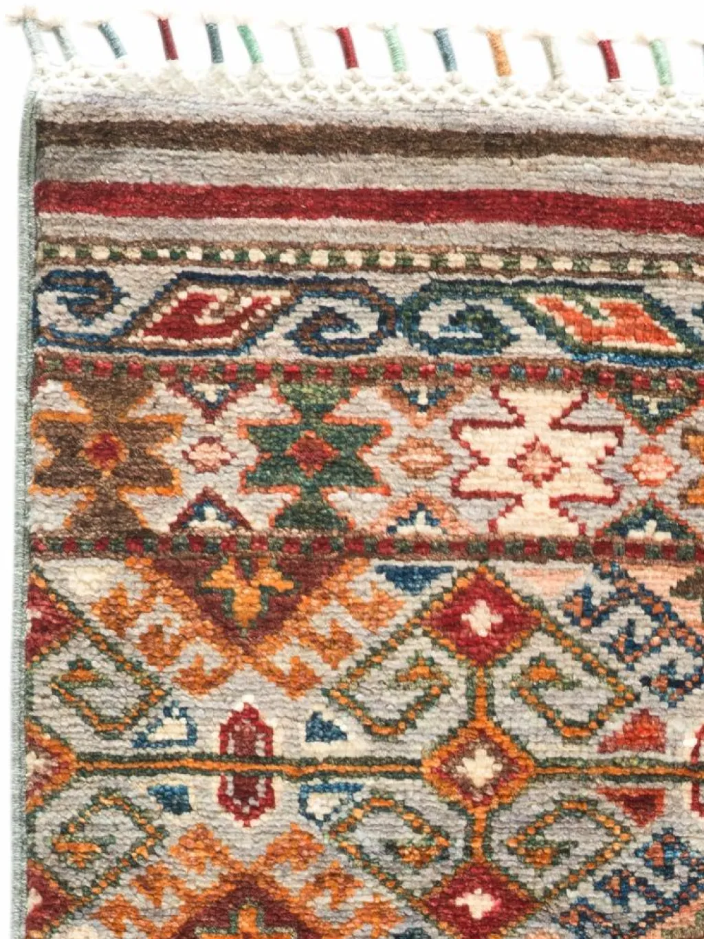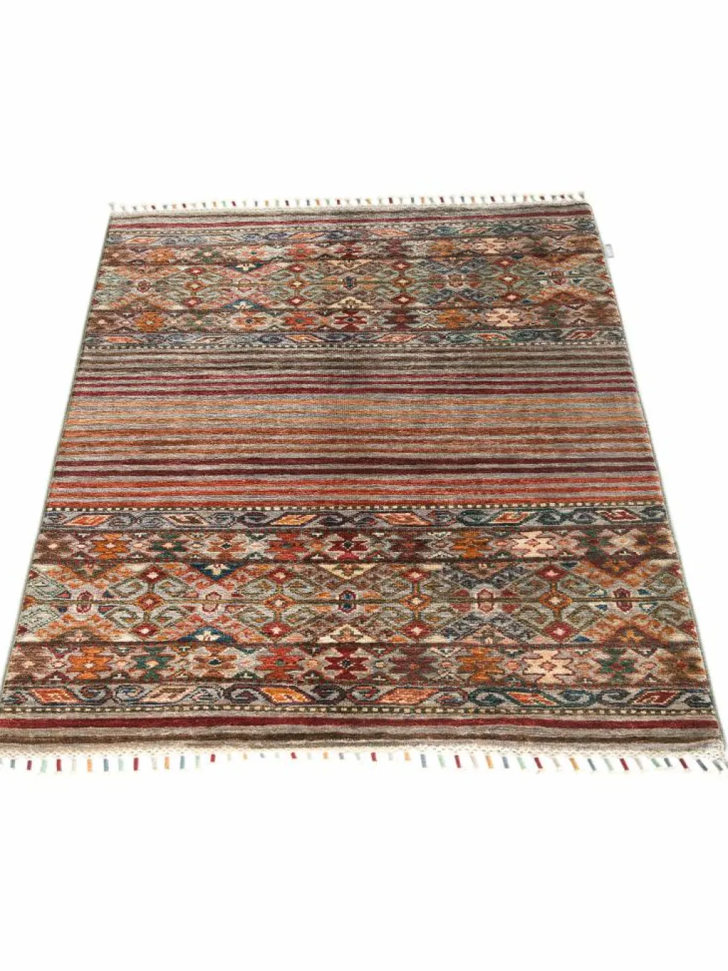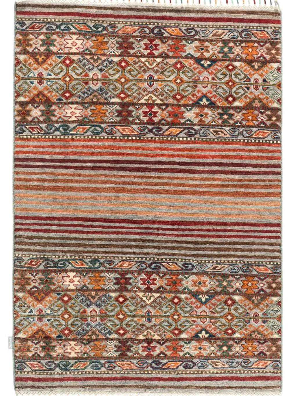 -Muster sind bunte Längsstreifen mit vielen verschiedenen Motiven gefüllt. Durch den flachen und festen Flor ist der Teppich unempfindlich gegenüber den Belastungen des Alltags.- Das Besondere an diesemOrientteppich